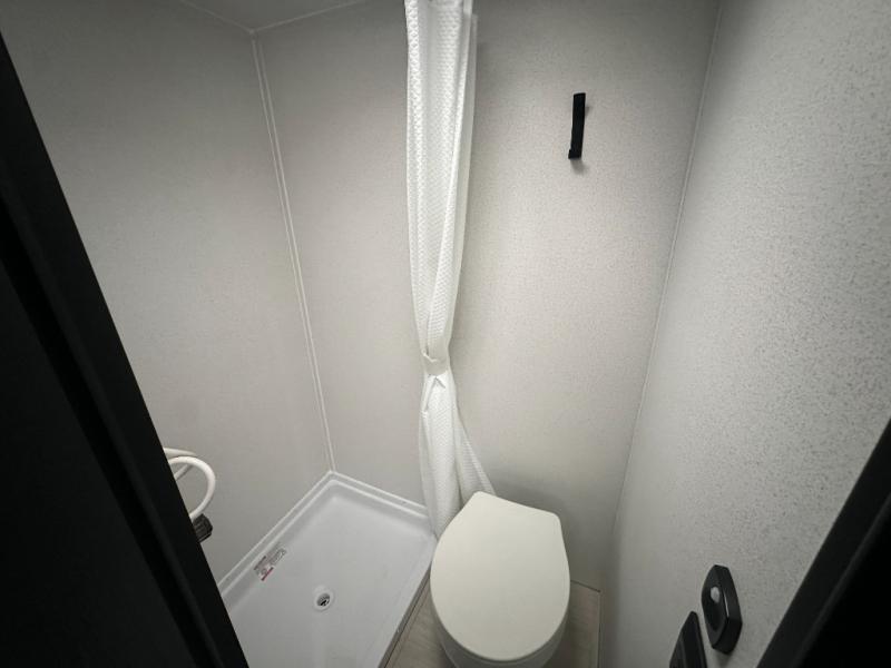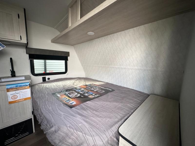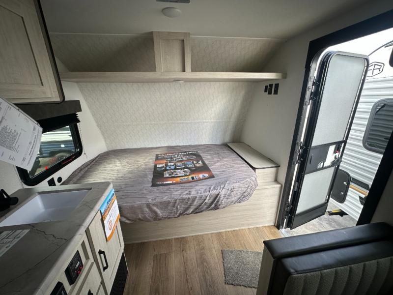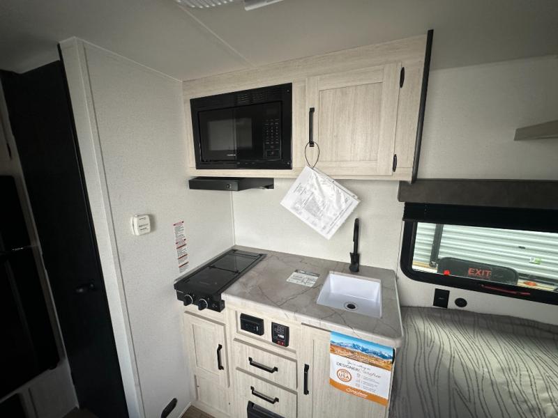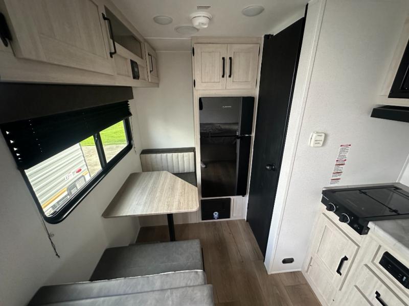 It will be so easy to enjoy camping trips in this single axle travel trailer! There is a front RV queen bed with flip-up storage at the foot of the bed for your belongings, and any additional guests can sleep on the booth dinette with an open shelf above. A full kitchen includes a stainless two burner cooktop and stainless microwave to cook meals each day, and the 4.3 cu. ft. 12V black glass refrigerator will keep your food fresh. And a private bath includes a shower with a seat for added comfort!