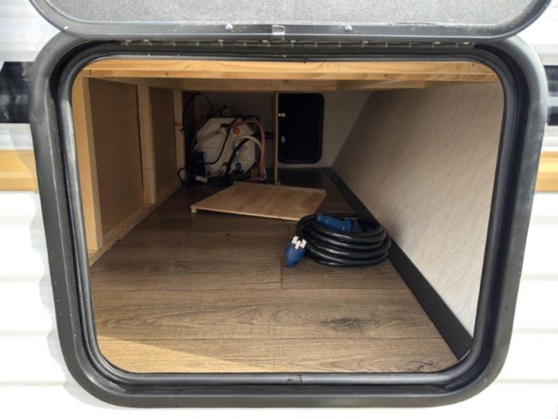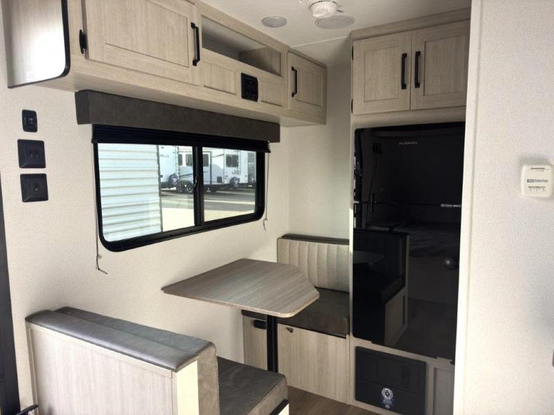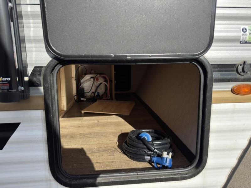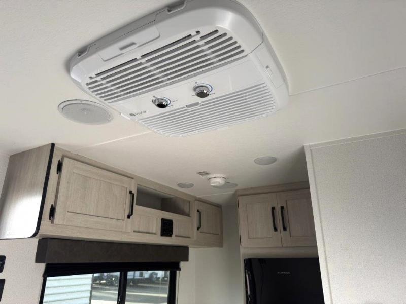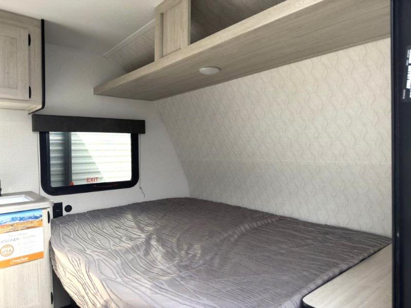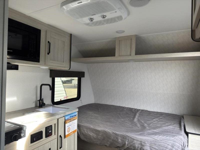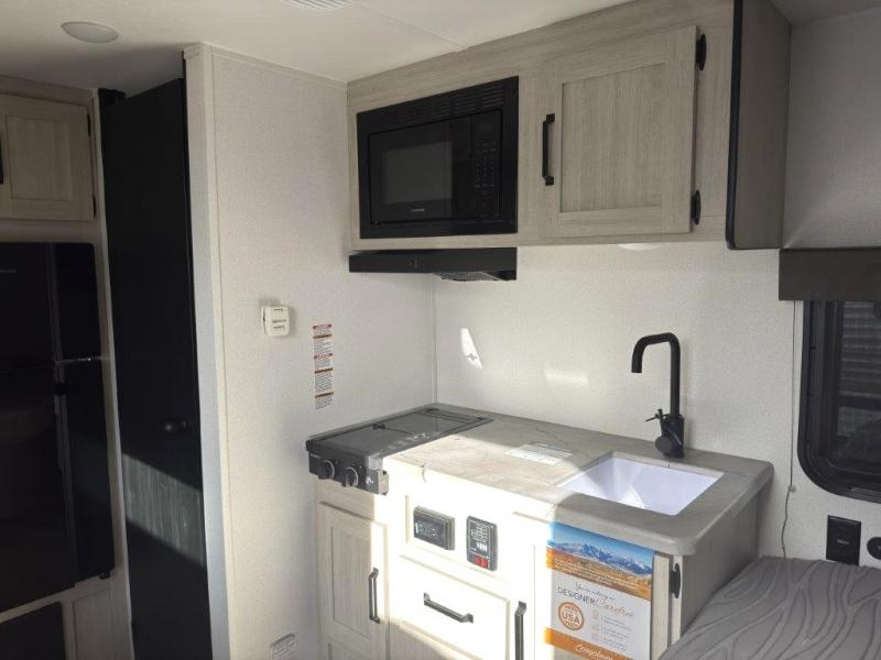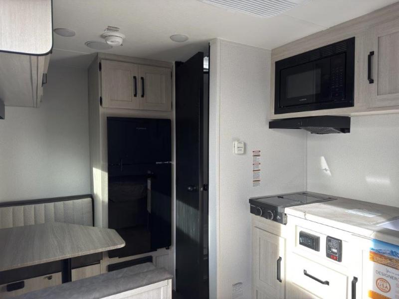 It will be so easy to enjoy camping trips in this single axle travel trailer! There is a front RV queen bed with flip-up storage at the foot of the bed for your belongings, and any additional guests can sleep on the booth dinette with an open shelf above. A full kitchen includes a stainless two burner cooktop and stainless microwave to cook meals each day, and the 4.3 cu. ft. 12V black glass refrigerator will keep your food fresh. And a private bath includes a 24" x 32" shower to clean off after a day outdoors!