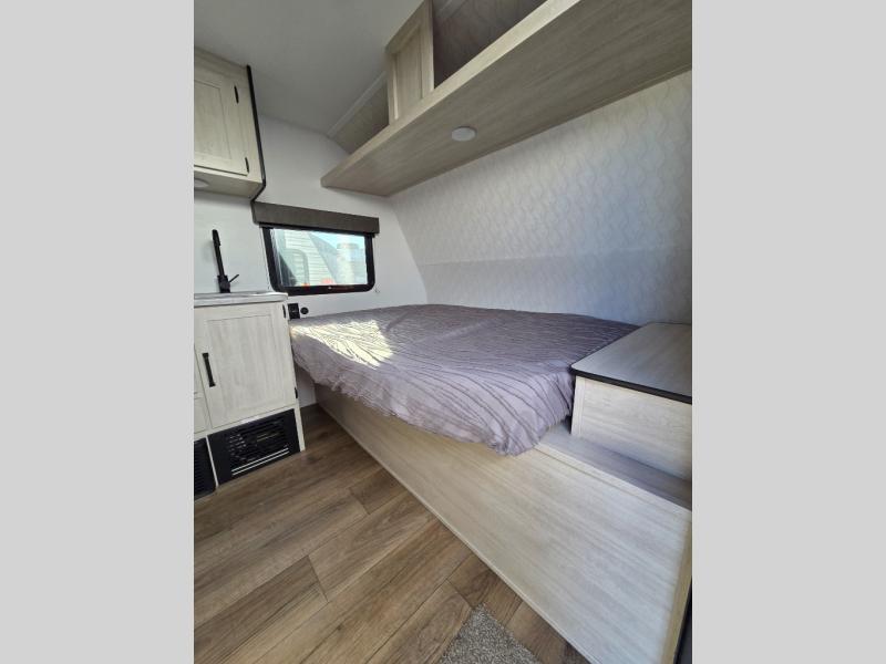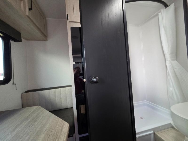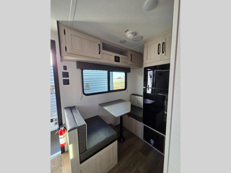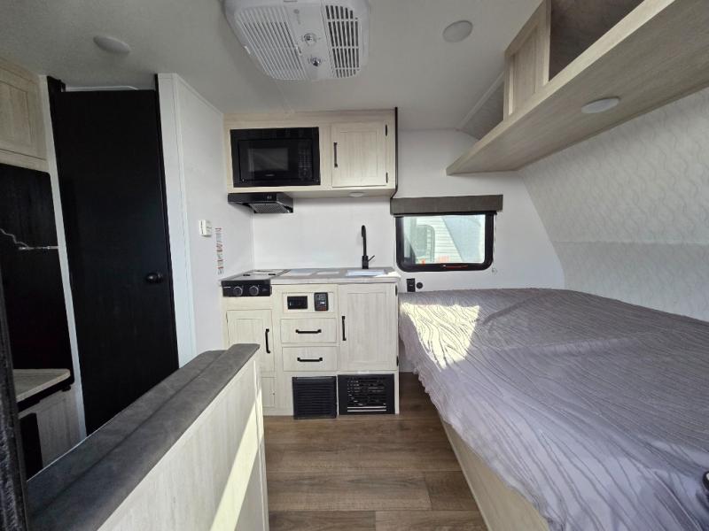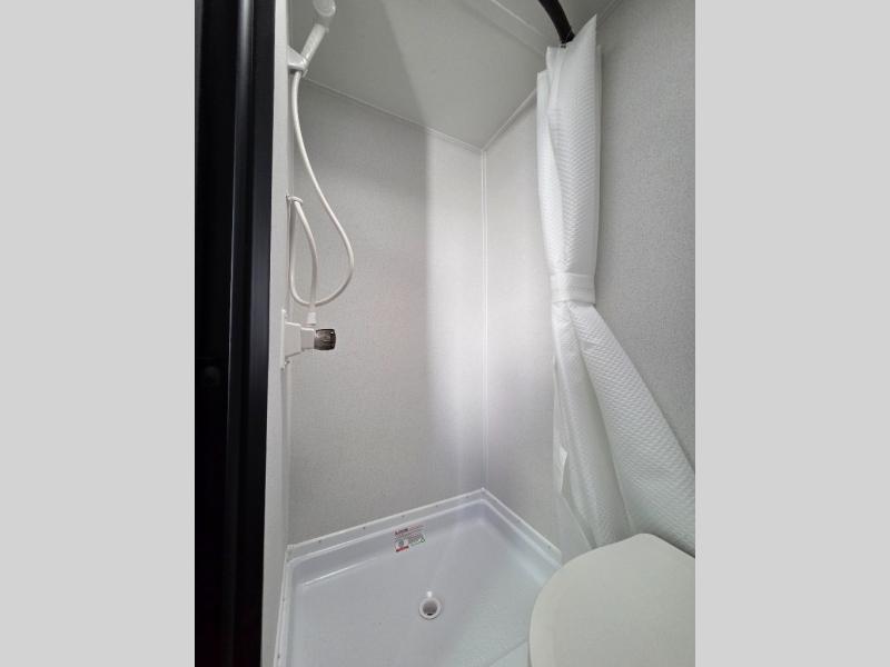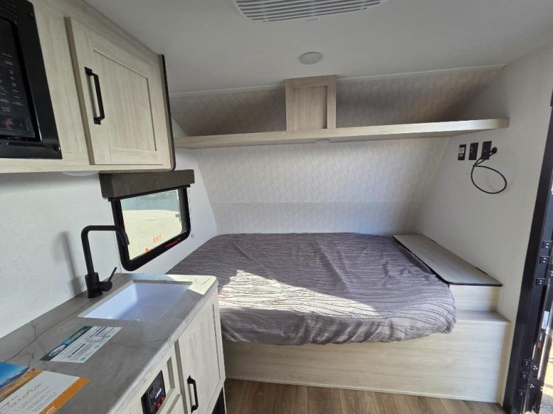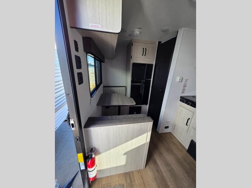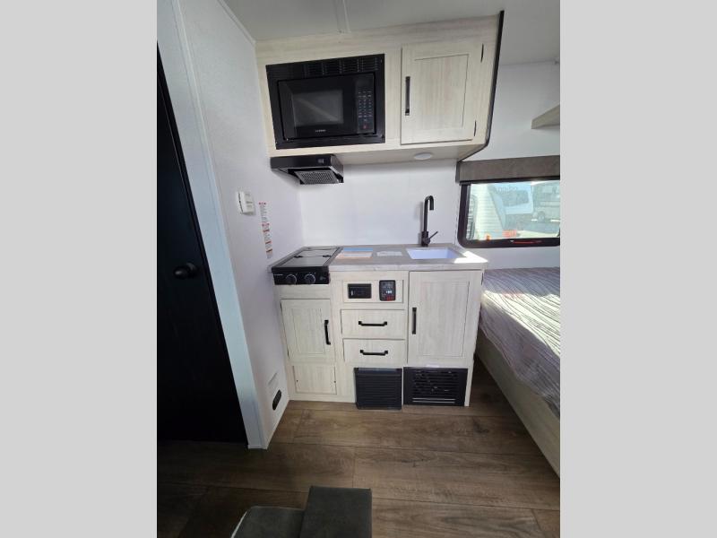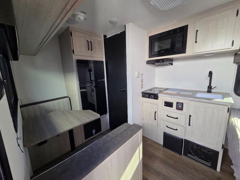 It will be so easy to enjoy camping trips in this single axle travel trailer! There is a front RV queen bed with flip-up storage at the foot of the bed for your belongings, and any additional guests can sleep on the booth dinette with an open shelf above. A full kitchen includes a stainless two burner cooktop and stainless microwave to cook meals each day, and the 4.3 cu. ft. 12V black glass refrigerator will keep your food fresh. And a private bath includes a 24" x 32" shower to clean off after a day outdoors!
