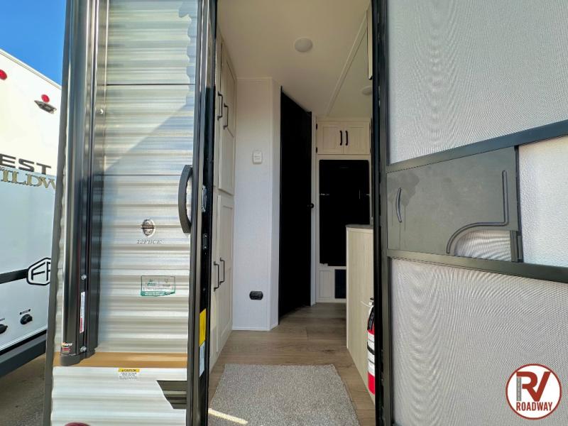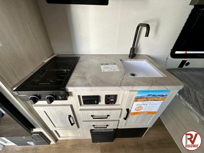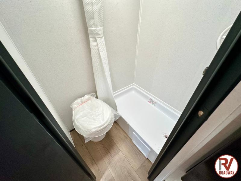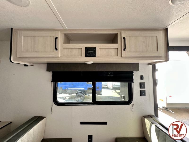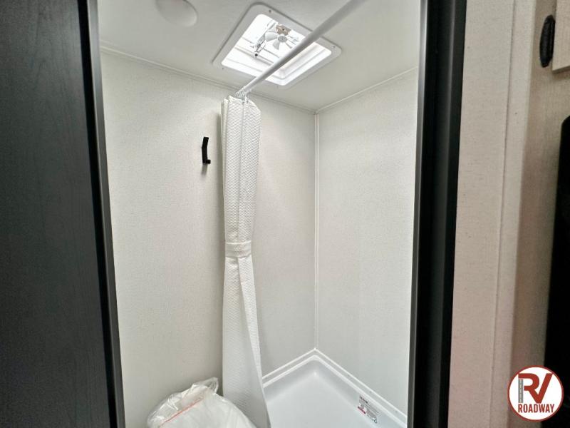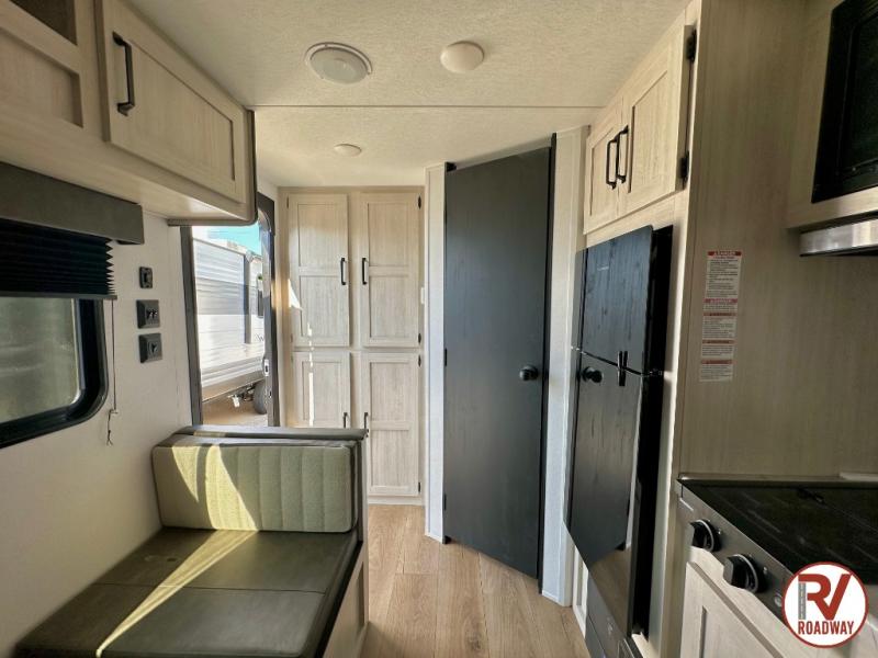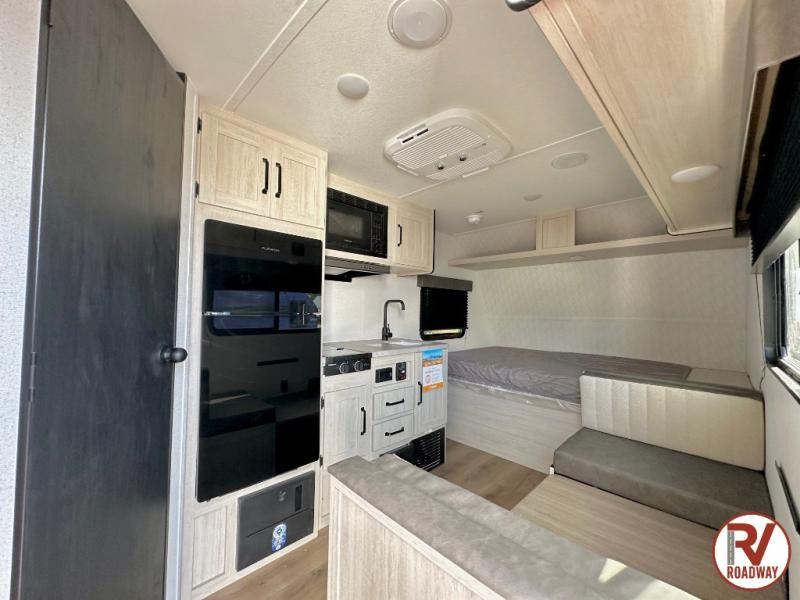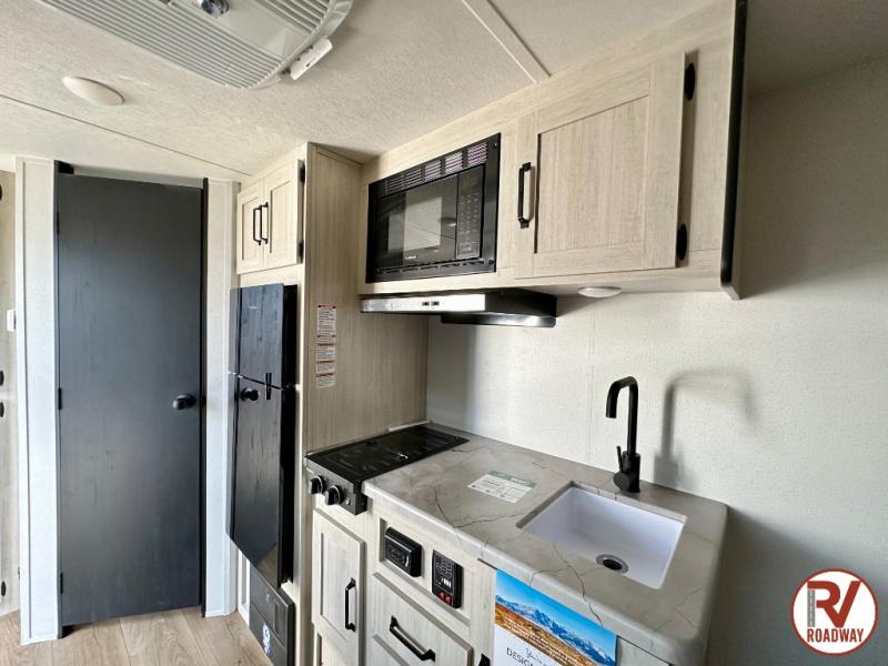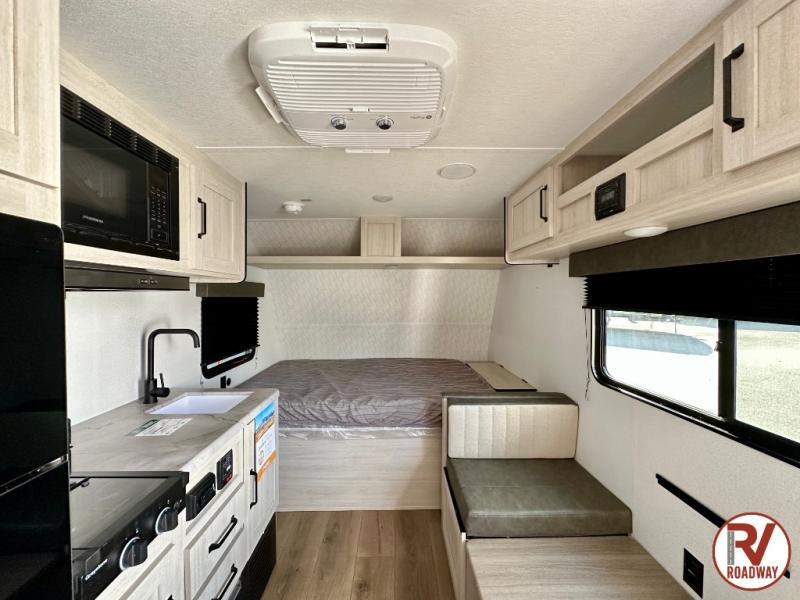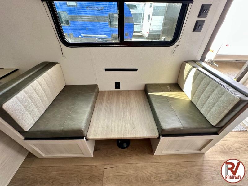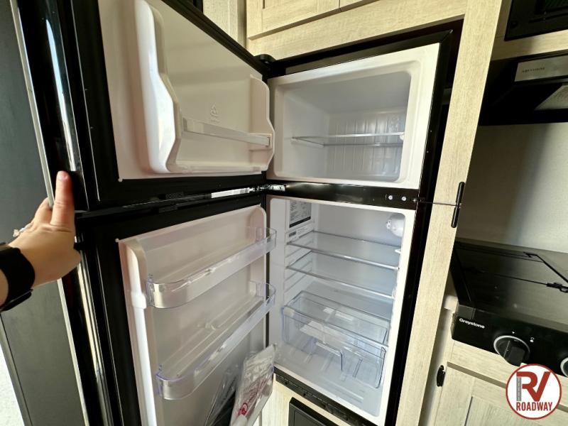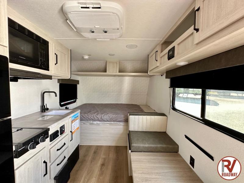 It will be so easy to enjoy camping trips in this single axle travel trailer! There is a front RV queen bed with flip-up storage at the foot of the bed for your belongings, and an additional guest or two little ones can sleep on the booth dinette when it's not being used to dine at. A full kitchen includes a stainless two burner cooktop and stainless microwave to cook meals each day, and the 4.3 cu. ft. 12V black glass refrigerator will keep your food fresh. And a private bath with a toilet and shower will let you freshen up without having to use the camp's facilities!