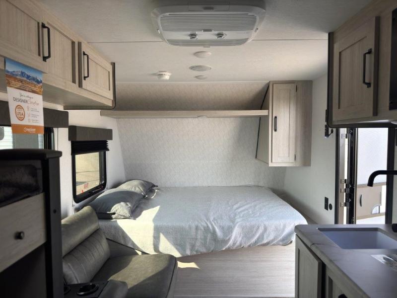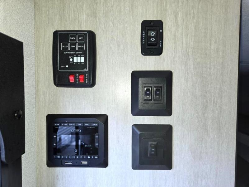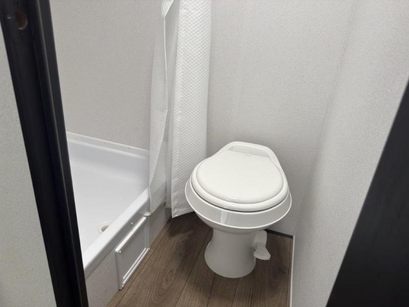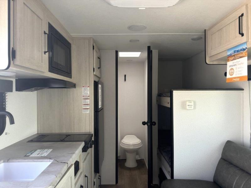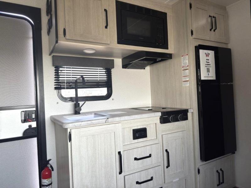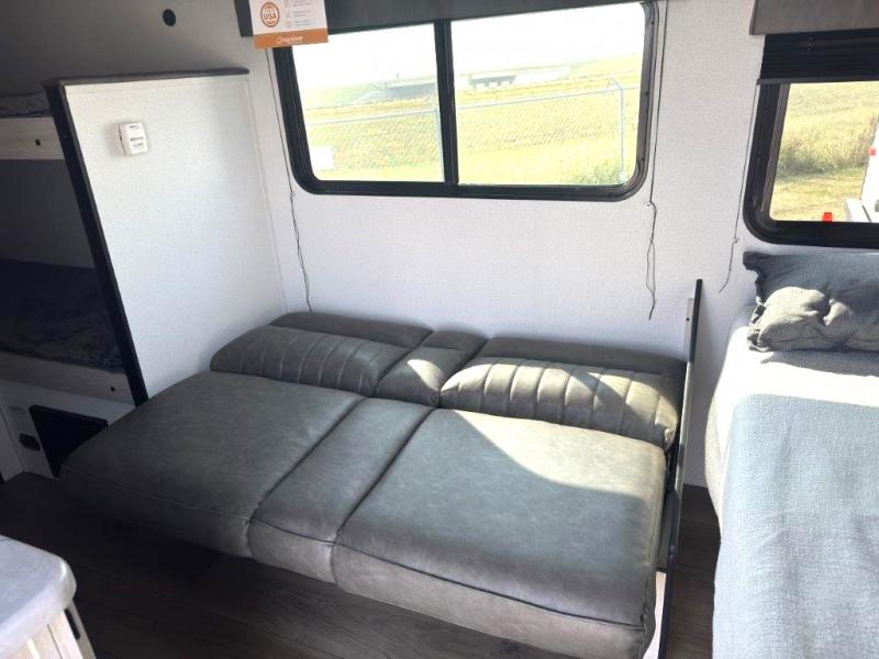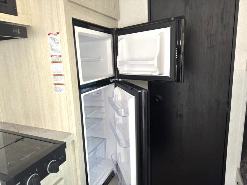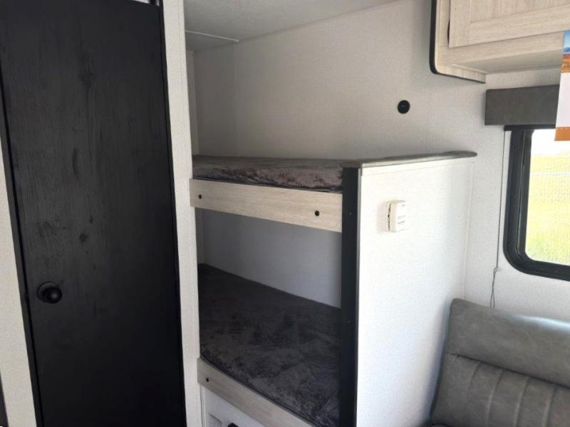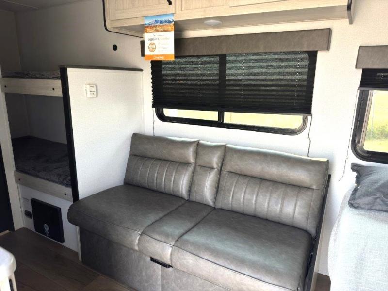 It will be so easy to enjoy camping trips in this single axle travel trailer! There is a front RV queen bed with flip-up storage at the foot of the bed for your belongings, and any additional guests can sleep on the bunk beds and sofa. A full kitchen includes a stainless two burner cooktop and stainless microwave to cook meals each day, and the 4.3 cu. ft. 12V black glass refrigerator will keep your food fresh. And a private bath with a toilet and shower will let you freshen up without having to use the camp's facilities!