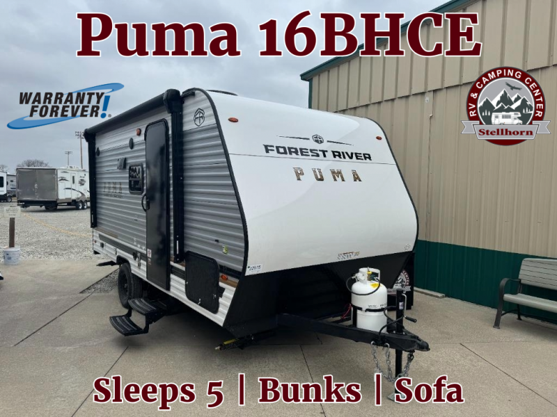 The Puma Camping Edition by Palomino offer an affordable travel trailer for rookie campers or seasoned RVers! They are built with 5/8" tongue and groove plywood flooring and a front diamond plate for added protection. There are also exterior clamp style door latches, back up camera prep, and 20 lb. LP bottles. Head inside to find Thermofoil countertops with a smooth drop edge, bedroom USB ports and outlets, and a GE appliance and kitchen package.