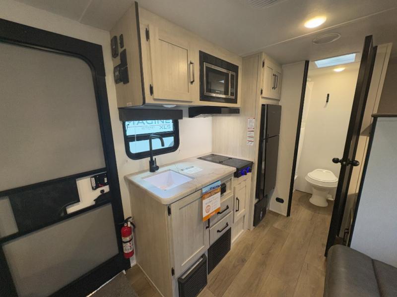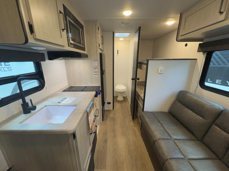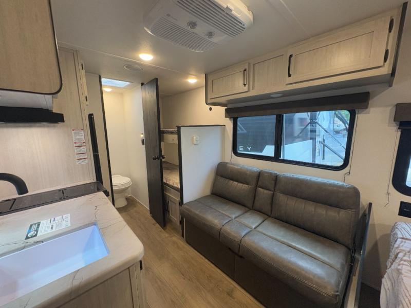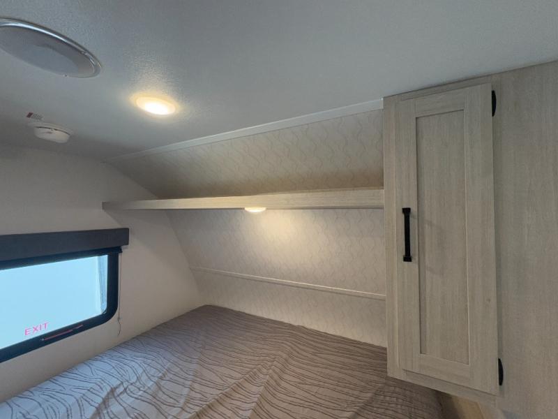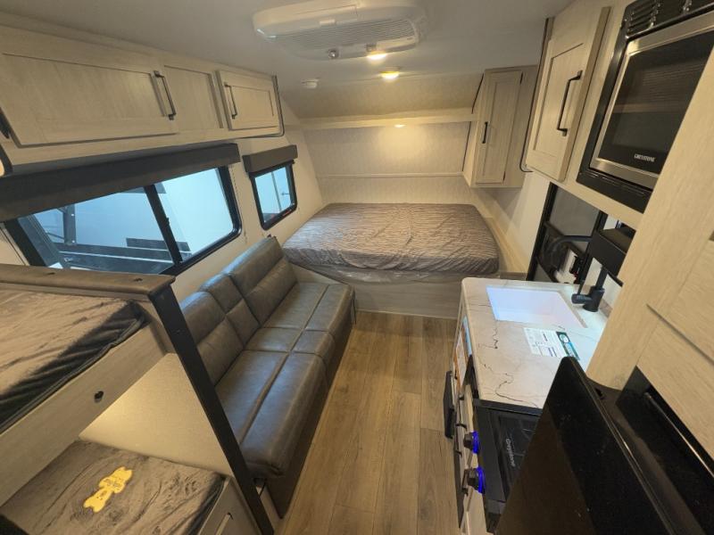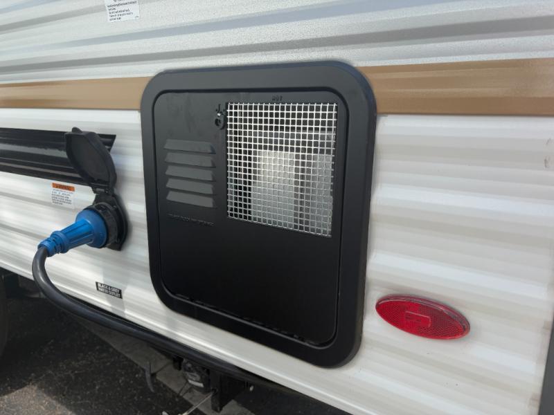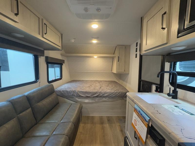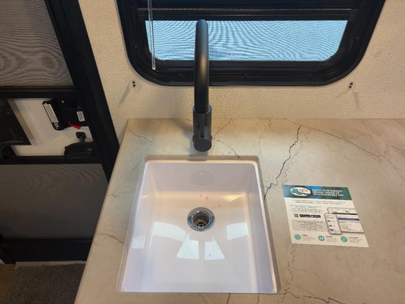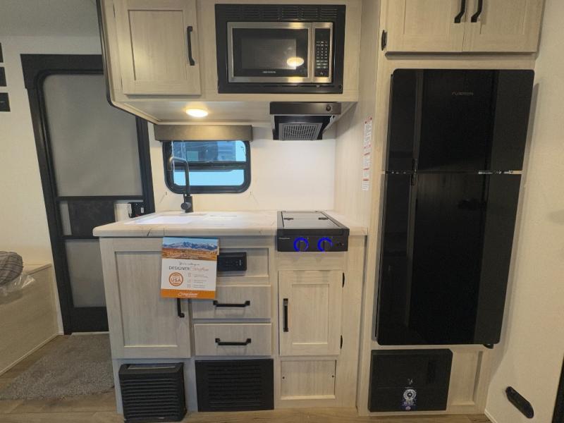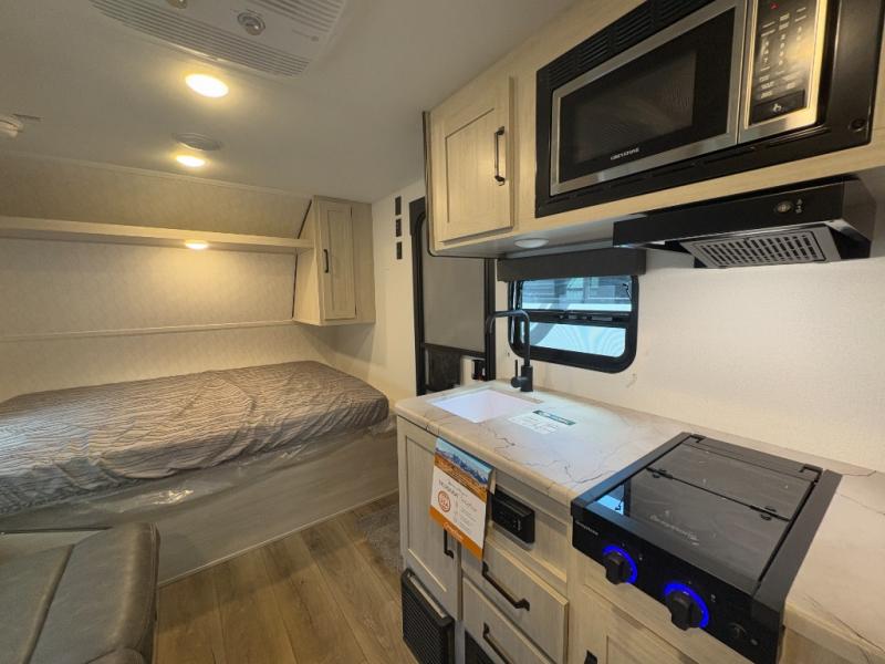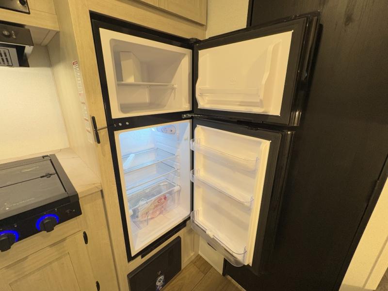 Perfect for rookie campers or seasoned RVers, this model is designed with practicality and affordability in mind. Inside, you'll find Thermofoil countertops with a smooth drop edge, USB ports and outlets for charging your devices, and a GE appliance and kitchen package for modern convenience. Lightweight and easy to tow, this travel trailer is ready to hit the road and create unforgettable memories.