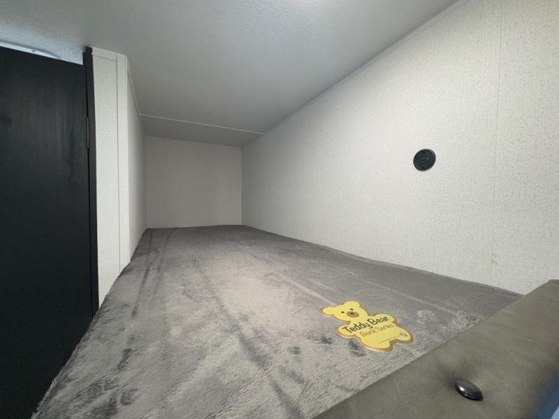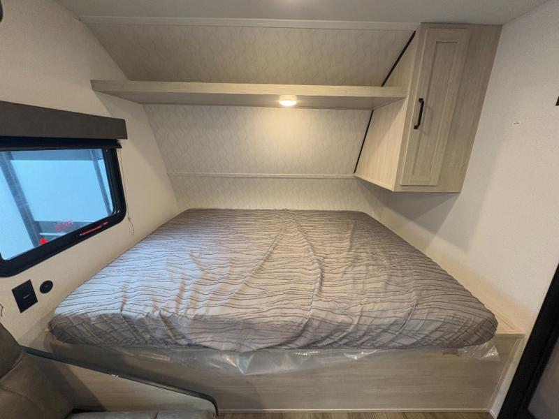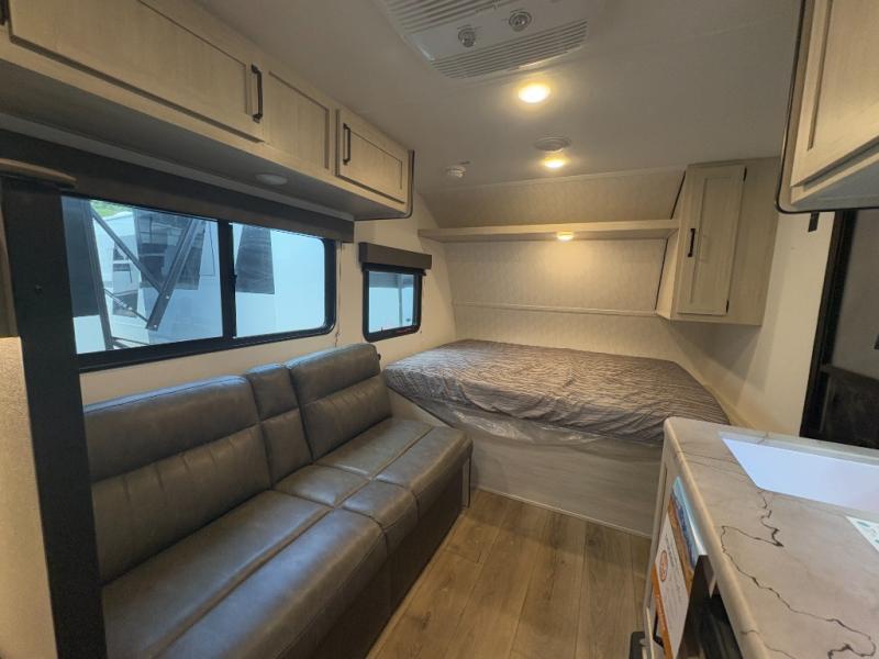 - Comfortable Sleeping Arrangements: A front RV queen bed with a bedside shirt closet and overhead shelf for storage, plus a booth dinette that can sleep one adult or two little ones.