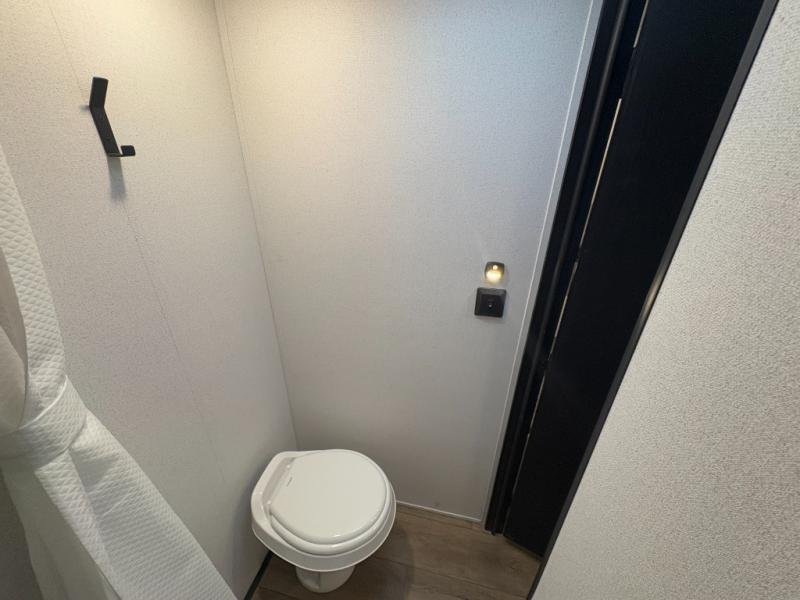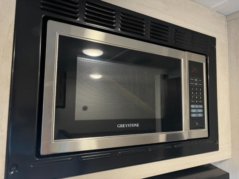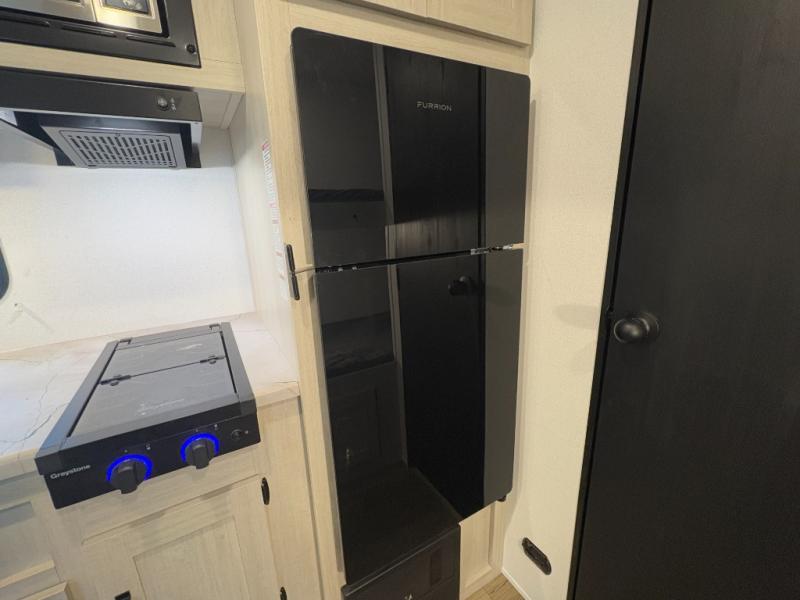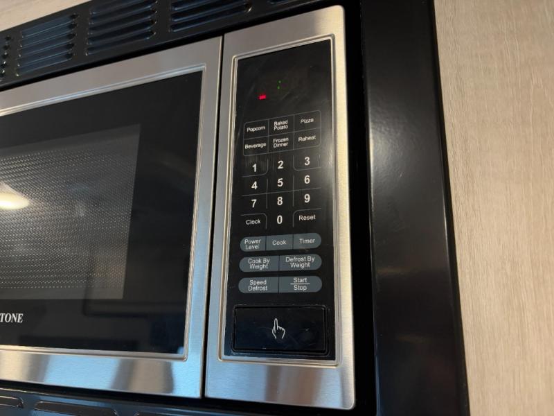 - Fully Equipped Kitchen: Includes a stainless steel two-burner cooktop, a stainless steel microwave, and a 4.3 cu. ft. 12V black glass refrigerator to keep your meals fresh and ready.