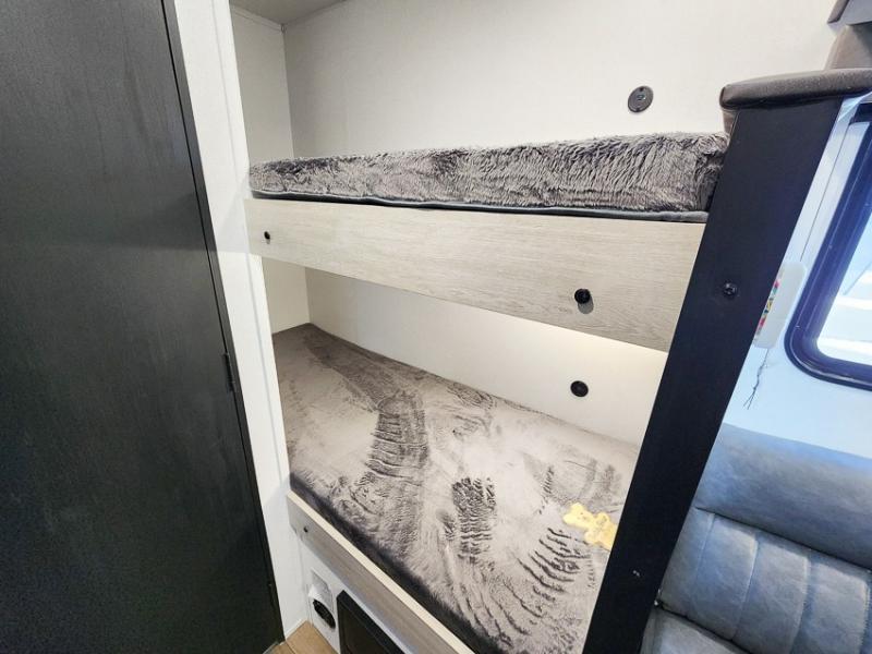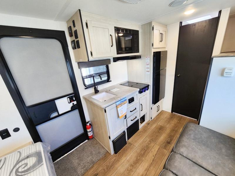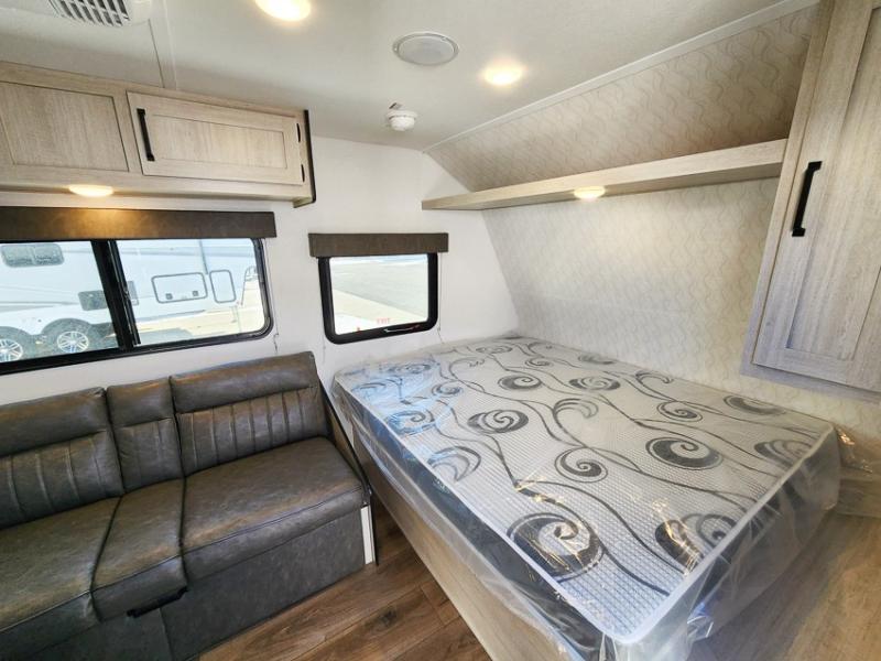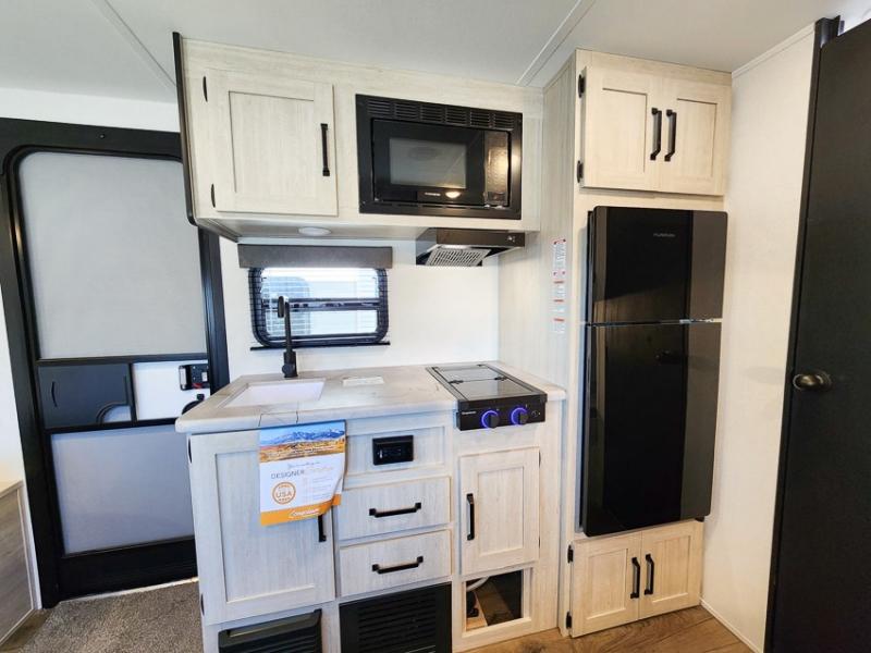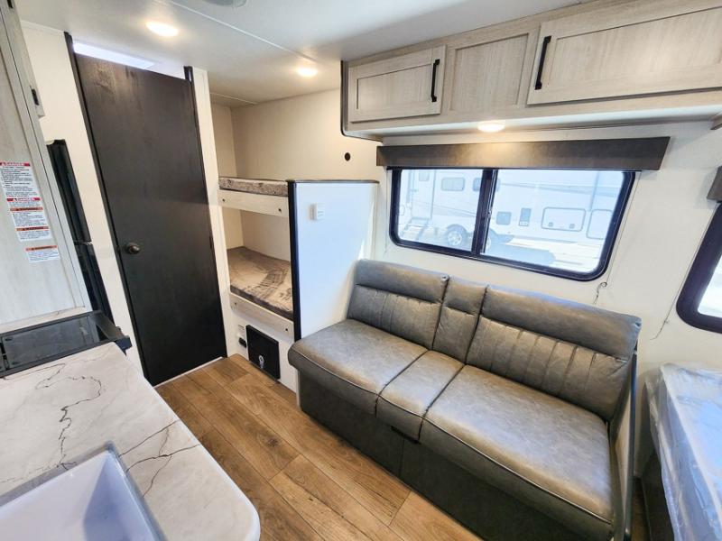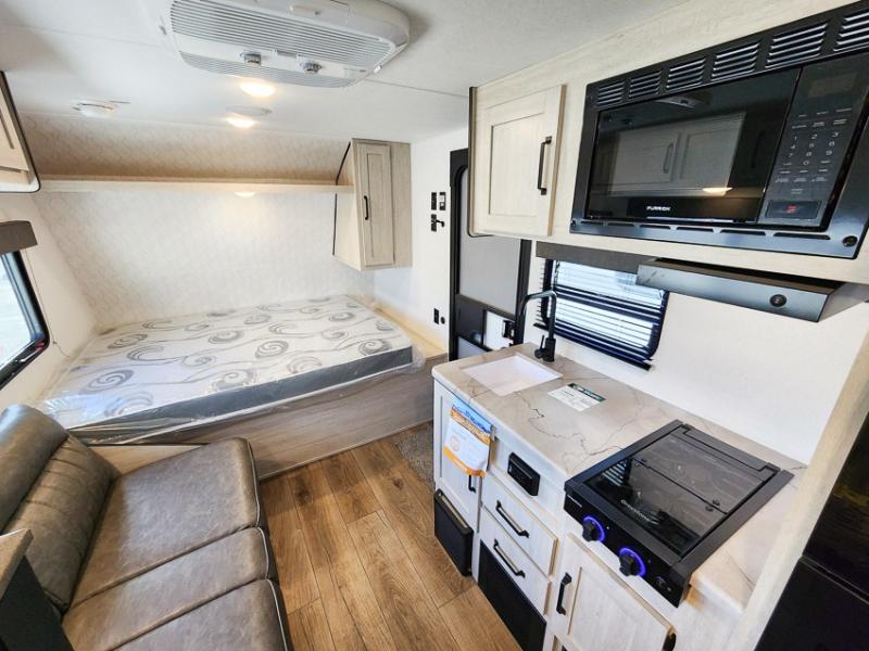 It will be so easy to enjoy camping trips in this single axle travel trailer! There is a front RV queen bed with flip-up storage at the foot of the bed for your belongings, and any additional guests can sleep on the bunk beds and sofa. A full kitchen includes a stainless two burner cooktop and stainless microwave to cook meals each day, and the 4.3 cu. ft. 12V black glass refrigerator will keep your food fresh. And a private bath with a toilet and shower will let you freshen up without having to use the camp's facilities!