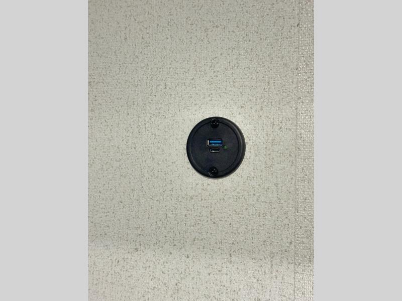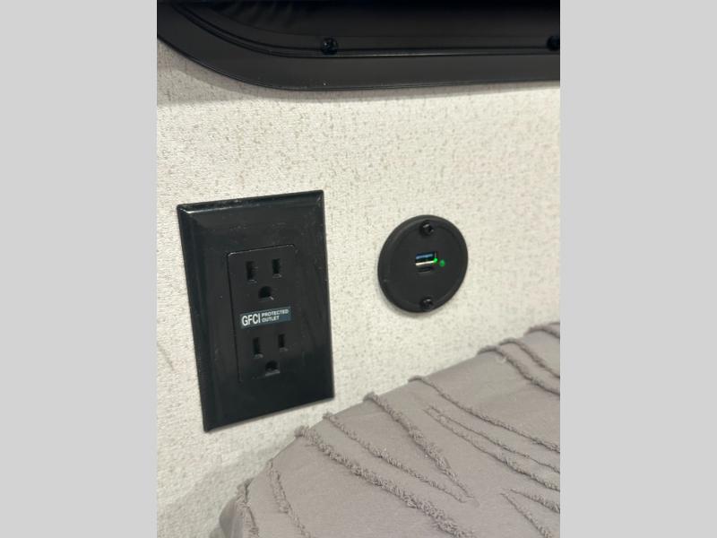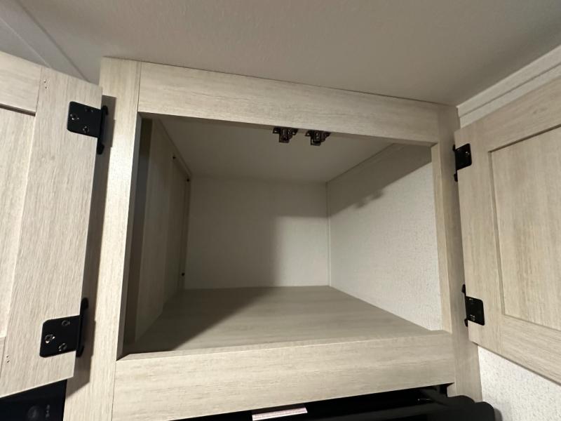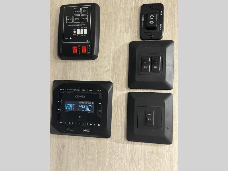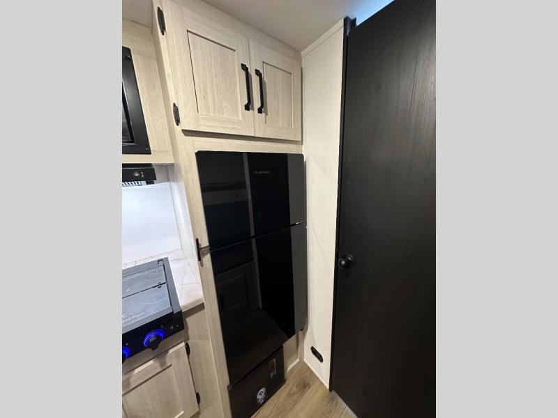 Kitchen: 2-burner stainless cooktop, stainless microwave, 12V 4.3 cu ft “black glass” refrigerator.