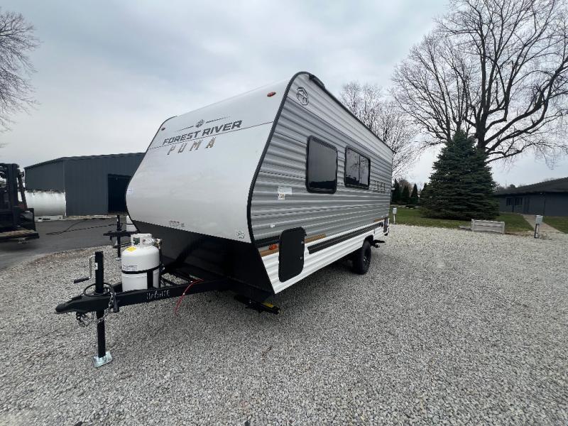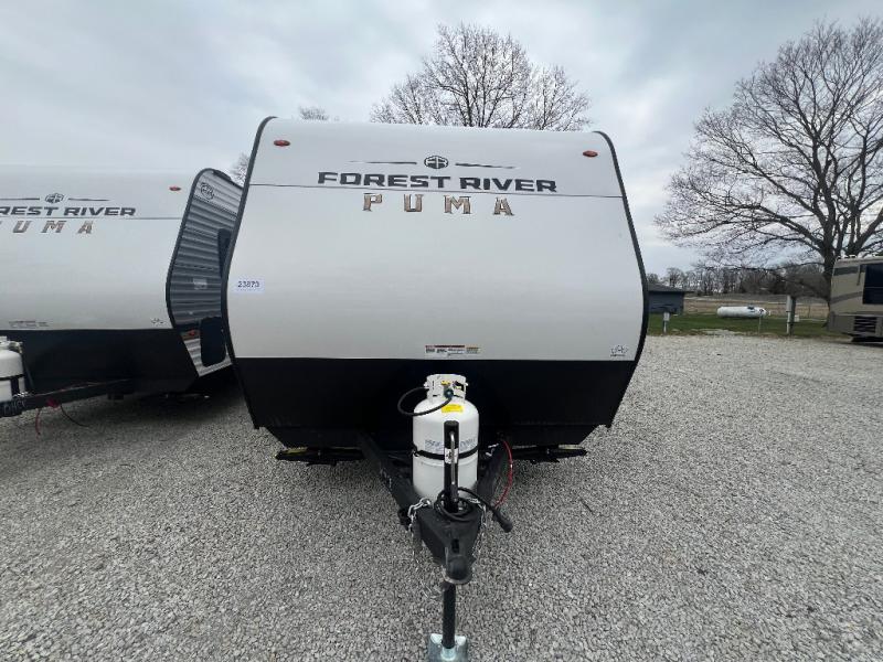 The Puma Camping Edition by Palomino offer an affordable travel trailer for rookie campers or seasoned RVers! They are built with 5/8" tongue and groove plywood flooring and a front diamond plate for added protection. There are also exterior clamp style door latches, back up camera prep, and 20 lb. LP bottles. Head inside to find Thermofoil countertops with a smooth drop edge, bedroom USB ports and outlets, and a GE appliance and kitchen package.