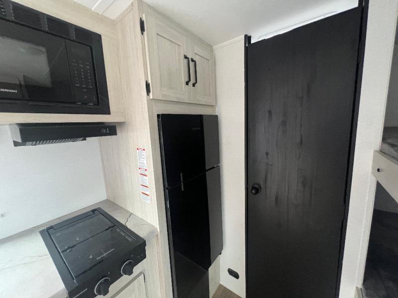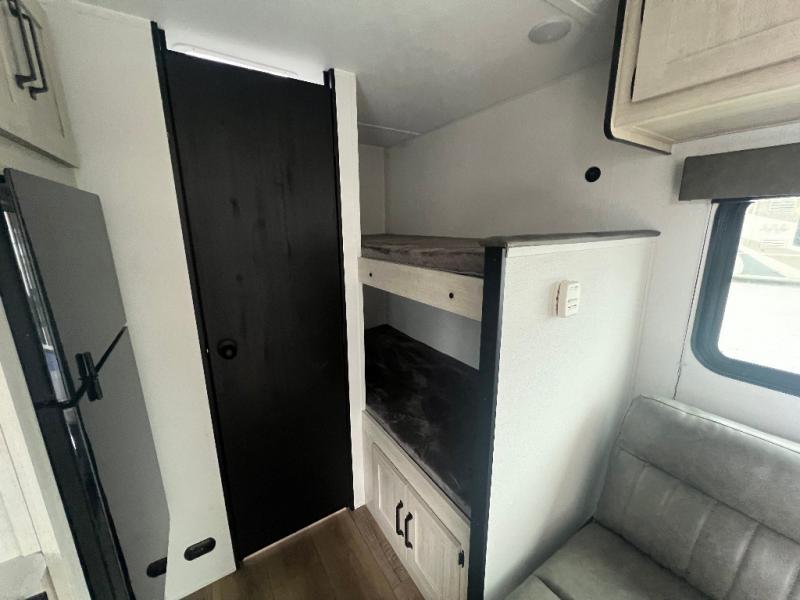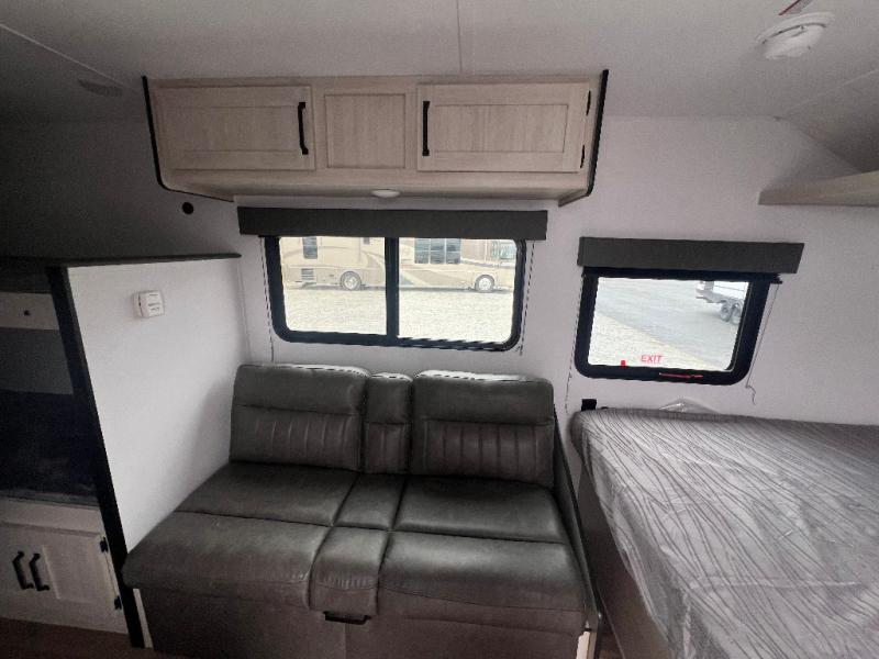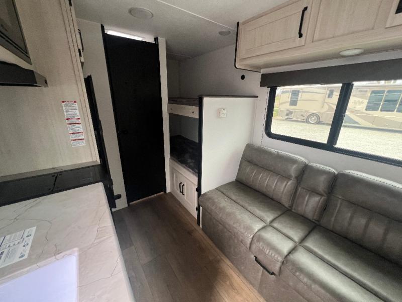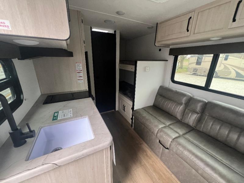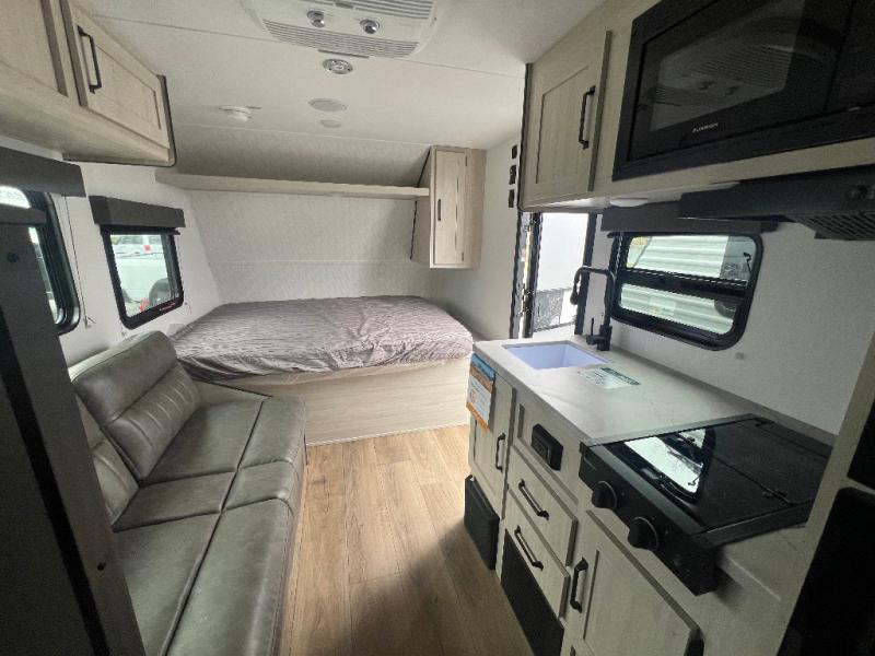 It will be so easy to enjoy camping trips in this single axle travel trailer! There is a front RV queen bed with flip-up storage at the foot of the bed for your belongings, and any additional guests can sleep on the bunk beds and sofa. A full kitchen includes a stainless two burner cooktop and stainless microwave to cook meals each day, and the 4.3 cu. ft. 12V black glass refrigerator will keep your food fresh. And a private bath with a toilet and shower will let you freshen up without having to use the camp's facilities!