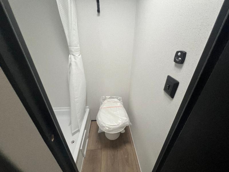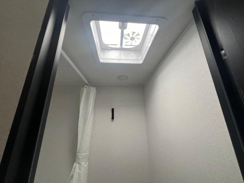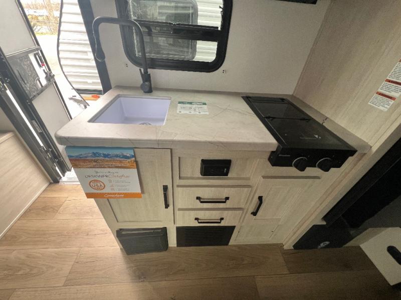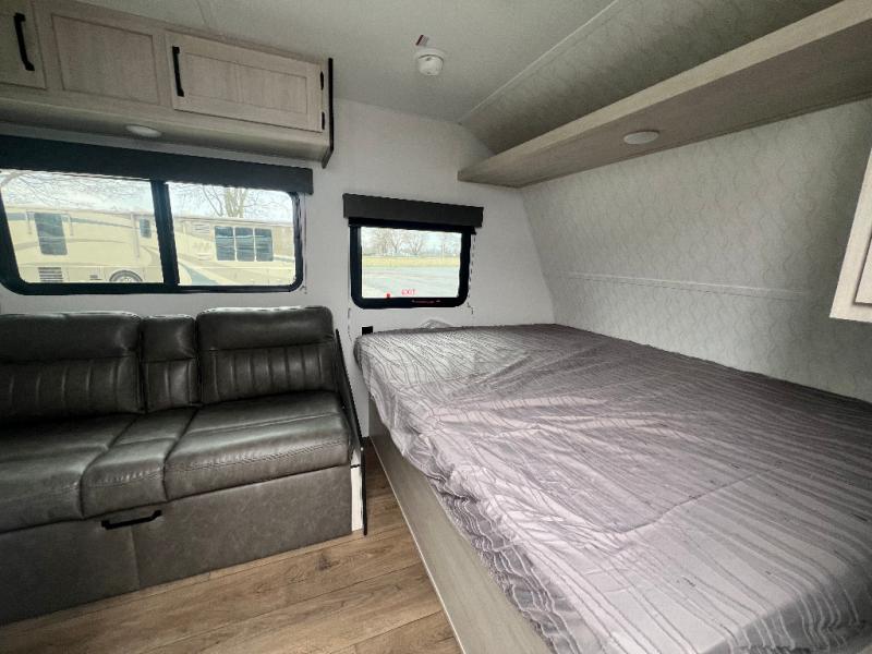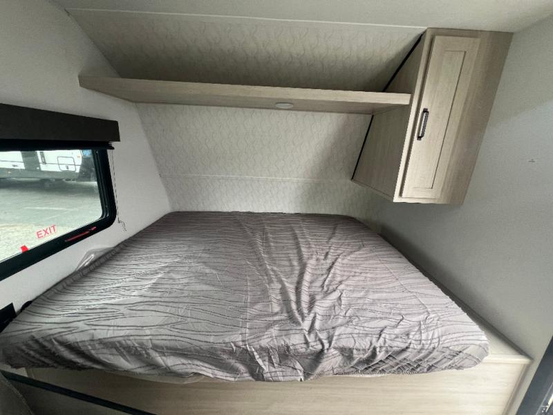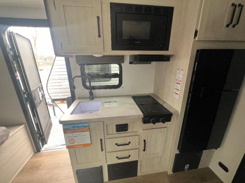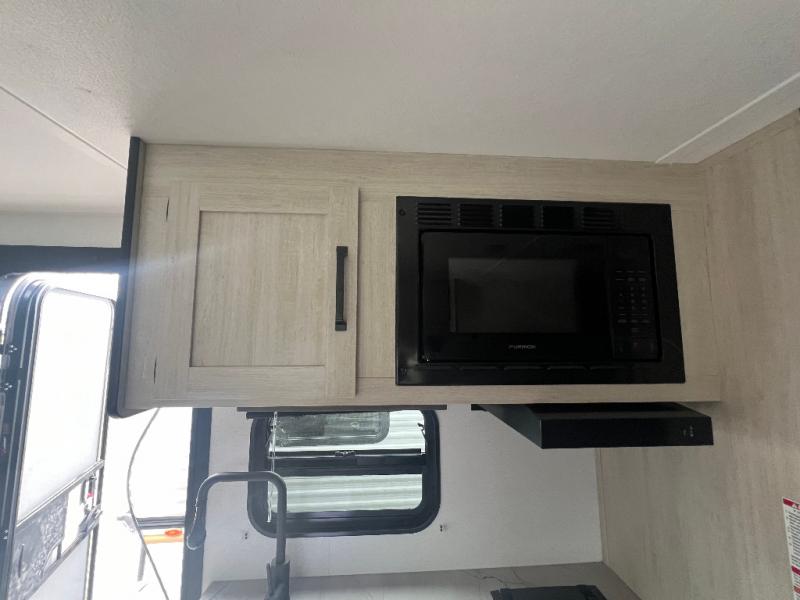 It will be so easy to enjoy camping trips in this single axle travel trailer! There is a front RV queen bed with flip-up storage at the foot of the bed for your belongings, and any additional guests can sleep on the bunk beds and sofa. A full kitchen includes a stainless two burner cooktop and stainless microwave to cook meals each day, and the 4.3 cu. ft. 12V black glass refrigerator will keep your food fresh. And a private bath with a toilet and shower will let you freshen up without having to use the camp's facilities!