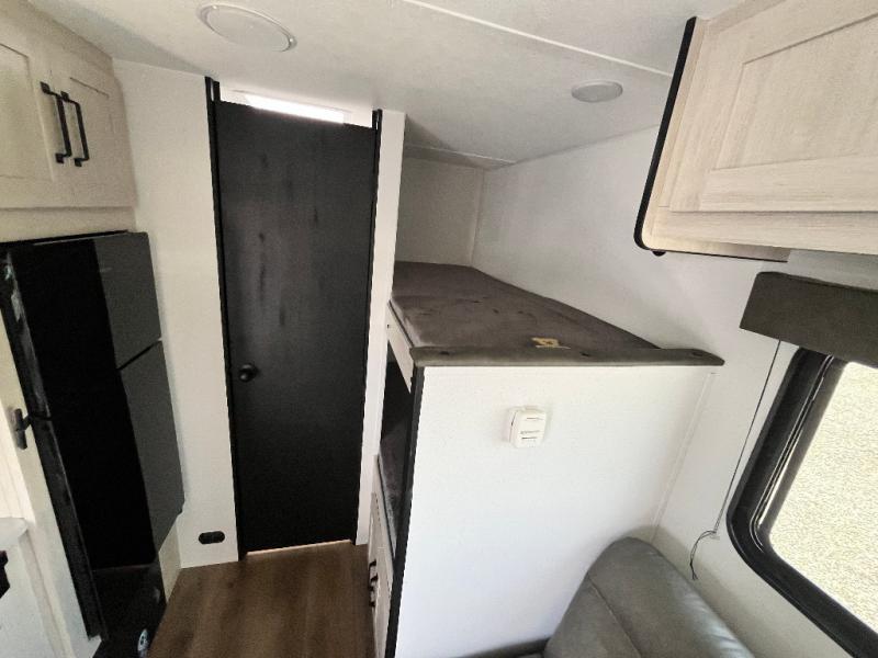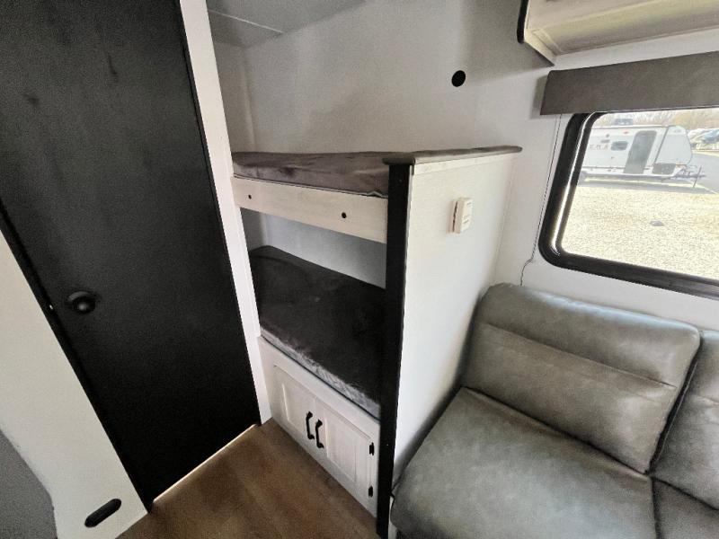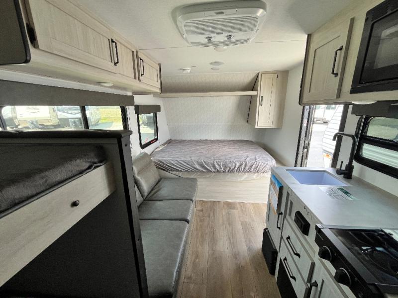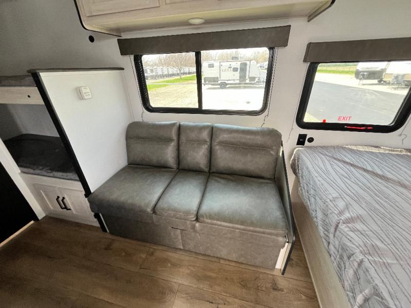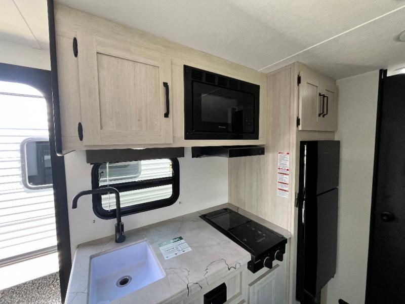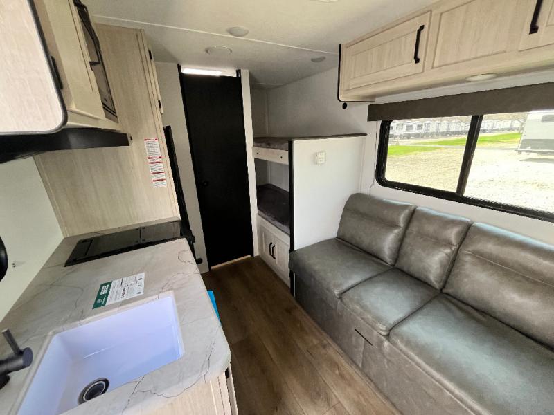 It will be so easy to enjoy camping trips in this single axle travel trailer! There is a front RV queen bed with flip-up storage at the foot of the bed for your belongings, and any additional guests can sleep on the bunk beds and sofa. A full kitchen includes a stainless two burner cooktop and stainless microwave to cook meals each day, and the 4.3 cu. ft. 12V black glass refrigerator will keep your food fresh. And a private bath with a toilet and shower will let you freshen up without having to use the camp's facilities!