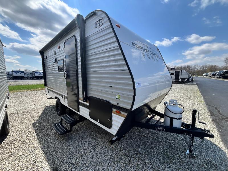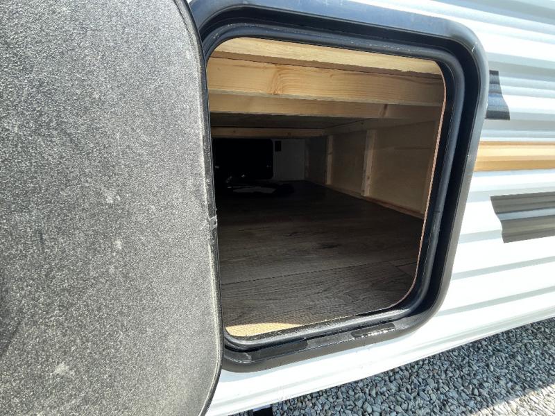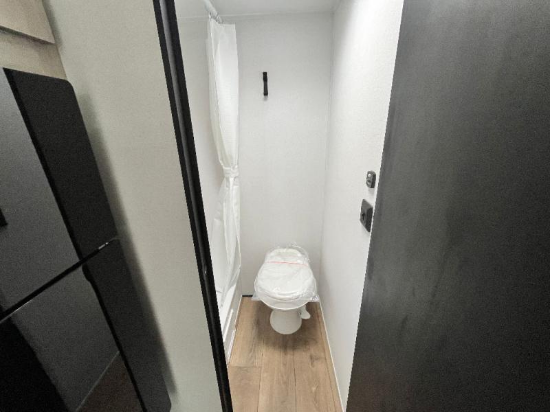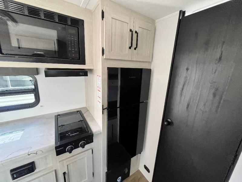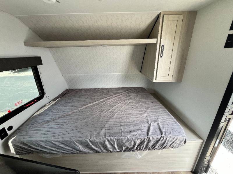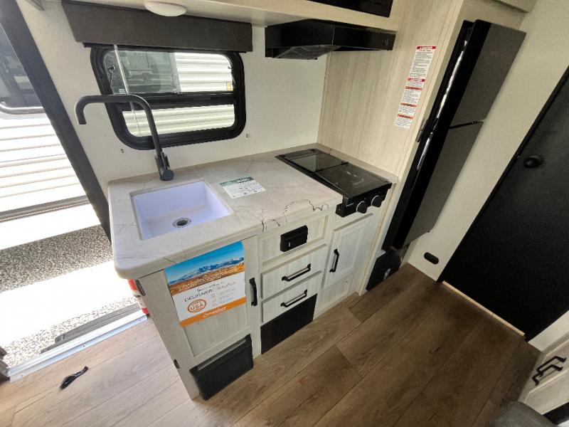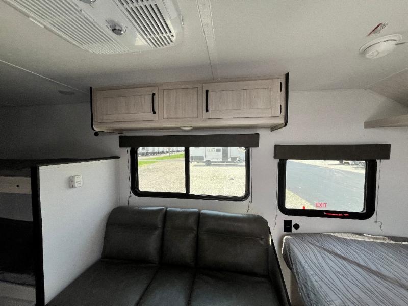 It will be so easy to enjoy camping trips in this single axle travel trailer! There is a front RV queen bed with flip-up storage at the foot of the bed for your belongings, and any additional guests can sleep on the bunk beds and sofa. A full kitchen includes a stainless two burner cooktop and stainless microwave to cook meals each day, and the 4.3 cu. ft. 12V black glass refrigerator will keep your food fresh. And a private bath with a toilet and shower will let you freshen up without having to use the camp's facilities!
