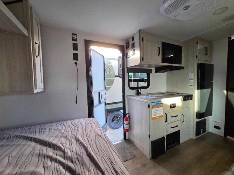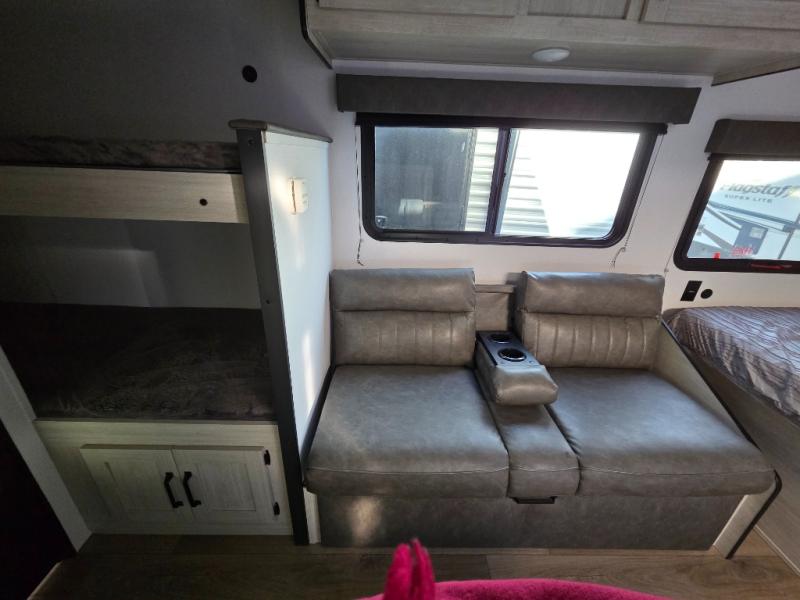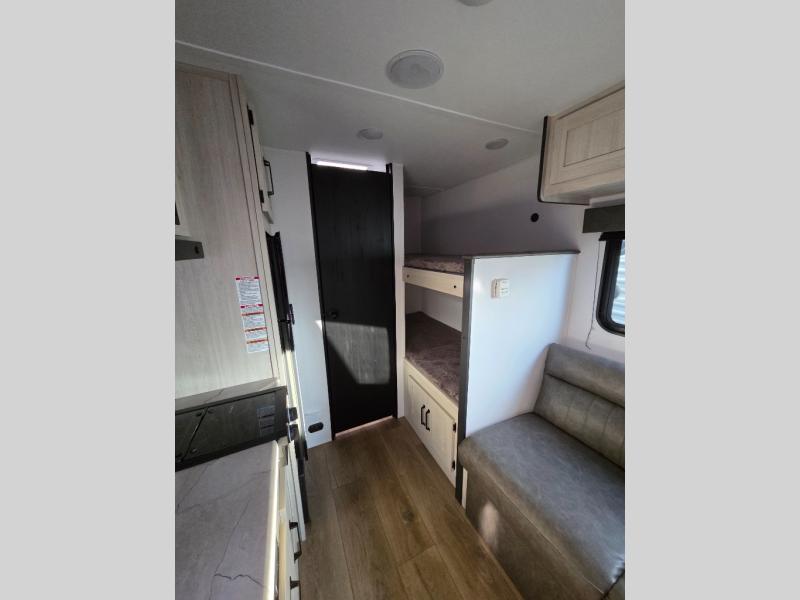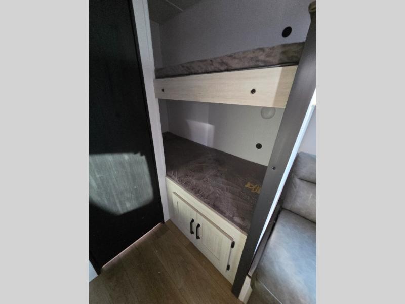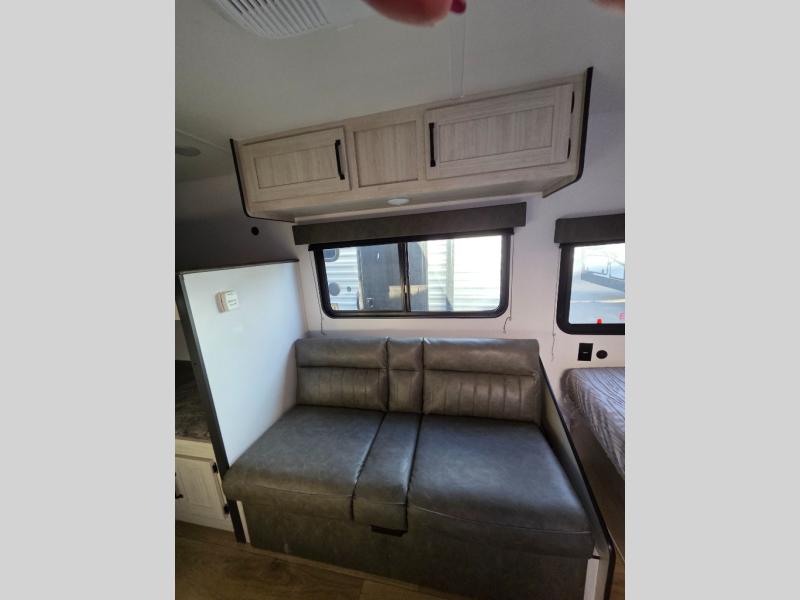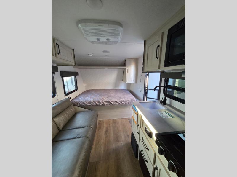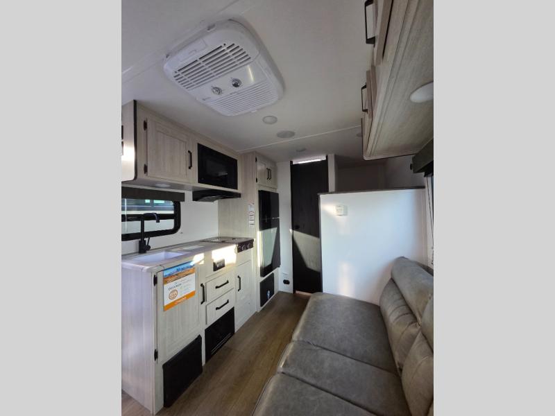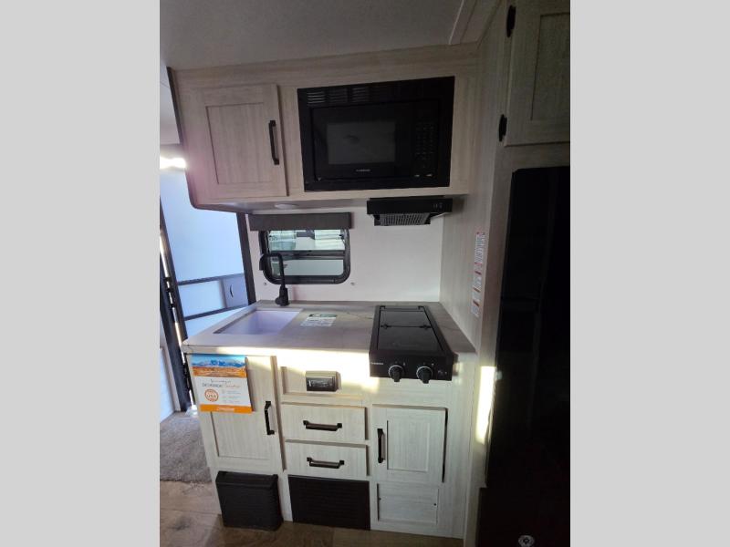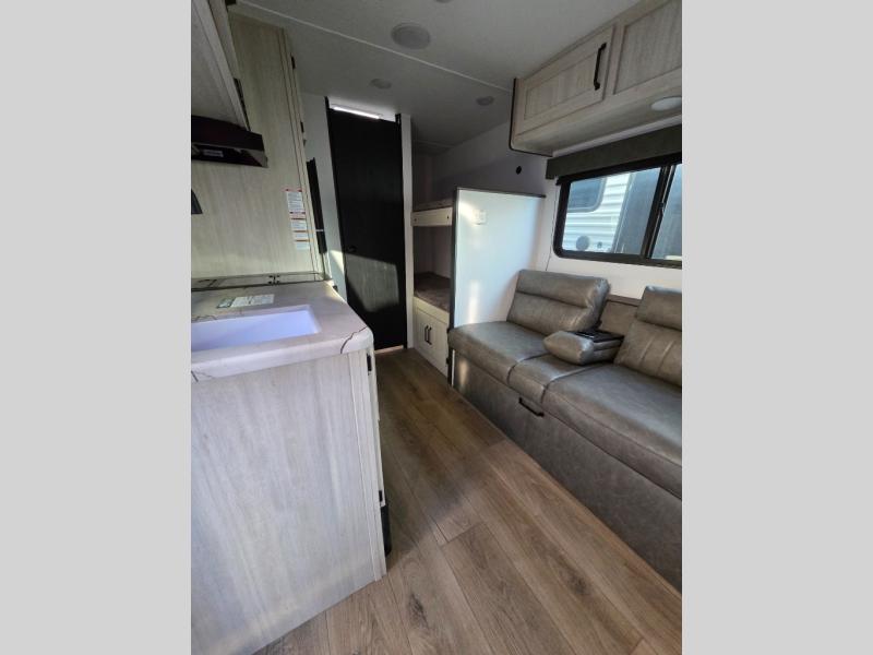 It will be so easy to enjoy camping trips in this single axle travel trailer! There is a front RV queen bed with flip-up storage at the foot of the bed for your belongings, and any additional guests can sleep on the bunk beds and sofa. A full kitchen includes a stainless two burner cooktop and stainless microwave to cook meals each day, and the 4.3 cu. ft. 12V black glass refrigerator will keep your food fresh. And a private bath with a toilet and shower will let you freshen up without having to use the camp's facilities!