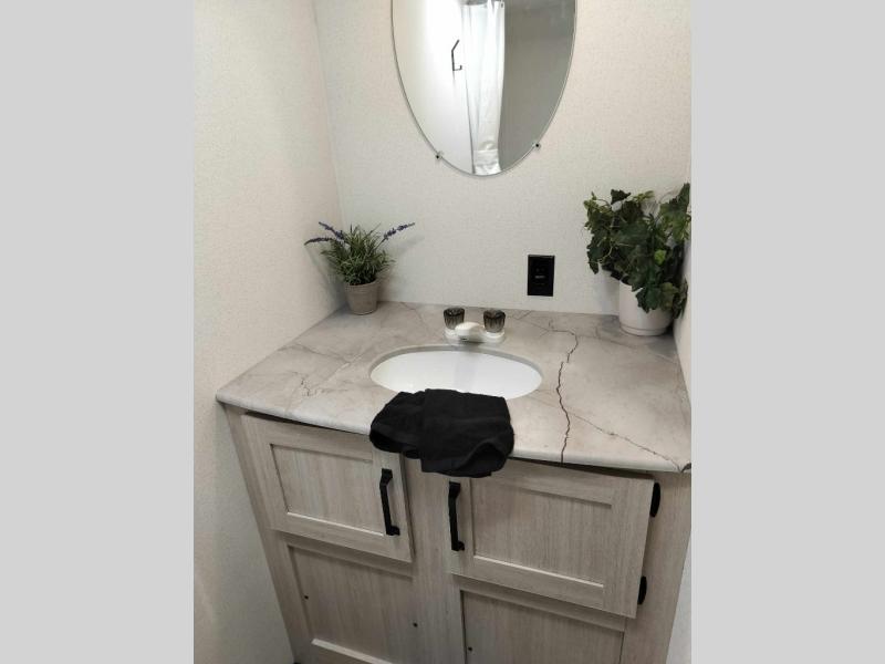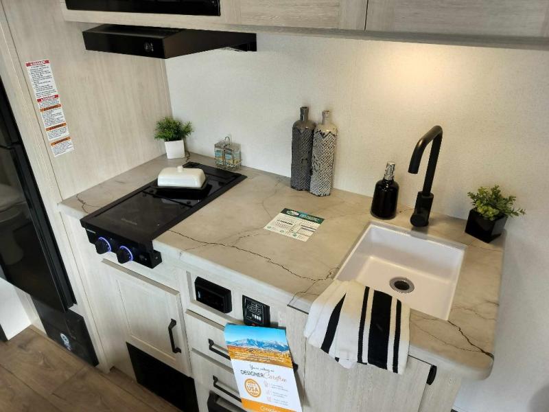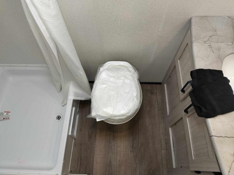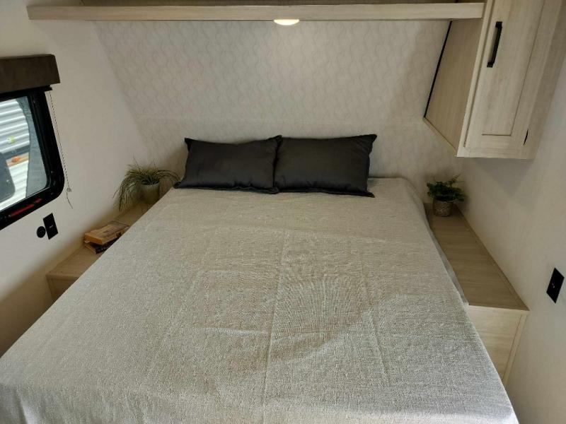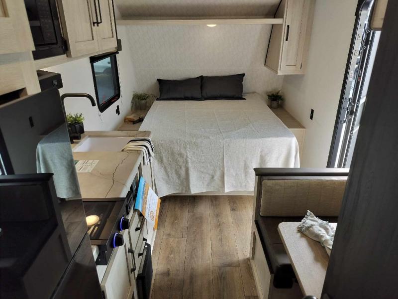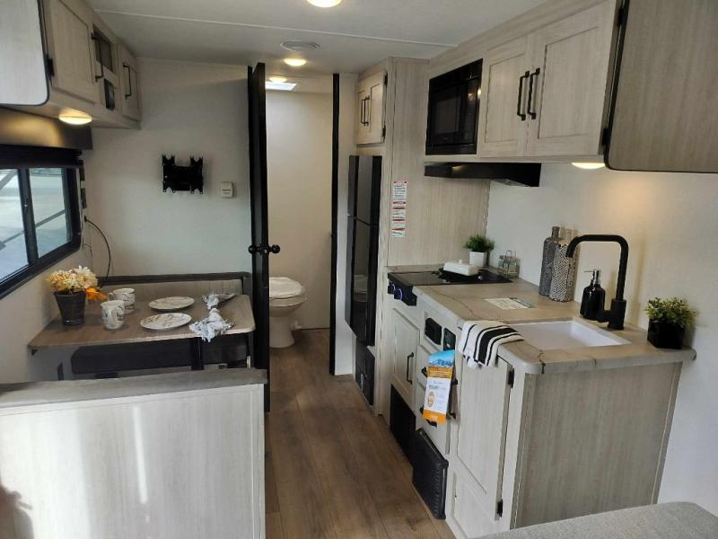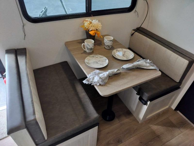 This single axle travel trailer is one you won't want to pass up! There is a front RV queen bed with a bedside shirt closet and overhead shelf for your things, and one more adult or two little ones can sleep on the booth dinette. A full kitchen includes a stainless two burner cooktop and stainless microwave to cook meals each day, and the 4.3 cu. ft. 12V black glass refrigerator will keep your food fresh. This model also includes a full rear bath with a toilet, sinks, and 36" x 30" shower for easy cleaning up!