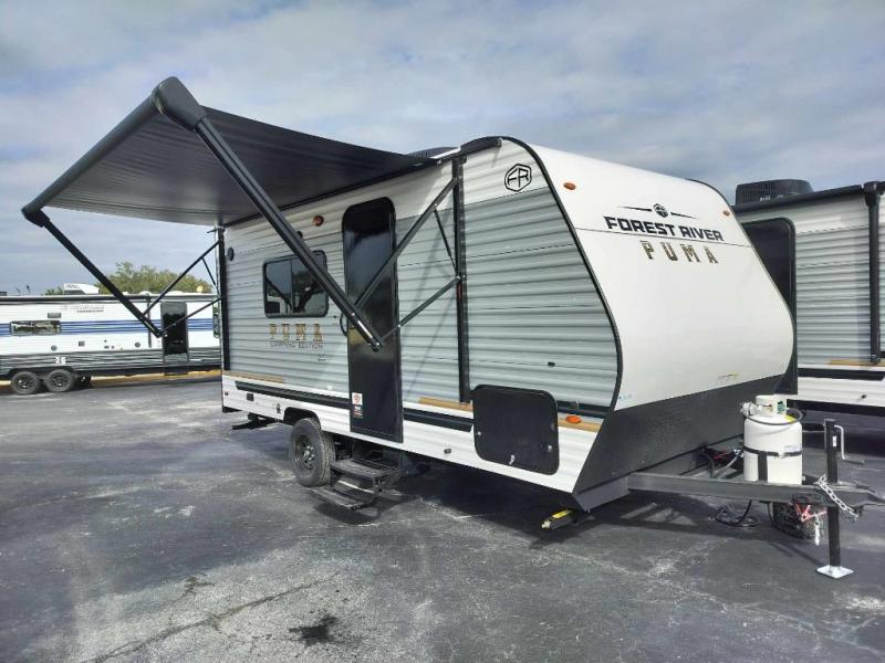 The Puma Camping Edition by Palomino offer an affordable travel trailer for rookie campers or seasoned RVers! They are built with 5/8" tongue and groove plywood flooring and a front diamond plate for added protection. There are also exterior clamp style door latches, back up camera prep, and 20 lb. LP bottles. Head inside to find Thermofoil countertops with a smooth drop edge, bedroom USB ports and outlets, and a GE appliance and kitchen package.