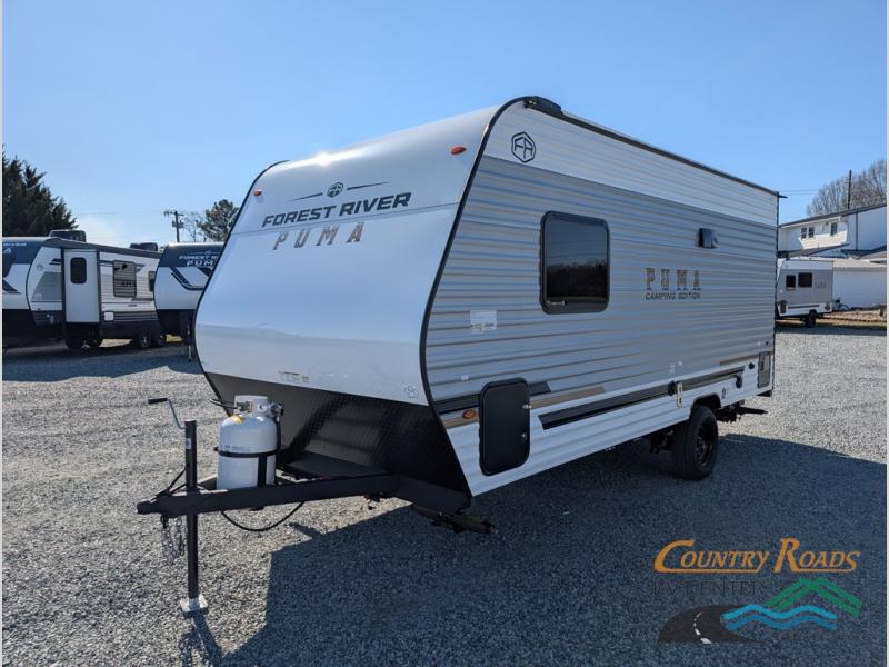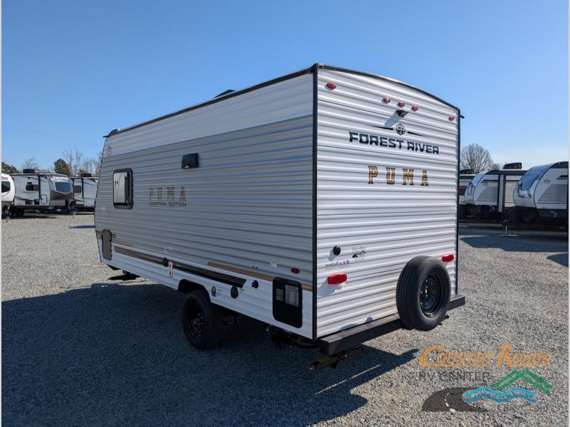 The Puma Camping Edition by Palomino offer an affordable travel trailer for rookie campers or seasoned RVers! They are built with 5/8" tongue and groove plywood flooring and a front diamond plate for added protection. There are also exterior clamp style door latches, back up camera prep, and 20 lb. LP bottles. Head inside to find Thermofoil countertops with a smooth drop edge, bedroom USB ports and outlets, and a GE appliance and kitchen package.