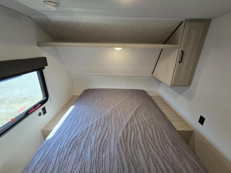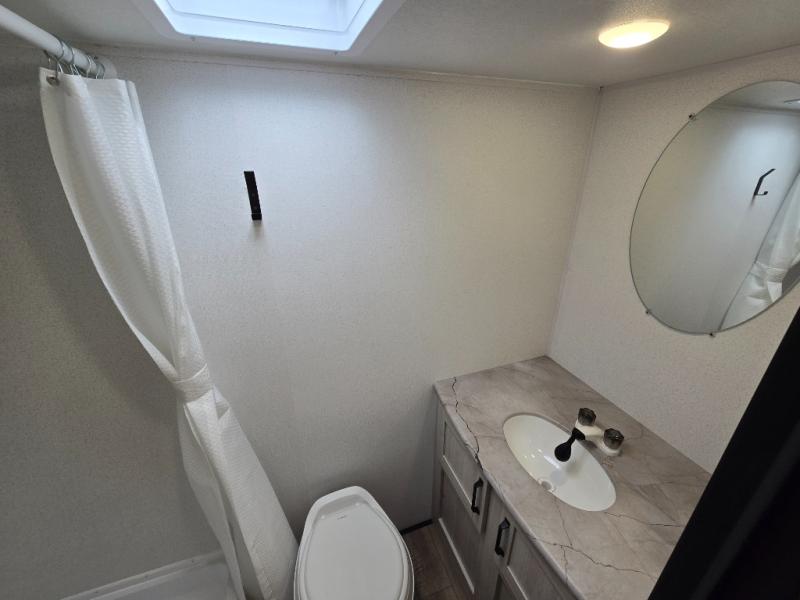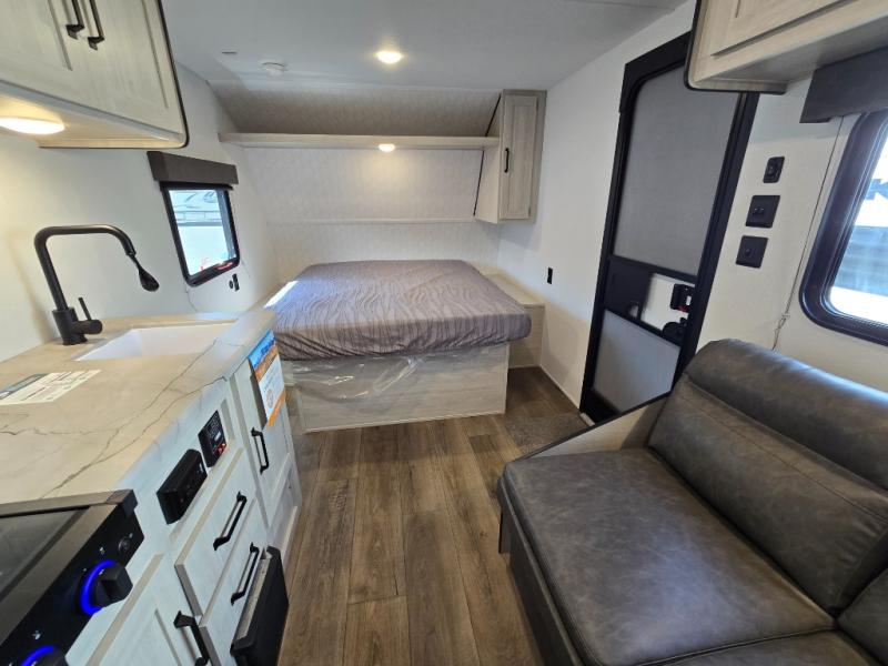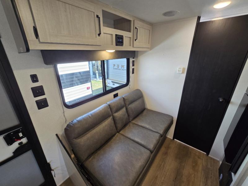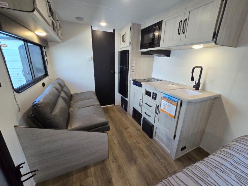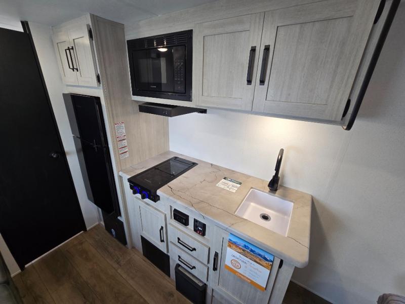 This single axle travel trailer is one you won't want to pass up! There is a front RV queen bed with a bedside shirt closet and overhead shelf for your things, and one more adult or two little ones can sleep on the booth dinette. A full kitchen includes a stainless two burner cooktop and stainless microwave to cook meals each day, and the 4.3 cu. ft. 12V black glass refrigerator will keep your food fresh. This model also includes a full rear bath with a toilet, sinks, and 36" x 30" shower for easy cleaning up!