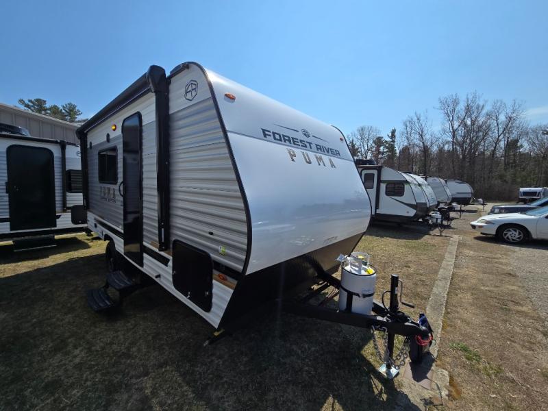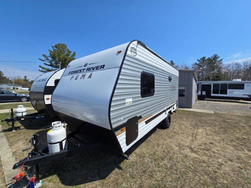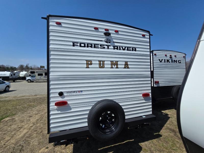 The Puma Camping Edition by Palomino offer an affordable travel trailer for rookie campers or seasoned RVers! They are built with 5/8" tongue and groove plywood flooring and a front diamond plate for added protection. There are also exterior clamp style door latches, back up camera prep, and 20 lb. LP bottles. Head inside to find Thermofoil countertops with a smooth drop edge, bedroom USB ports and outlets, and a GE appliance and kitchen package.