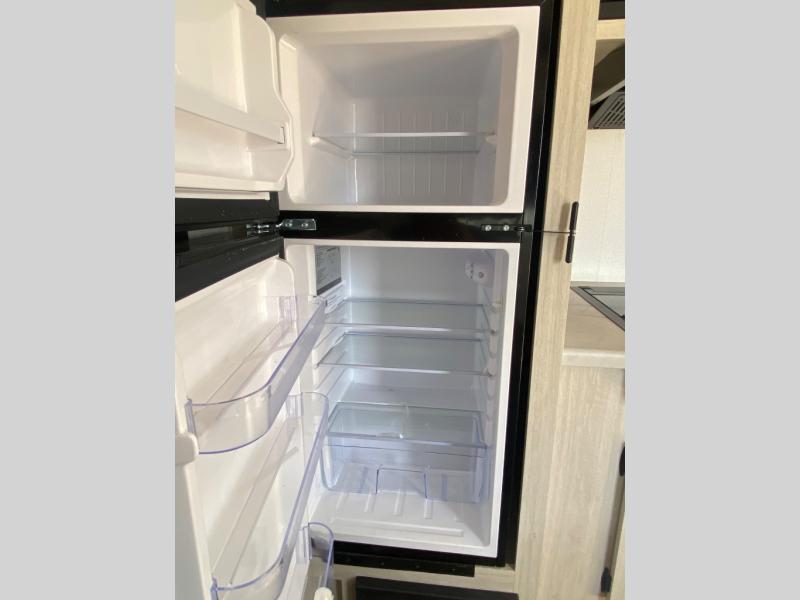 This single axle travel trailer is one you won't want to pass up! There is a front RV queen bed with a bedside shirt closet and overhead shelf for your things, and one more adult or two little ones can sleep on the booth dinette. A full kitchen includes a stainless two burner cooktop and stainless microwave to cook meals each day, and the 4.3 cu. ft. 12V black glass refrigerator will keep your food fresh. This model also includes a full rear bath with a toilet, sinks, and 36" x 30" shower for easy cleaning up!