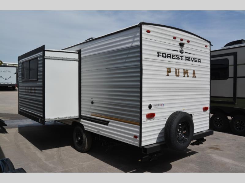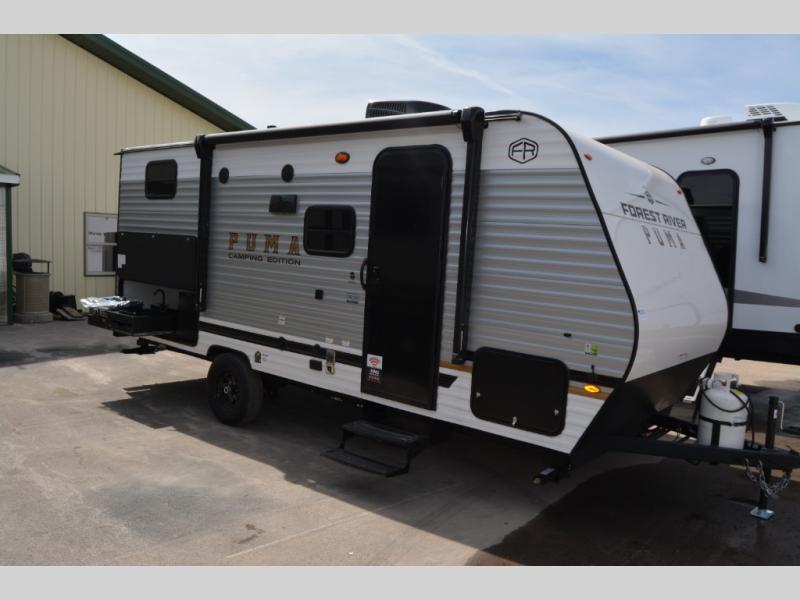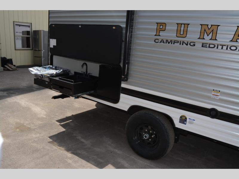 The Puma Camping Edition by Palomino offer an affordable travel trailer for rookie campers or seasoned RVers! They are built with 5/8" tongue and groove plywood flooring and a front diamond plate for added protection. There are also exterior clamp style door latches, back up camera prep, and 20 lb. LP bottles. Head inside to find Thermofoil countertops with a smooth drop edge, bedroom USB ports and outlets, and a GE appliance and kitchen package.