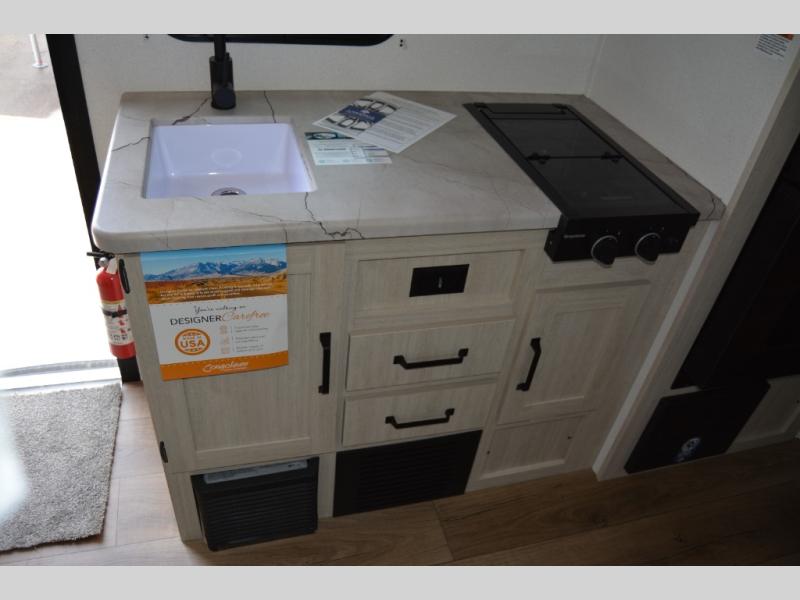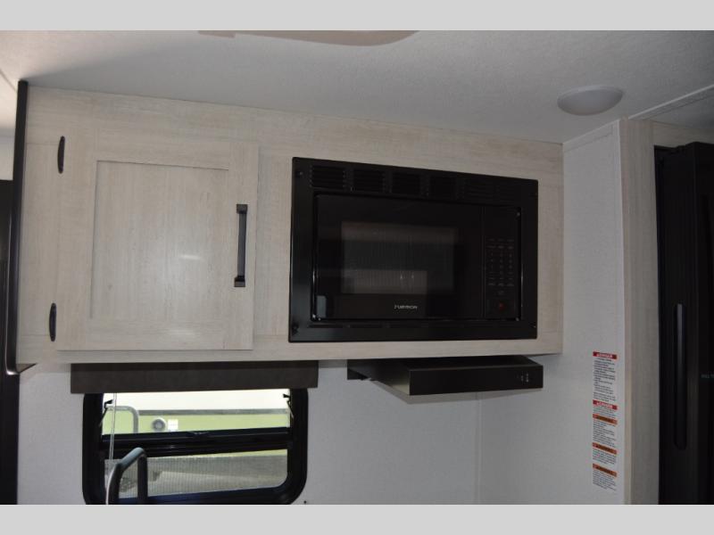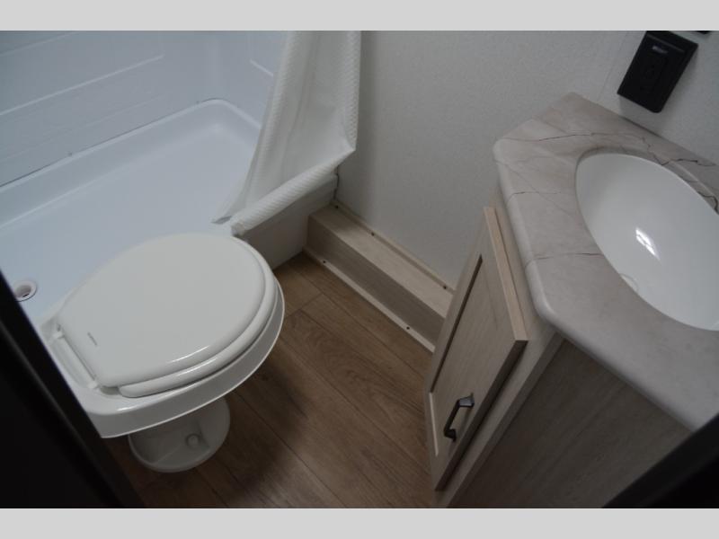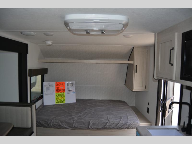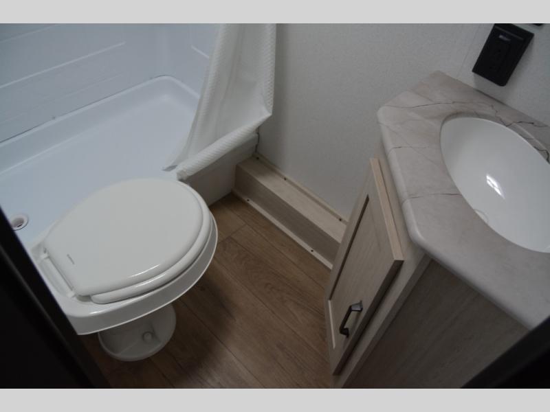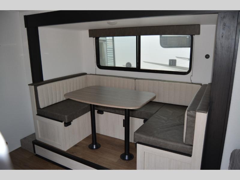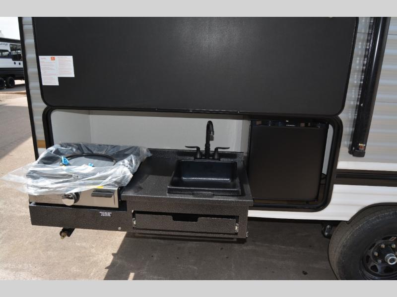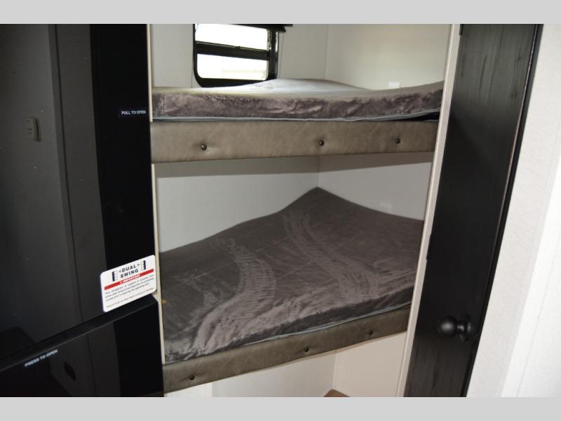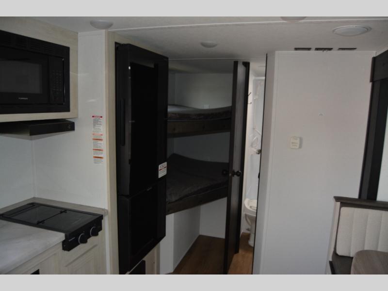 The whole gang will love camping in this travel trailer since there are double-size bunks for compact sleeping spaces and a slide out for more space to relax! The front RV queen bed is sure to provide a great night's rest, and you can choose the optional Murphy bed if you're needing more seating space during the day. Once you've made dinner on the two burner cooktop, you can dine around the U-shaped dinette. And an optional mini kitchen with a griddle is available if you'd rather cook outdoors! This unit includes ample storage space for your things, including exterior storage and storage under the bunks!