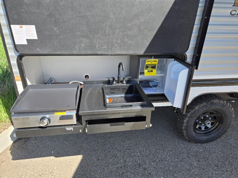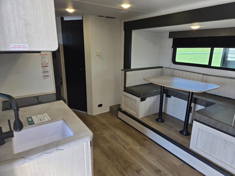 The whole gang will love camping in this travel trailer since there are double-size bunks for compact sleeping spaces and a slide out for more space to relax! The front RV queen bed is sure to provide a great night's rest, and you can choose the optional Murphy bed if you're needing more seating space during the day. Once you've made dinner on the two burner cooktop, you can dine around the U-shaped dinette. And an optional mini kitchen with a griddle is available if you'd rather cook outdoors! This unit includes ample storage space for your things, including exterior storage and storage under the bunks!