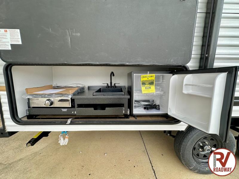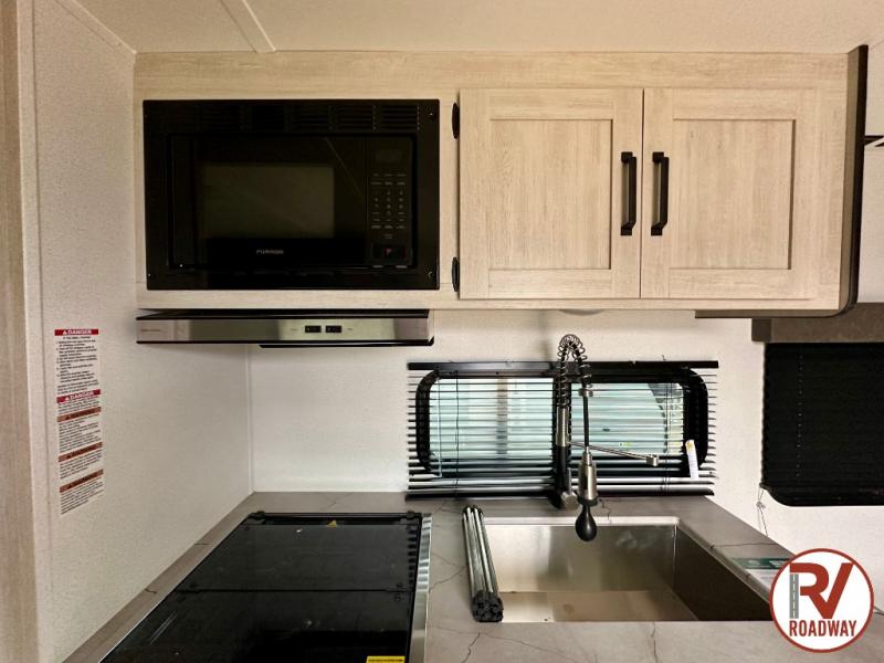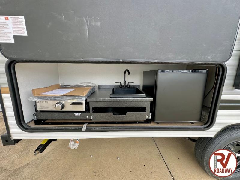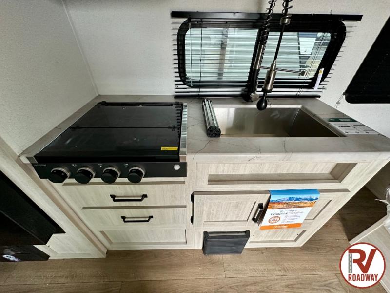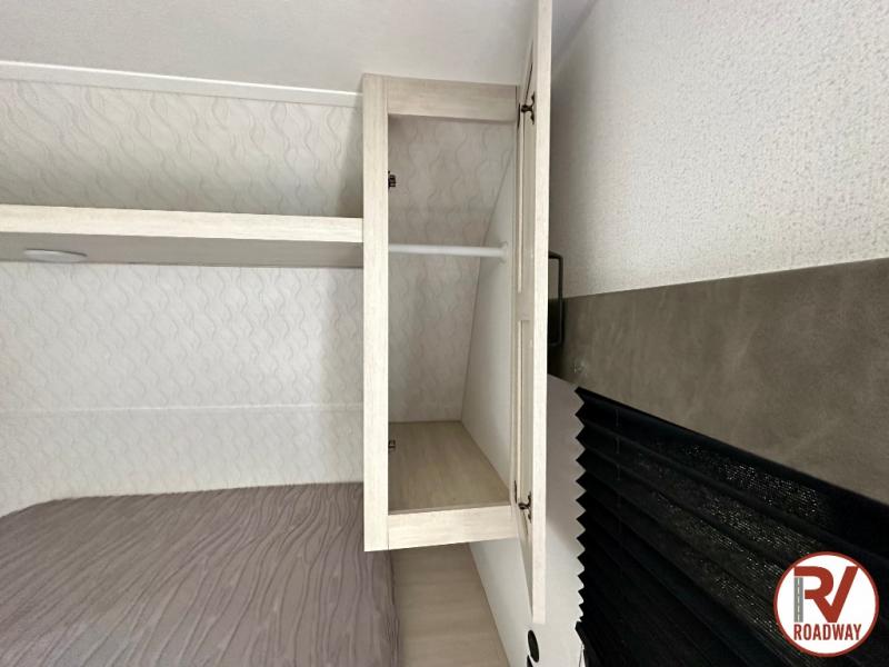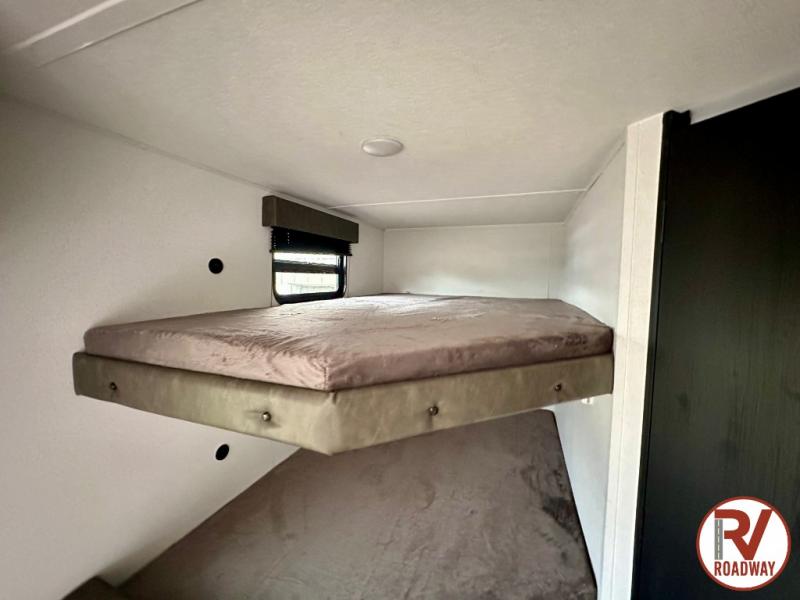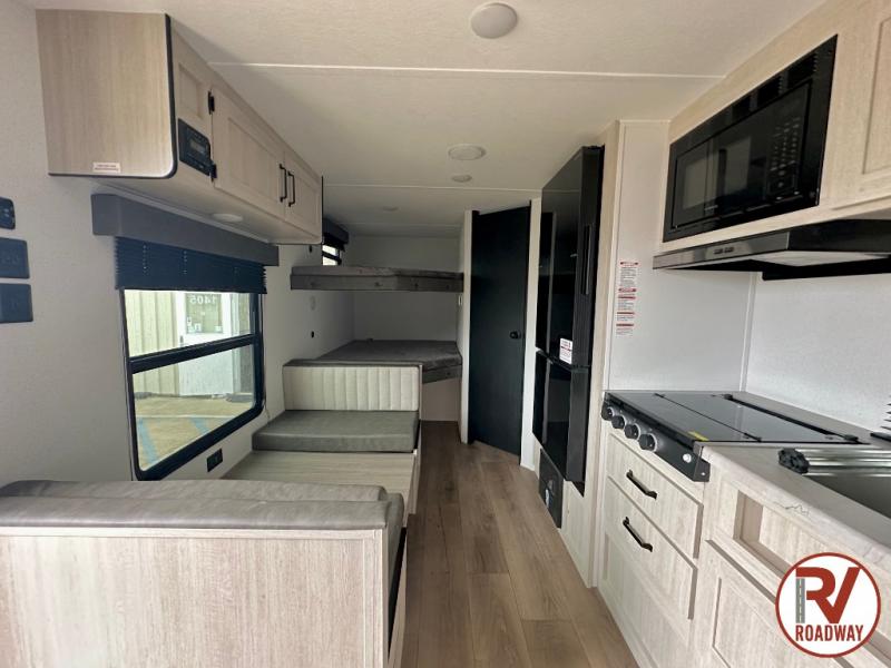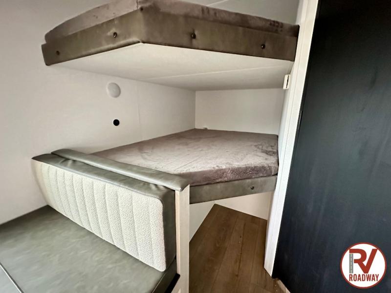 If you're looking for more sleeping space, this double axle unit features double-size bunks with storage under the bunks for your bags. The full kitchen includes a stainless microwave and three burner cooktop to make meals, plus a pantry and 12V refrigerator for food storage. And an optional outside mini kitchen with a griddle can be added if you enjoy cooking outdoors! Up front, you'll find a 60" x 74" queen bed with an optional Murphy bed if you're needing more seating space during the day!