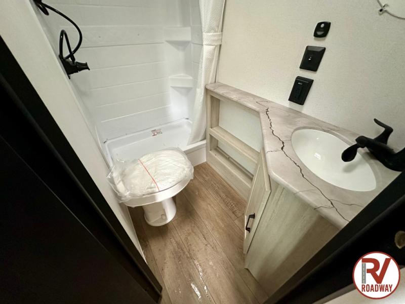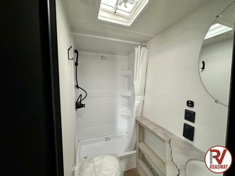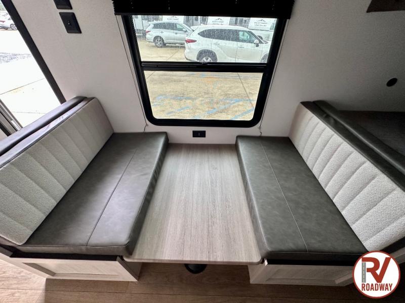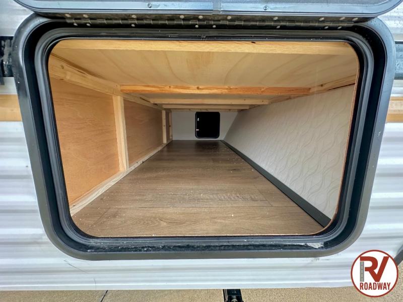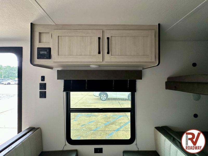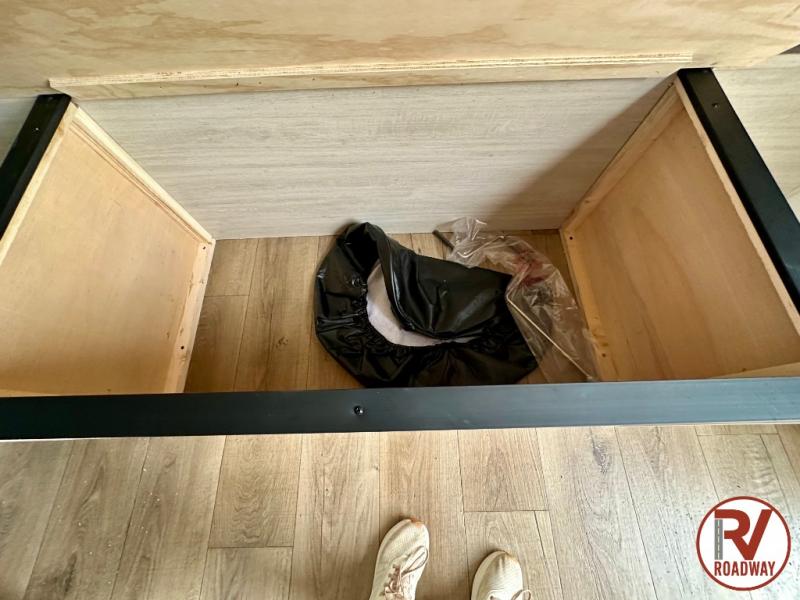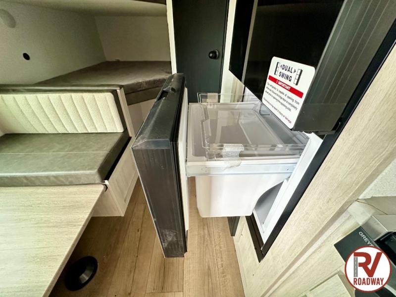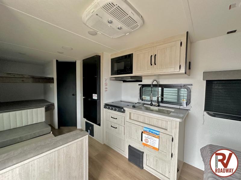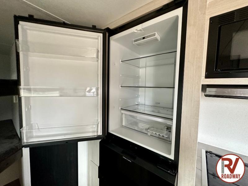 If you're looking for more sleeping space, this double axle unit features double-size bunks with storage under the bunks for your bags. The full kitchen includes a stainless microwave and three burner cooktop to make meals, plus a pantry and 12V refrigerator for food storage. And an optional outside mini kitchen with a griddle can be added if you enjoy cooking outdoors! Up front, you'll find a 60" x 74" queen bed with an optional Murphy bed if you're needing more seating space during the day!
