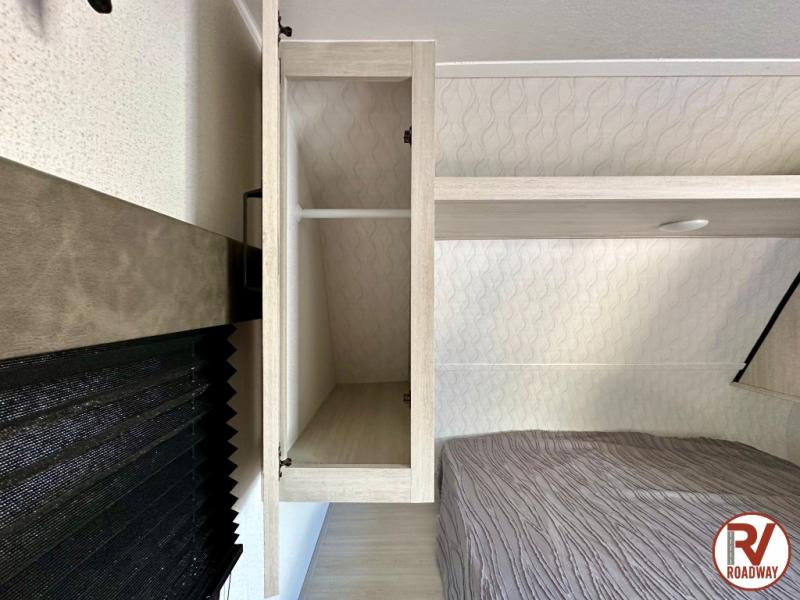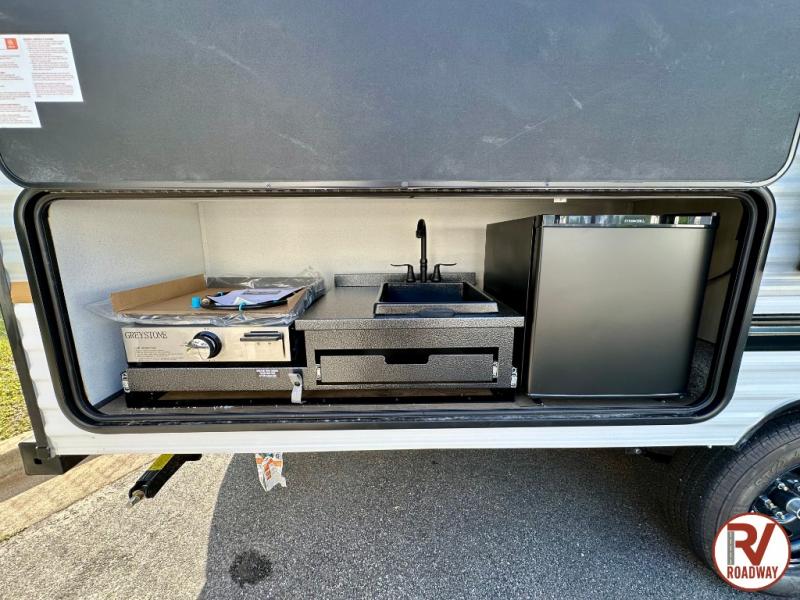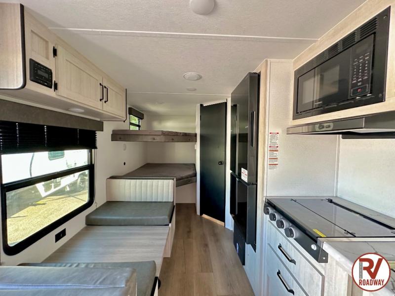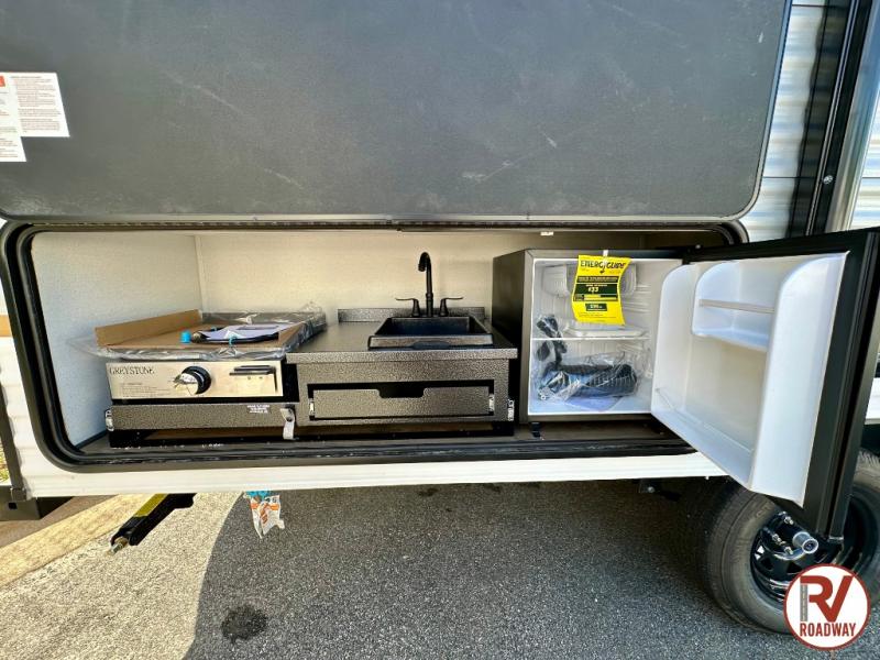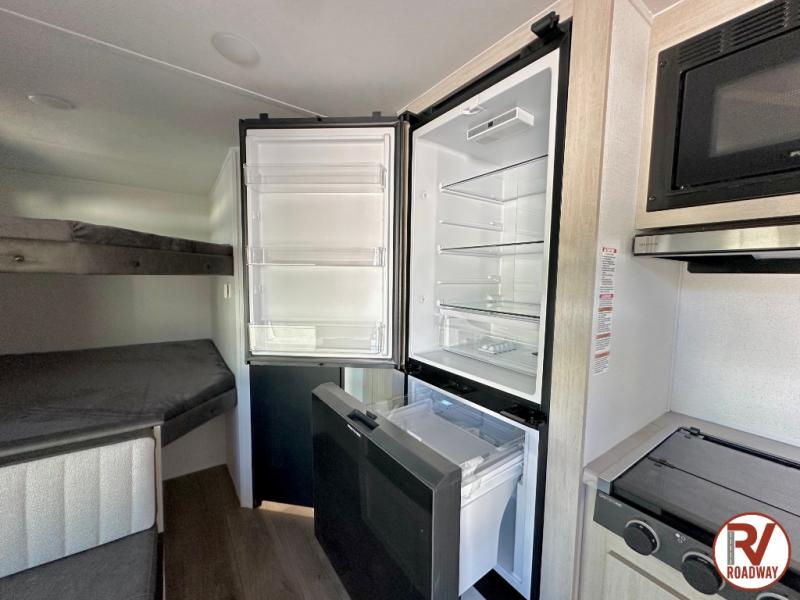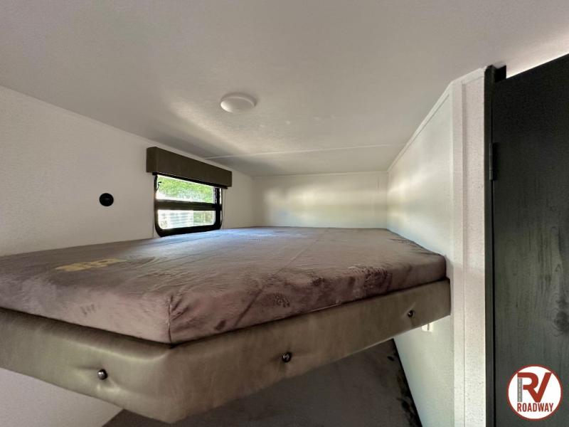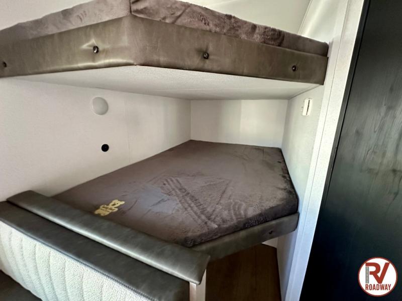If you're looking for more sleeping space, this double axle unit features double-size bunks with storage under the bunks for your bags. The full kitchen includes a stainless microwave and three burner cooktop to make meals, plus a pantry and 12V refrigerator for food storage. And an optional outside mini kitchen with a griddle can be added if you enjoy cooking outdoors! Up front, you'll find a 60" x 74" queen bed with an optional Murphy bed if you're needing more seating space during the day!
