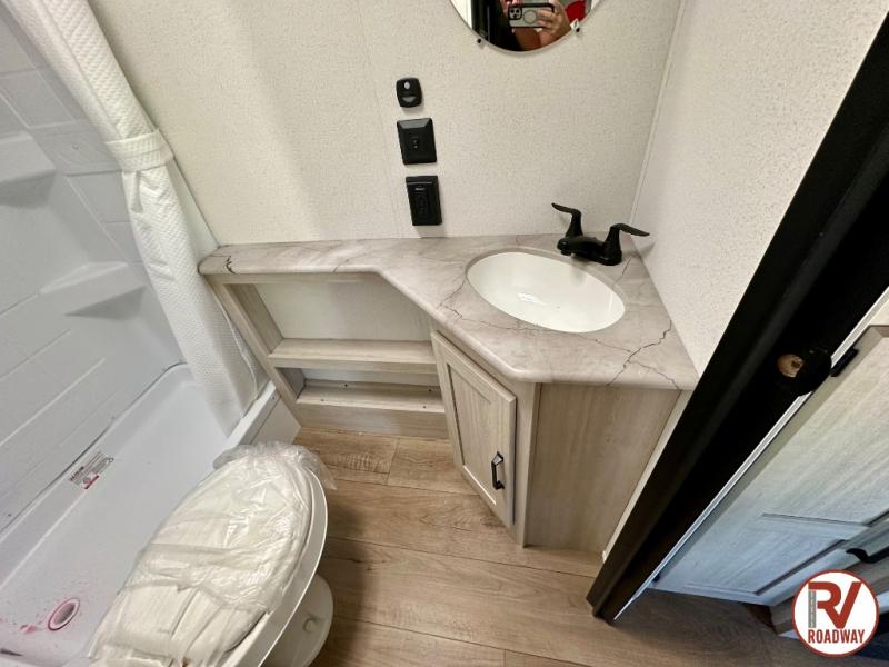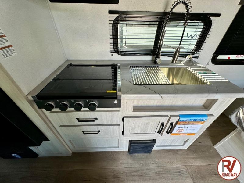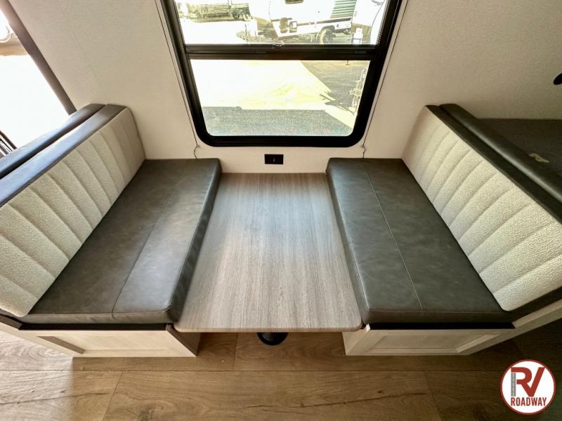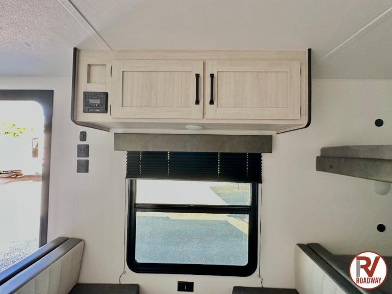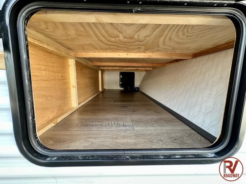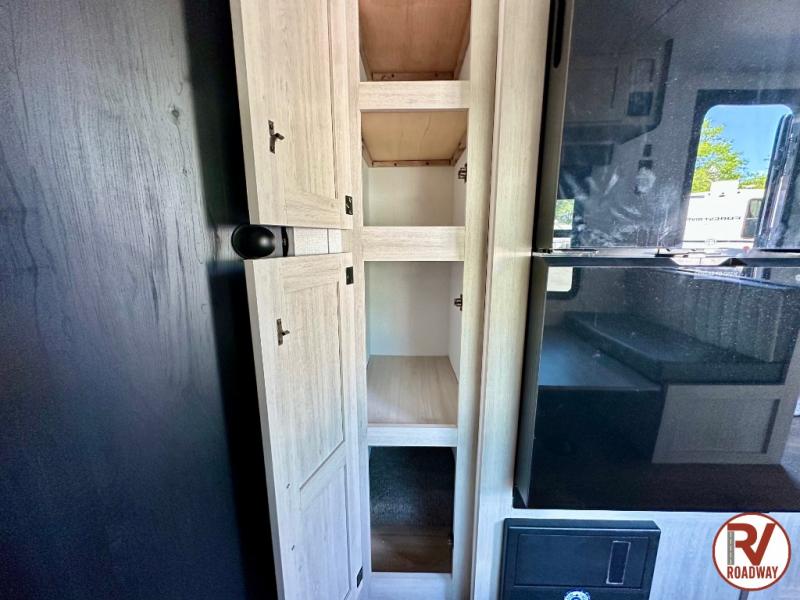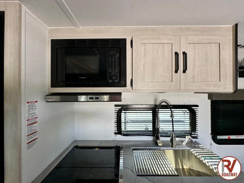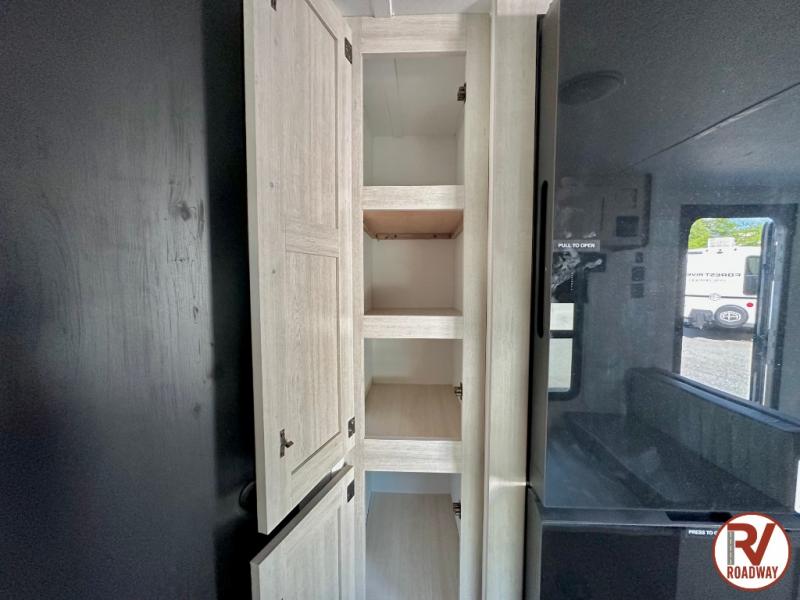 If you're looking for more sleeping space, this double axle unit features double-size bunks with storage under the bunks for your bags. The full kitchen includes a stainless microwave and three burner cooktop to make meals, plus a pantry and 12V refrigerator for food storage. And an optional outside mini kitchen with a griddle can be added if you enjoy cooking outdoors! Up front, you'll find a 60" x 74" queen bed with an optional Murphy bed if you're needing more seating space during the day!