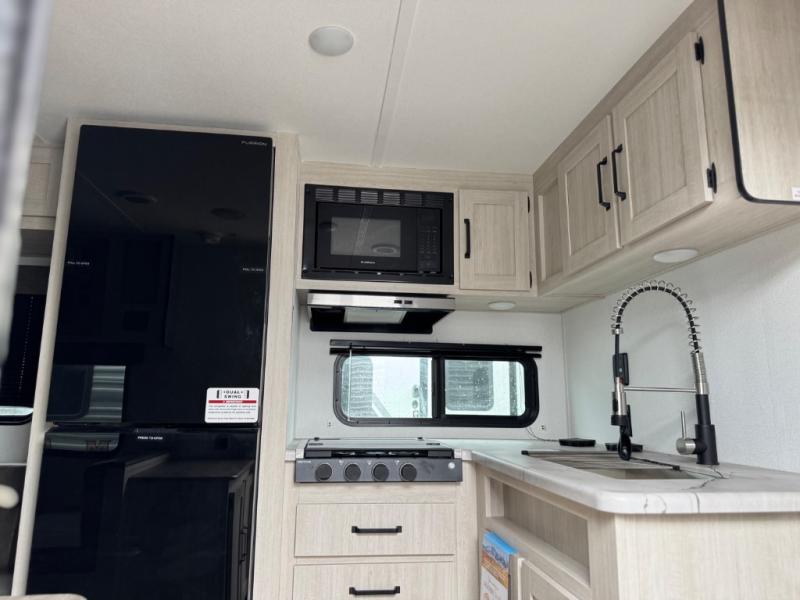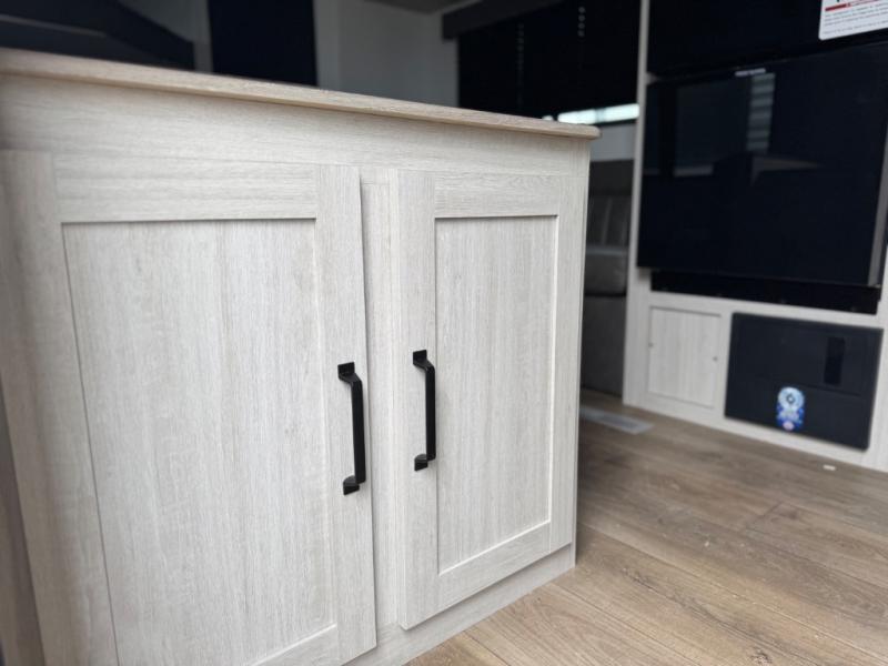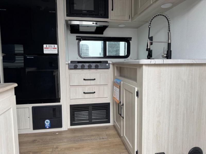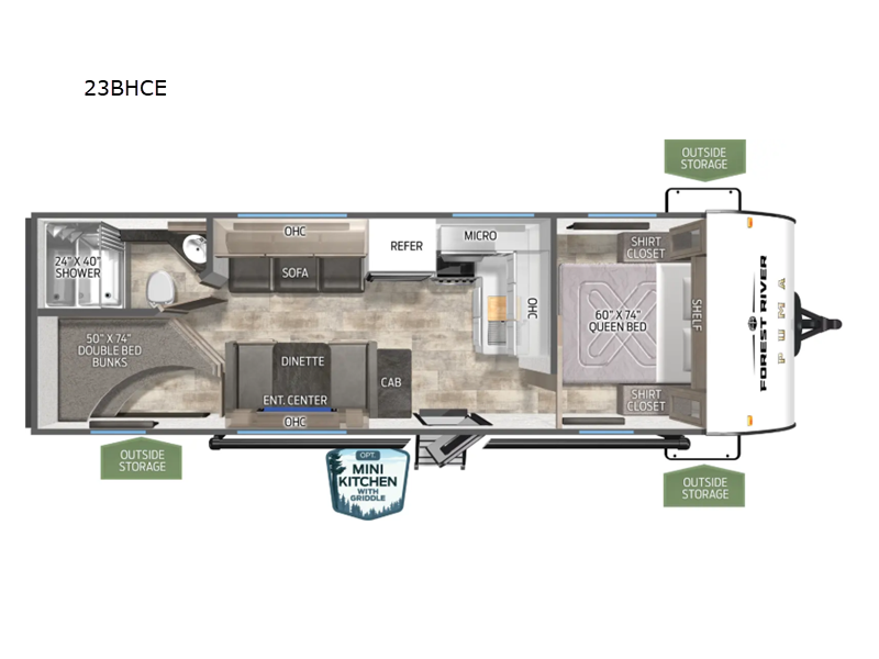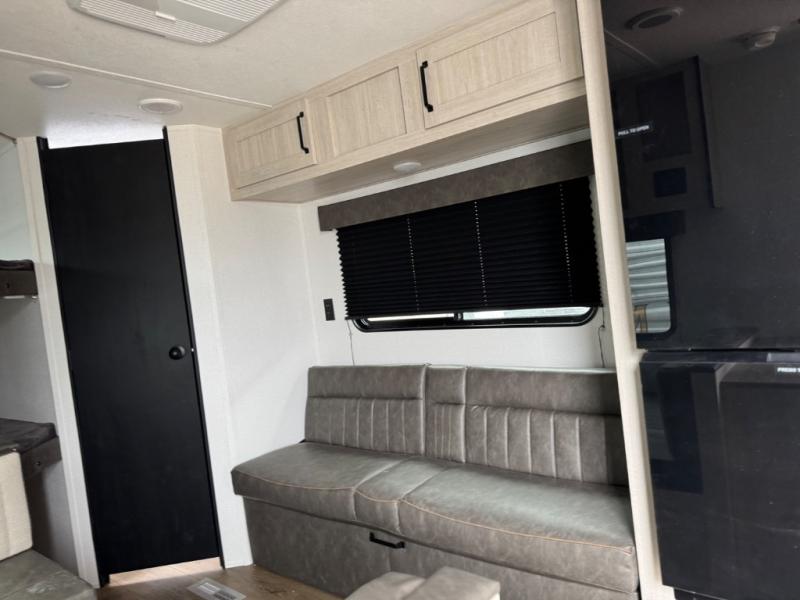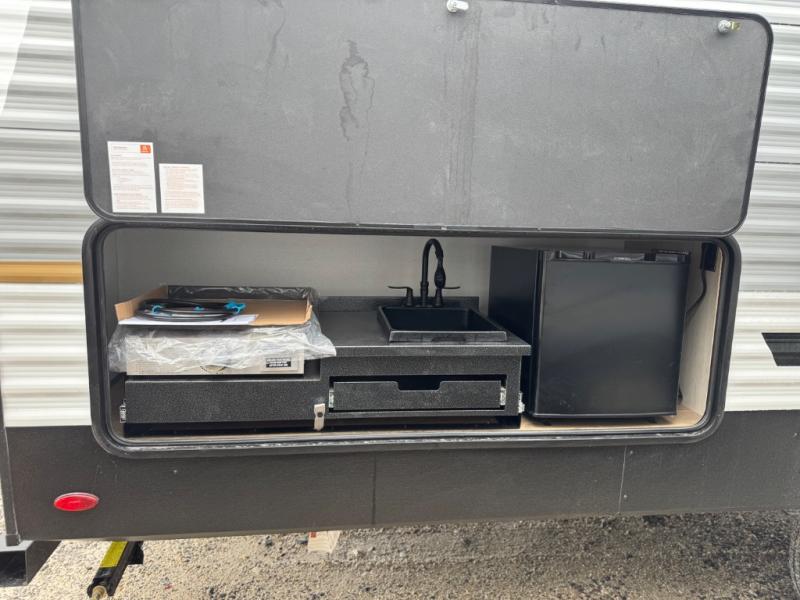 If you're looking for more sleeping space, this double axle unit features double-size bunks, an RV queen bed in the front bedroom, plus a sofa and booth dinette in the combined kitchen and living area. The full kitchen includes a stainless microwave and three burner cooktop to make meals, plus a pantry and 12V refrigerator for food storage. And an optional outside mini kitchen with a griddle can be added if you enjoy cooking outdoors!