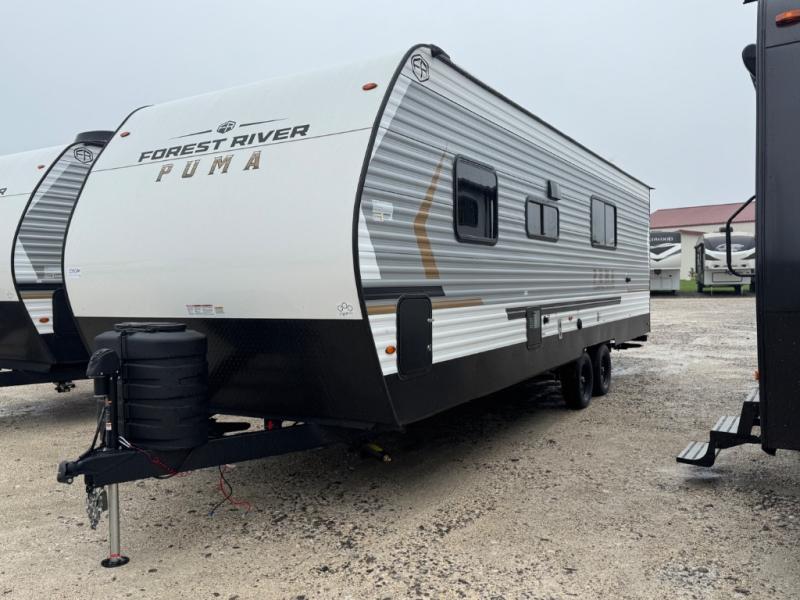 The Puma Camping Edition by Palomino offer an affordable travel trailer for rookie campers or seasoned RVers! They are built with 5/8" tongue and groove plywood flooring and a front diamond plate for added protection. There are also exterior clamp style door latches, back up camera prep, and 20 lb. LP bottles. Head inside to find Thermofoil countertops with a smooth drop edge, bedroom USB ports and outlets, and a GE appliance and kitchen package.