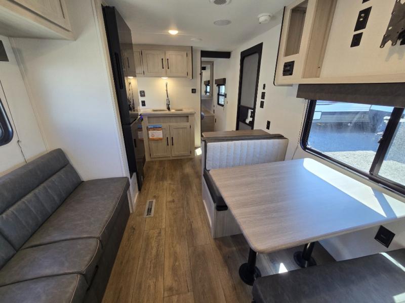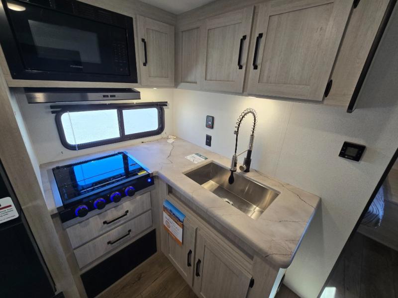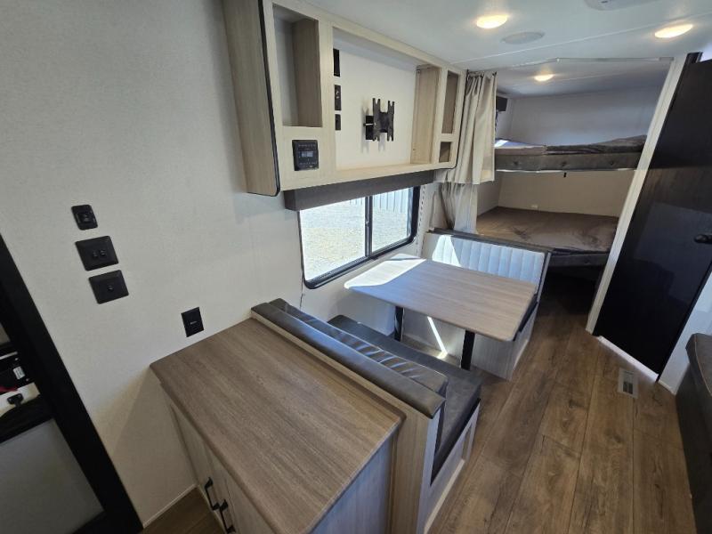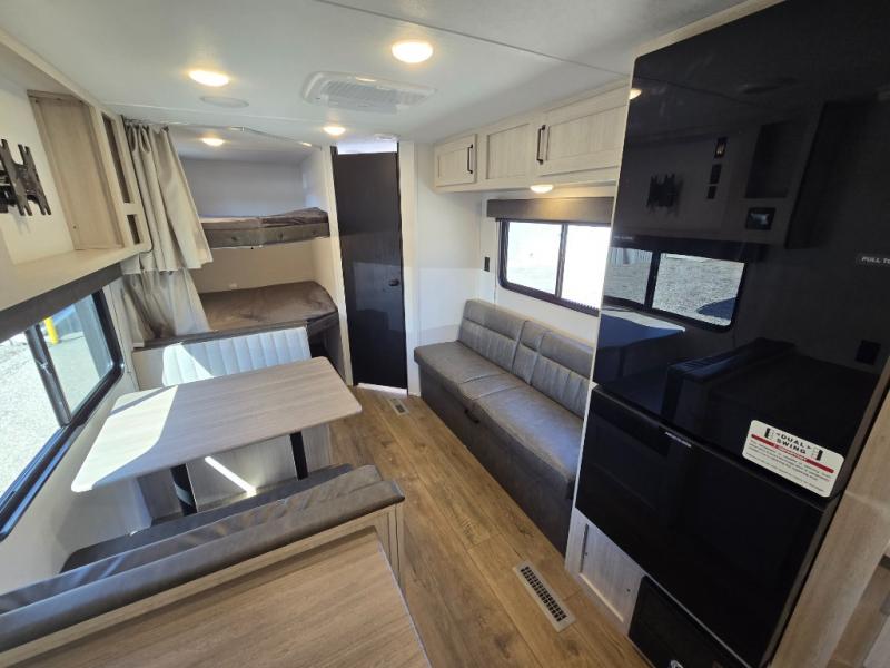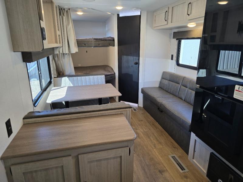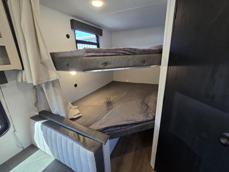 If you're looking for more sleeping space, this double axle unit features double-size bunks, an RV queen bed in the front bedroom, plus a sofa and booth dinette in the combined kitchen and living area. The full kitchen includes a stainless microwave and three burner cooktop to make meals, plus a pantry and 12V refrigerator for food storage. And an optional outside mini kitchen with a griddle can be added if you enjoy cooking outdoors!