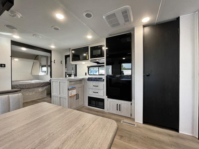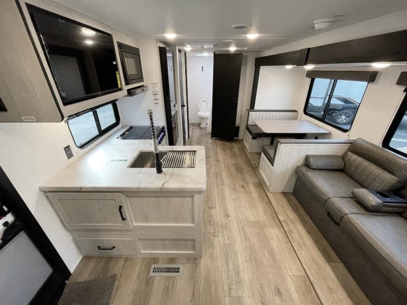 Wherever you decide to camp, you can be sure to have a great time in this rear bath travel trailer! The combined kitchen and living area is made spacious thanks to the large slide out. Here, you can relax on the sofa and dine at the booth dinette, and an optional TV can be added if you want the option for movie night. The full kitchen will allow you to make meals each day, and you can choose to add the optional outside mini kitchen with a griddle if you want to cook with fresh air. This unit also includes a front private bedroom, complete with an RV queen bed, an overhead shelf and dual shirt closets to keep clothes wrinkle-free.