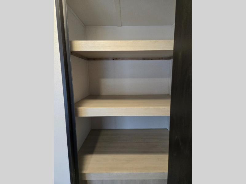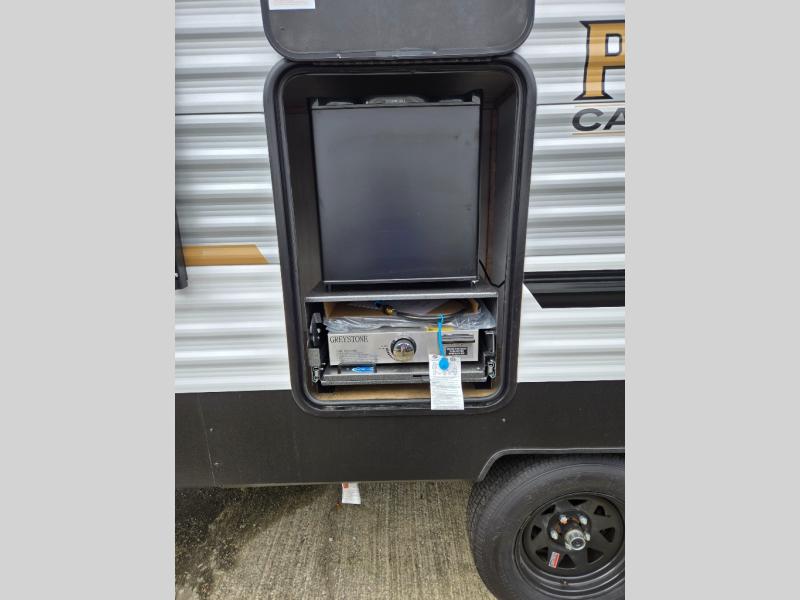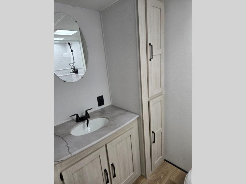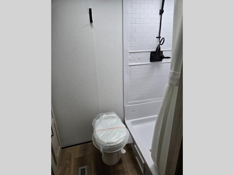 Wherever you decide to camp, you can be sure to have a great time in this rear bath travel trailer! The combined kitchen and living area is made spacious thanks to the large slide out. Here, you can relax on the sofa and dine at the booth dinette, and an optional TV can be added if you want the option for movie night. The full kitchen will allow you to make meals each day, and you can choose to add the optional outside mini kitchen with a griddle if you want to cook with fresh air. This unit also includes a front private bedroom, complete with an RV queen bed, an overhead shelf and dual shirt closets to keep clothes wrinkle-free.
