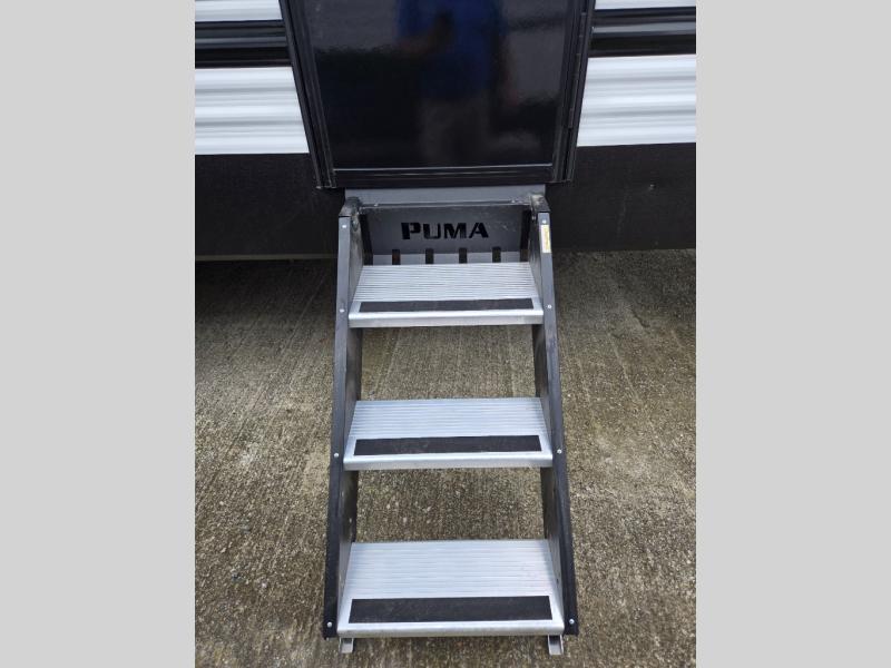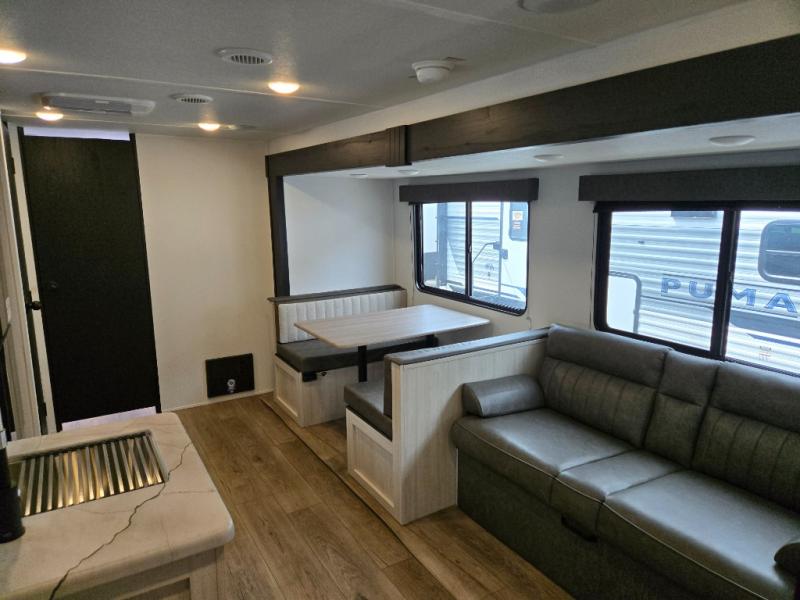The Puma Camping Edition by Palomino offer an affordable travel trailer for rookie campers or seasoned RVers! They are built with 5/8" tongue and groove plywood flooring and a front diamond plate for added protection. There are also exterior clamp style door latches, back up camera prep, and 20 lb. LP bottles. Head inside to find Thermofoil countertops with a smooth drop edge, bedroom USB ports and outlets, and a GE appliance and kitchen package.