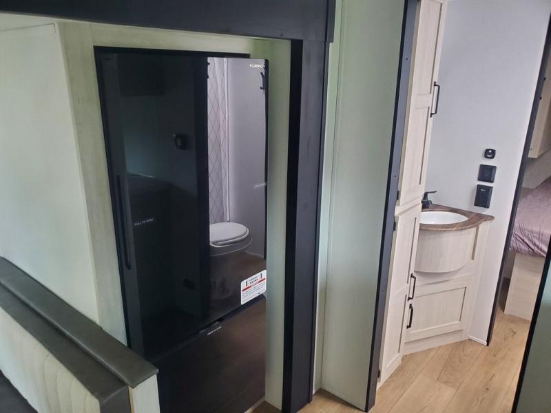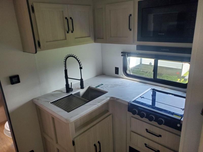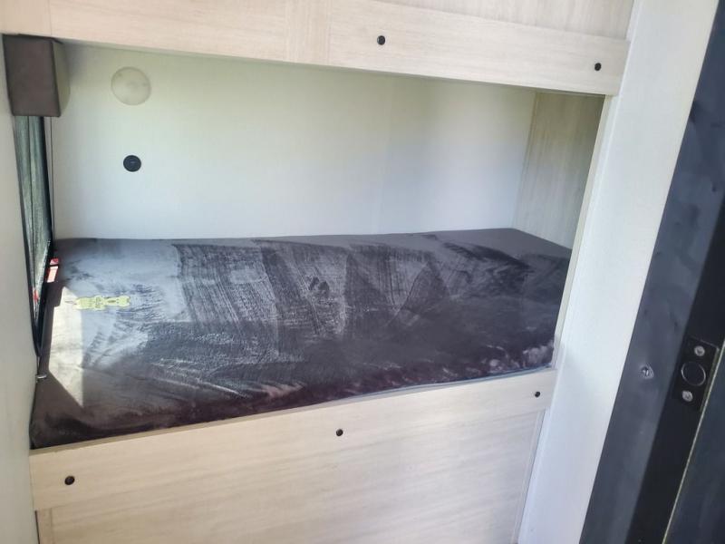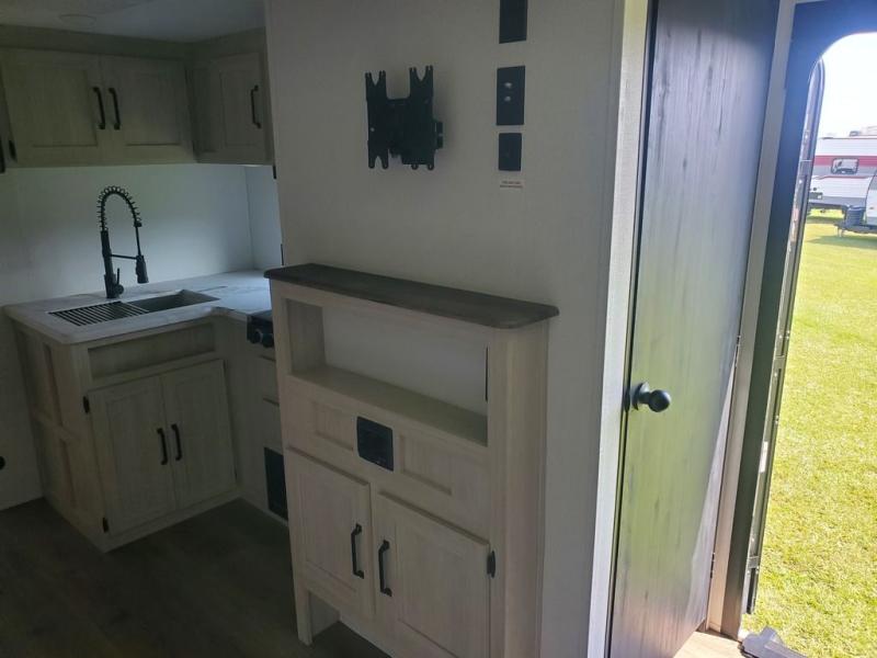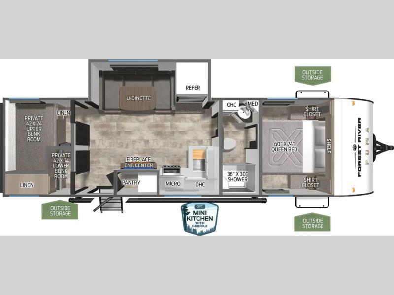 Your whole crew will love camping in this travel trailer since everyone can enjoy their own private space. The rear bunkhouses feature a private lower bunk room plus a private upper bunk room, each with their own door and a linen closet for storage space. The front master bedroom includes an RV queen bed, dual shirt closets, and easy access into the walk-thru bath. Head to the combined kitchen and living area to make dinner in the full kitchen, dine around the U-shaped dinette slide, and enjoy the fireplace! Outside, an optional mini kitchen with a griddle can be added if you choose, and you'll find outside storage compartments to keep all your gear secure!