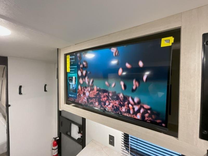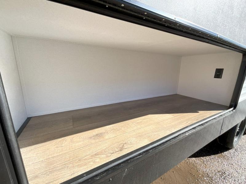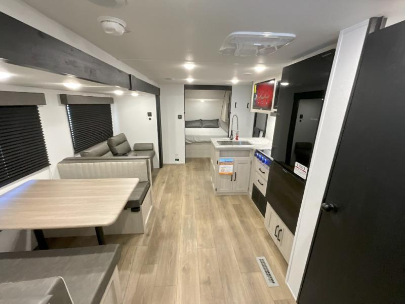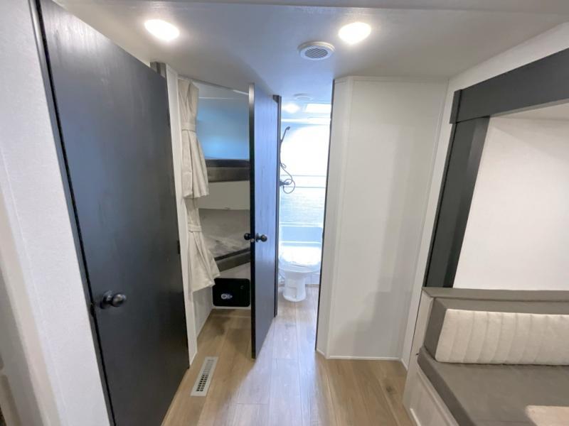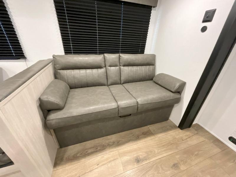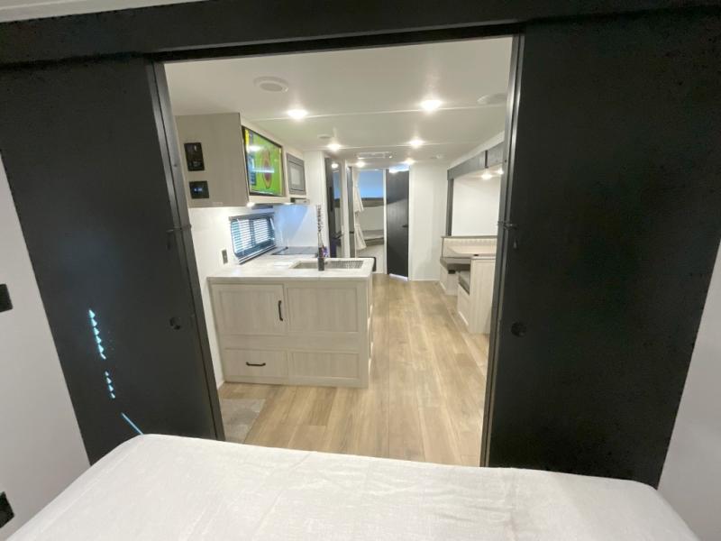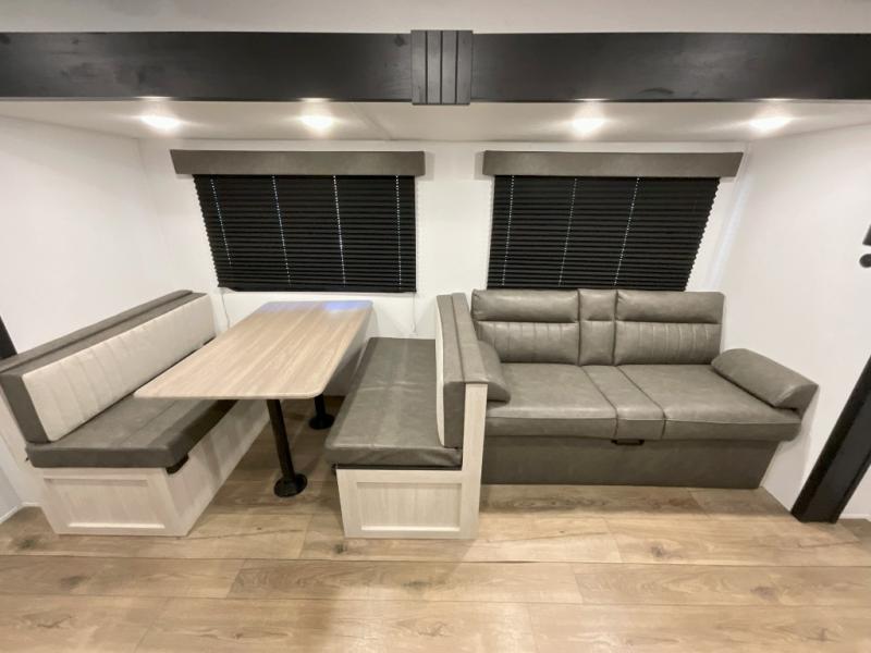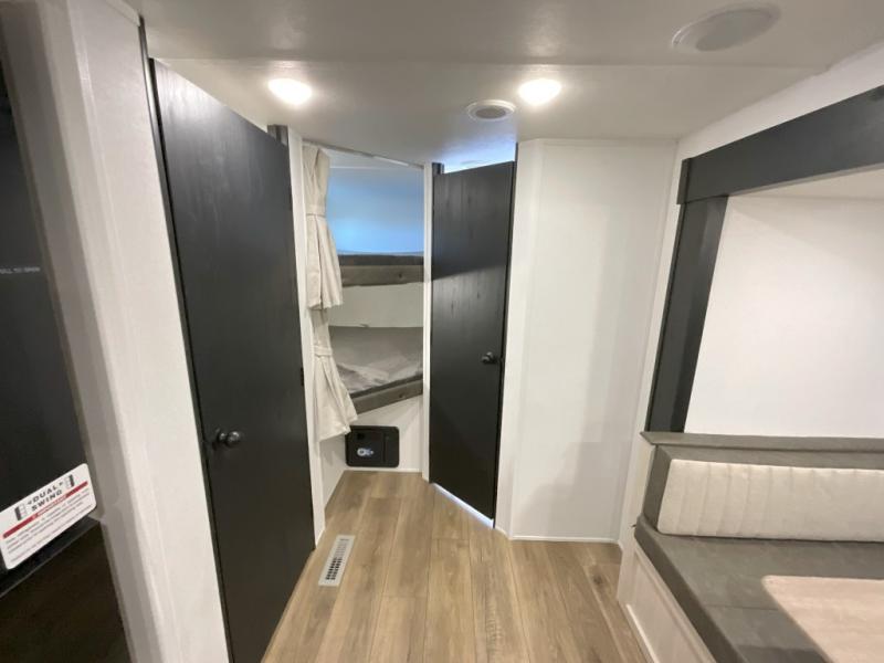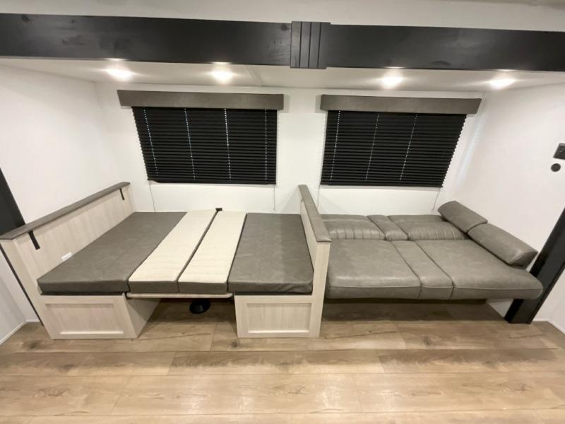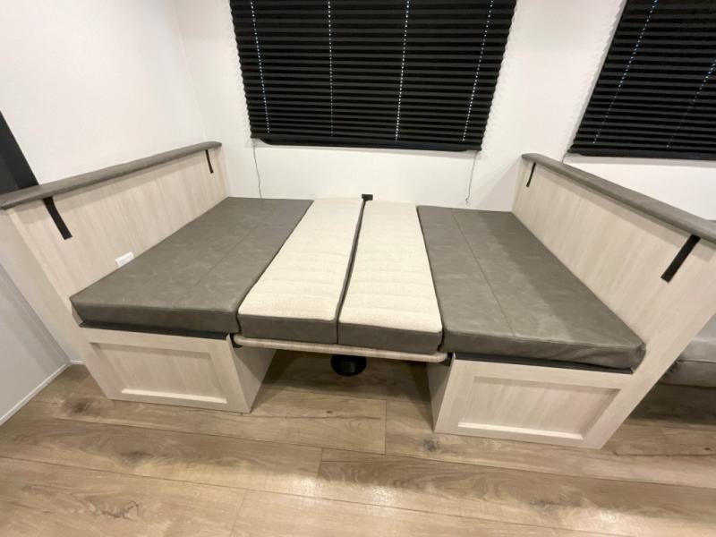 If you're looking for more space, this double axle unit features a large slide so you can walk about freely. Here, you'll find the booth dinette and sofa, which sit across from the optional TV if you want to enjoy movie nights. The full kitchen includes a stainless microwave and three burner cooktop to make meals, plus a pantry and 12V refrigerator for food storage. And an optional outside kitchen with a griddle can be added if you enjoy cooking outdoors! The kids or your guests will love the double-size bunks, and the full bath right beside the bunks includes a shower a seat for added comfort.