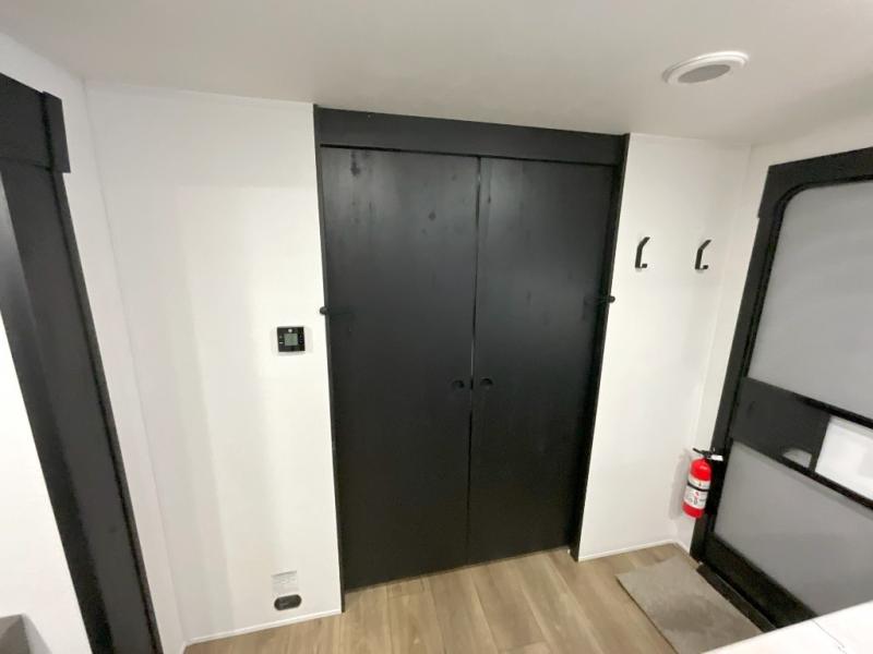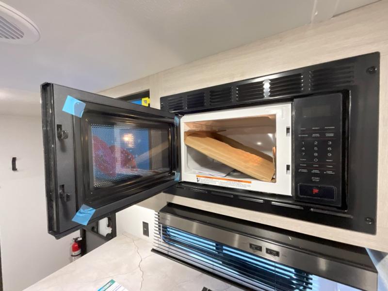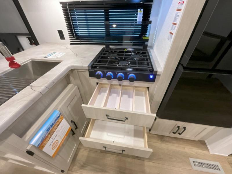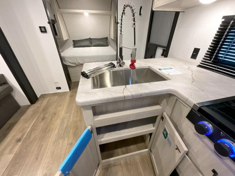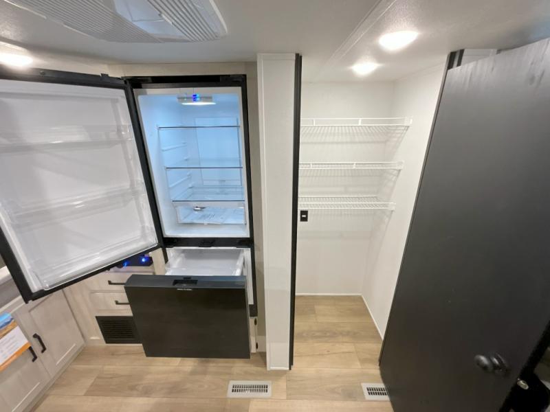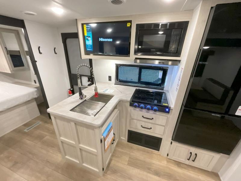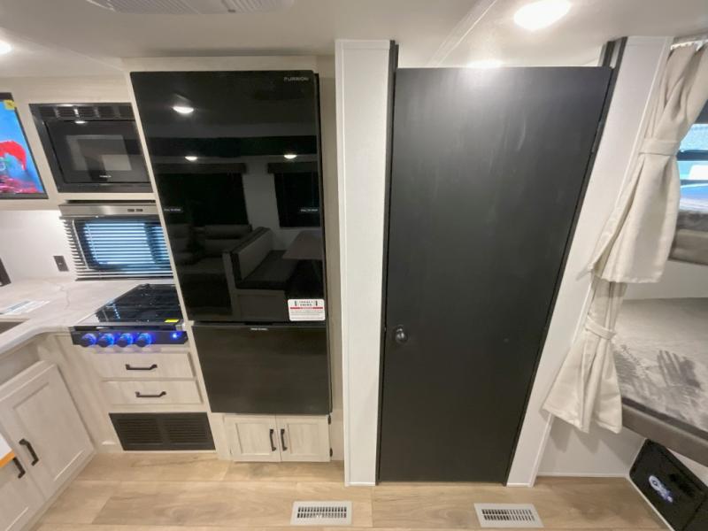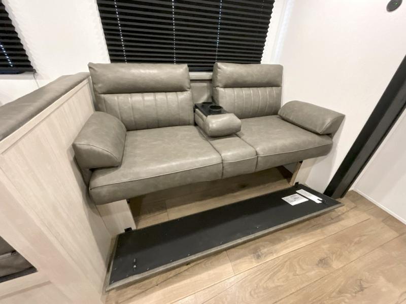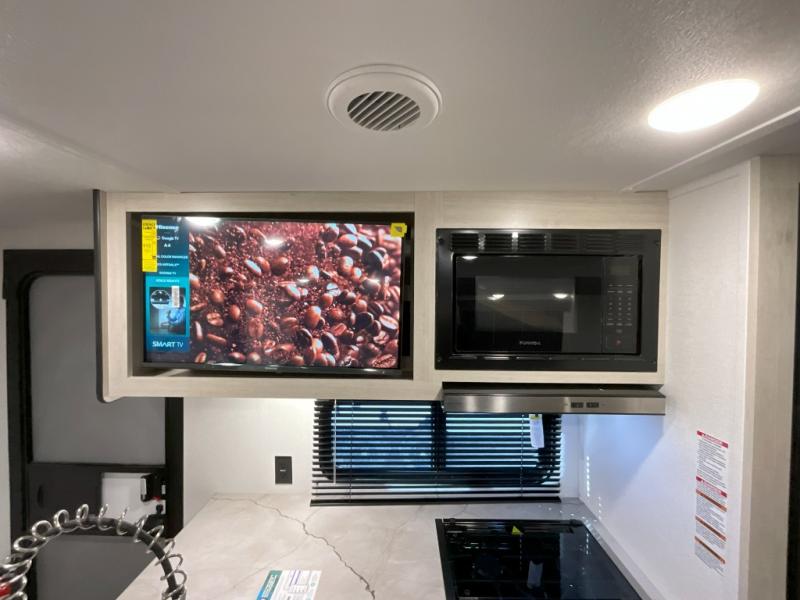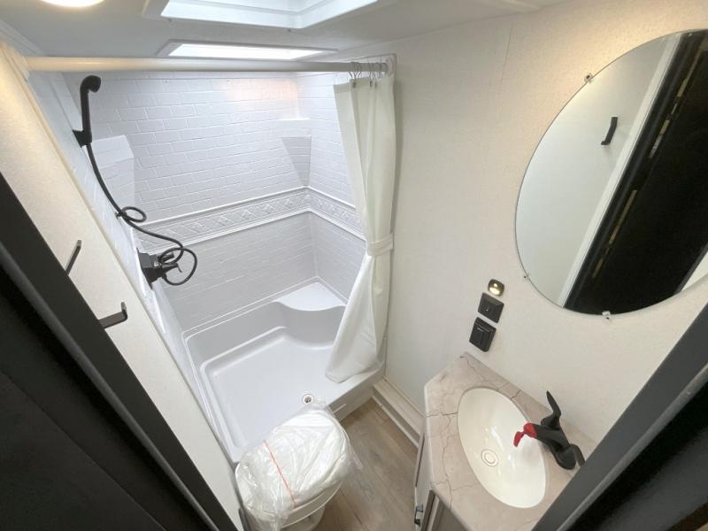If you're looking for more space, this double axle unit features a large slide so you can walk about freely. Here, you'll find the booth dinette and sofa, which sit across from the optional TV if you want to enjoy movie nights. The full kitchen includes a stainless microwave and three burner cooktop to make meals, plus a pantry and 12V refrigerator for food storage. And an optional outside kitchen with a griddle can be added if you enjoy cooking outdoors! The kids or your guests will love the double-size bunks, and the full bath right beside the bunks includes a shower a seat for added comfort.