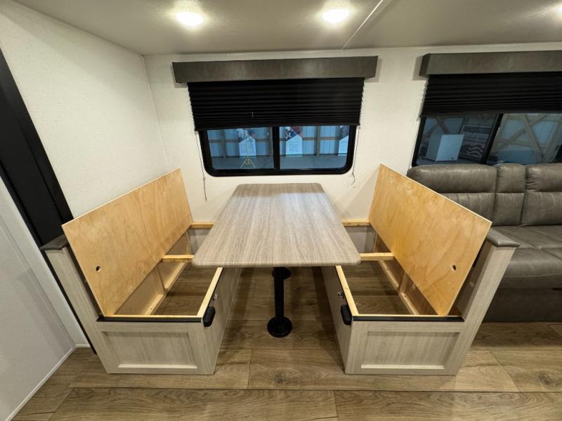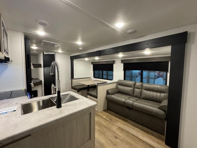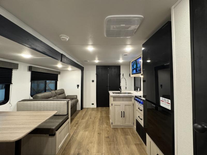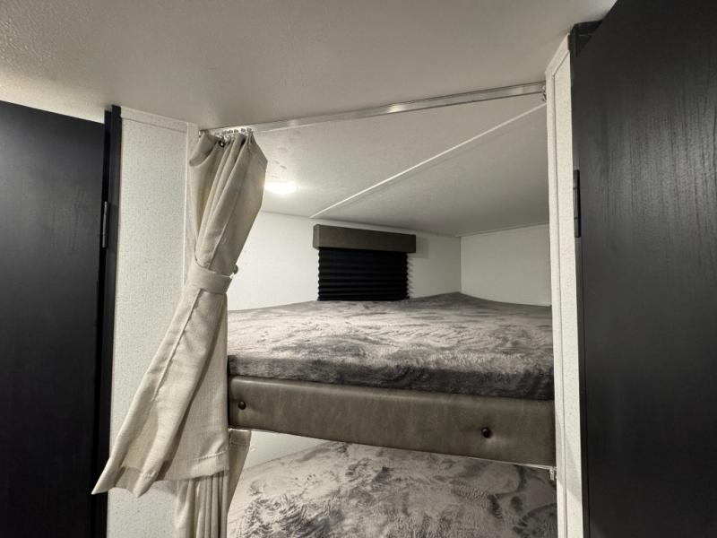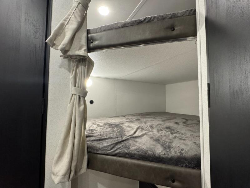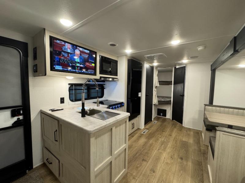 If you're looking for more space, this double axle unit features a large slide so you can walk about freely. Here, you'll find the booth dinette and sofa, which sit across from the optional TV if you want to enjoy movie nights. The full kitchen includes a stainless microwave and three burner cooktop to make meals, plus a pantry and 12V refrigerator for food storage. And an optional outside kitchen with a griddle can be added if you enjoy cooking outdoors! The kids or your guests will love the double-size bunks, and the full bath right beside the bunks includes a shower a seat for added comfort.