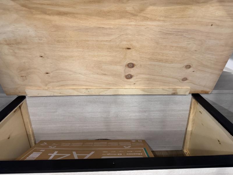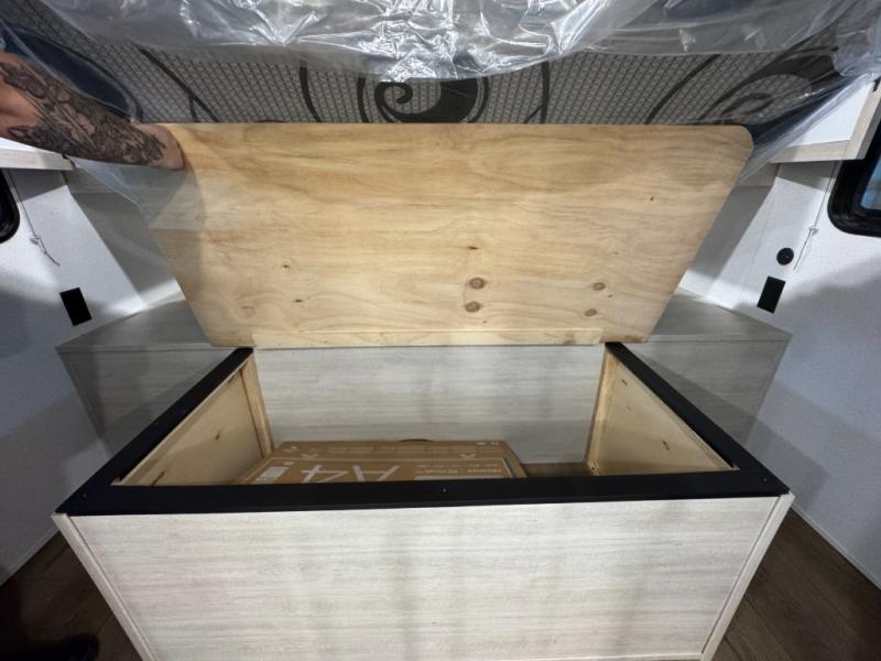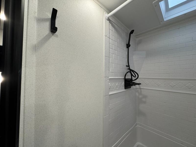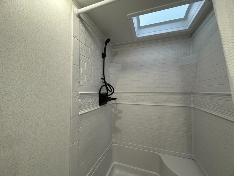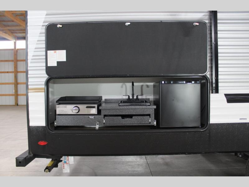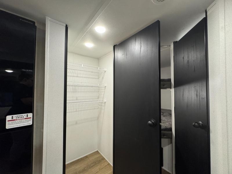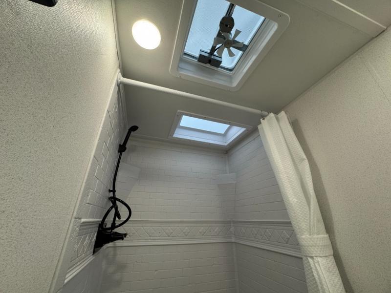 If you're looking for more space, this double axle unit features a large slide so you can walk about freely. Here, you'll find the booth dinette and sofa, which sit across from the optional TV if you want to enjoy movie nights. The full kitchen includes a stainless microwave and three burner cooktop to make meals, plus a pantry and 12V refrigerator for food storage. And an optional outside kitchen with a griddle can be added if you enjoy cooking outdoors! The kids or your guests will love the double-size bunks, and the full bath right beside the bunks includes a shower a seat for added comfort.