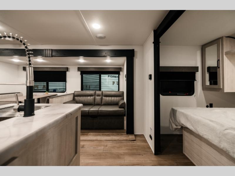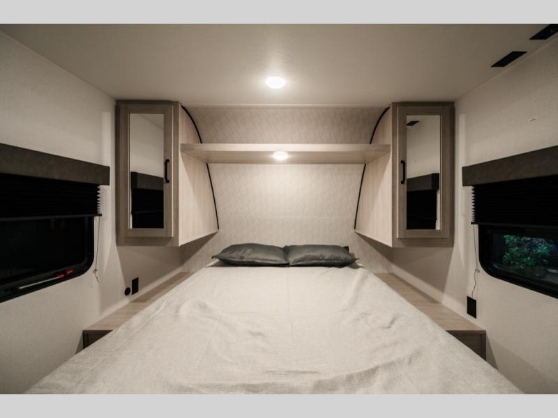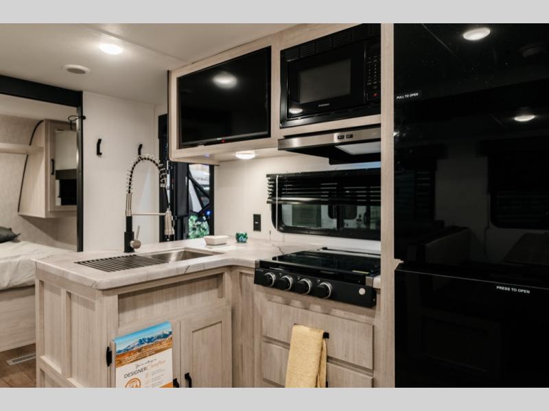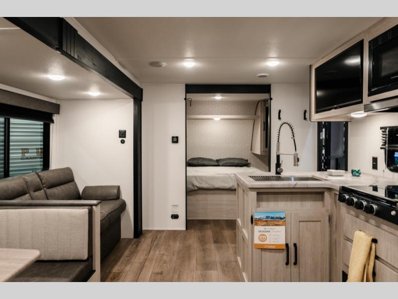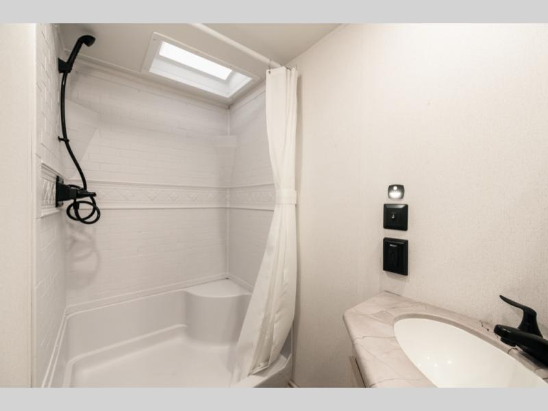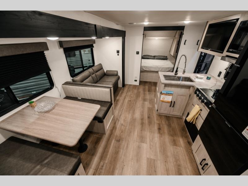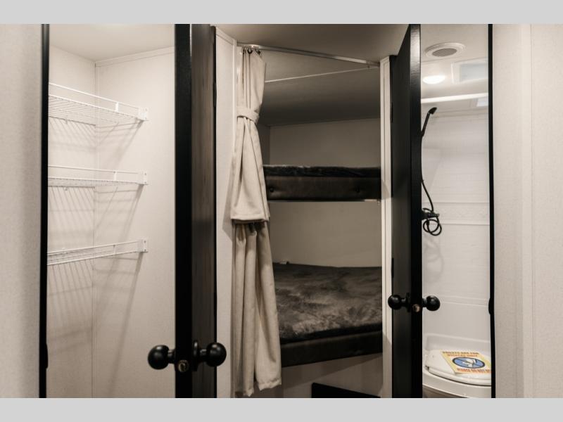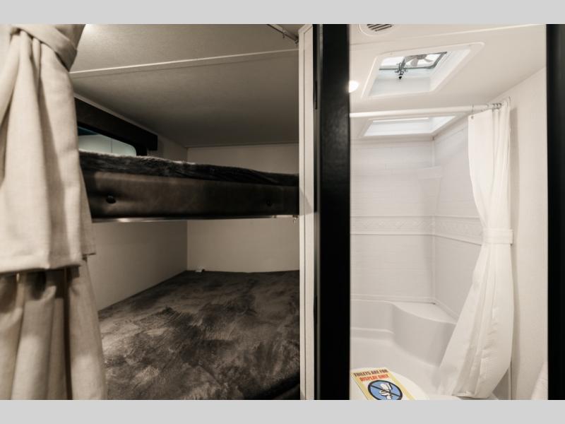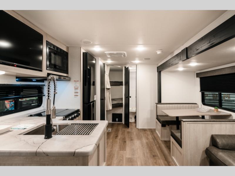 If you're looking for more space, this double axle unit features a large slide so you can walk about freely. Here, you'll find the booth dinette and sofa, which sit across from the optional TV if you want to enjoy movie nights. The full kitchen includes a stainless microwave and three burner cooktop to make meals, plus a pantry and 12V refrigerator for food storage. And an optional outside kitchen with a griddle can be added if you enjoy cooking outdoors! The kids or your guests will love the double-size bunks, and the full bath right beside the bunks includes a shower a seat for added comfort.