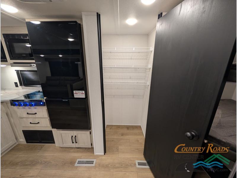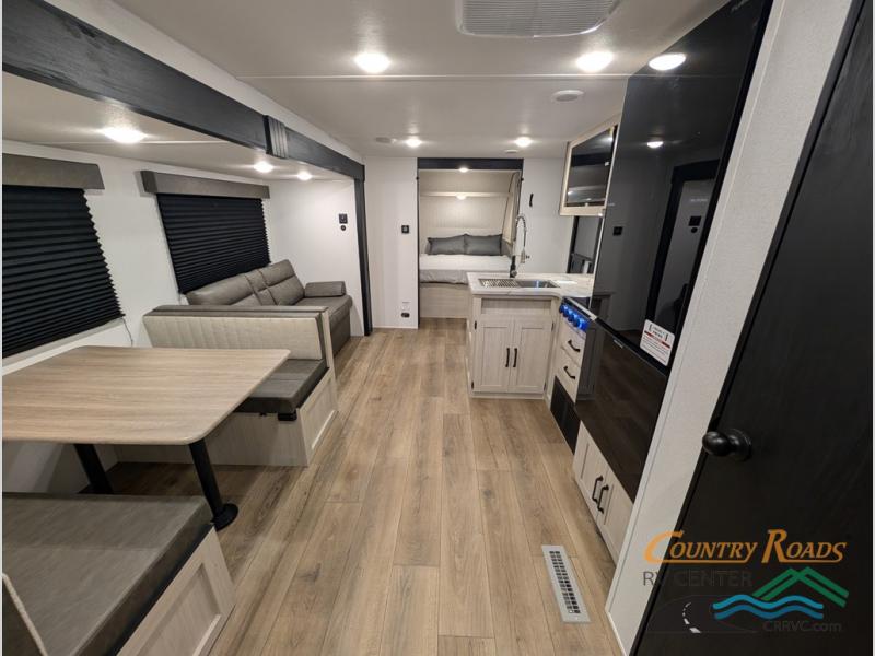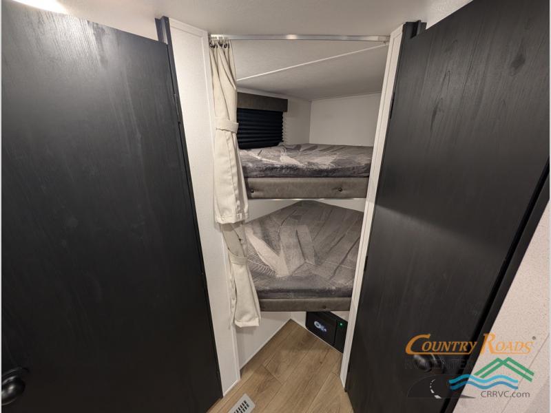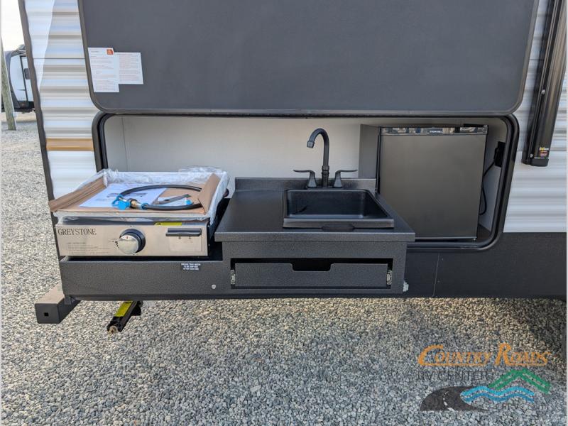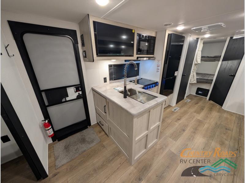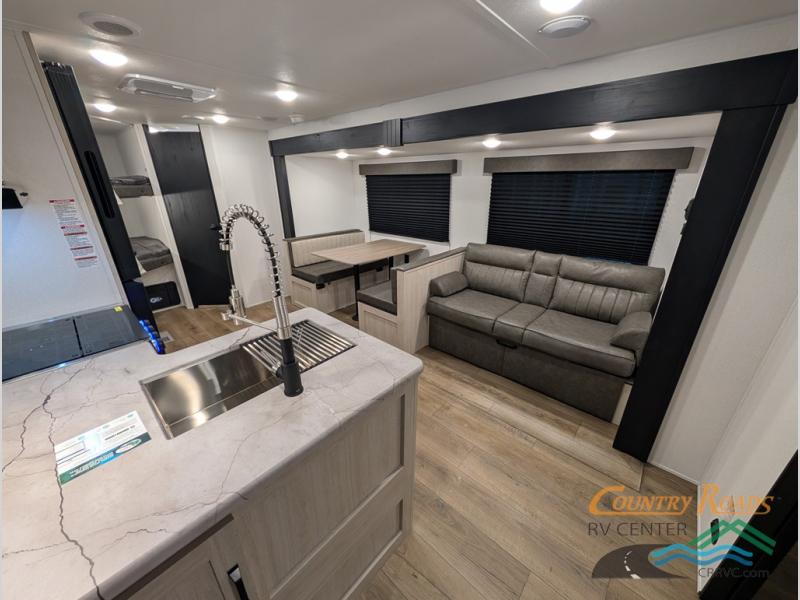 If you're looking for more space, this double axle unit features a large slide so you can walk about freely. Here, you'll find the booth dinette and sofa, which sit across from the optional TV if you want to enjoy movie nights. The full kitchen includes a stainless microwave and three burner cooktop to make meals, plus a pantry and 12V refrigerator for food storage. And an optional outside kitchen with a griddle can be added if you enjoy cooking outdoors! The kids or your guests will love the double-size bunks, and the full bath right beside the bunks includes a shower a seat for added comfort.