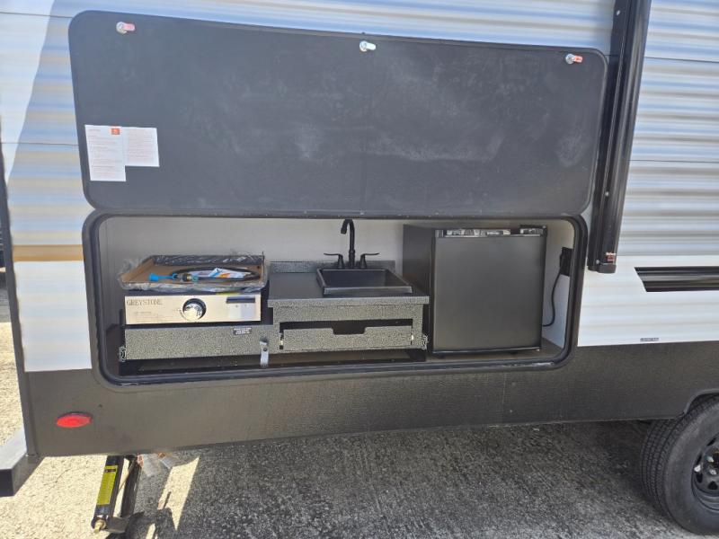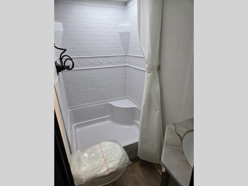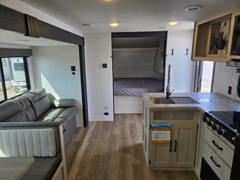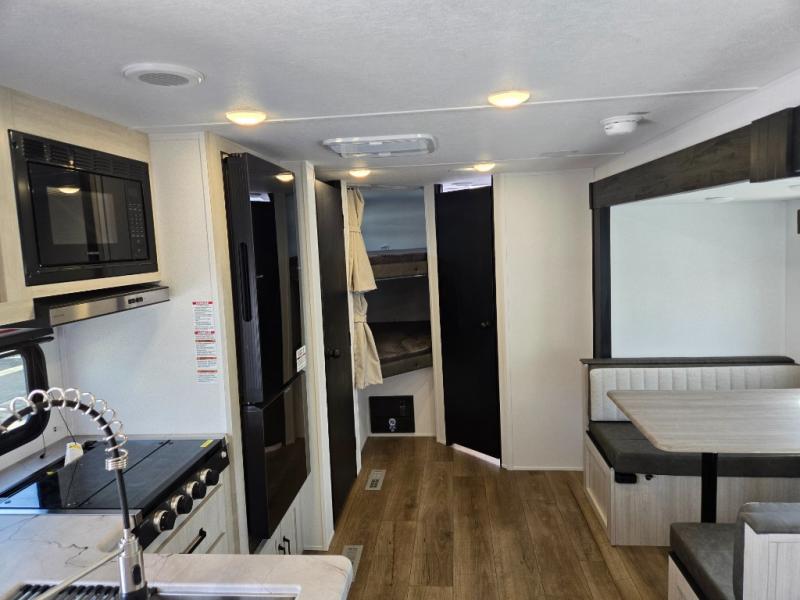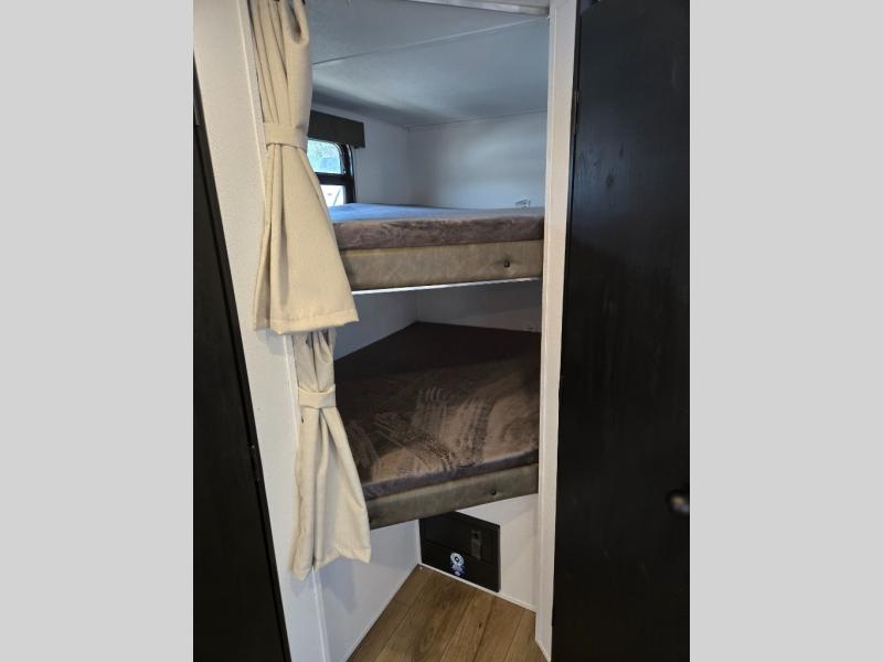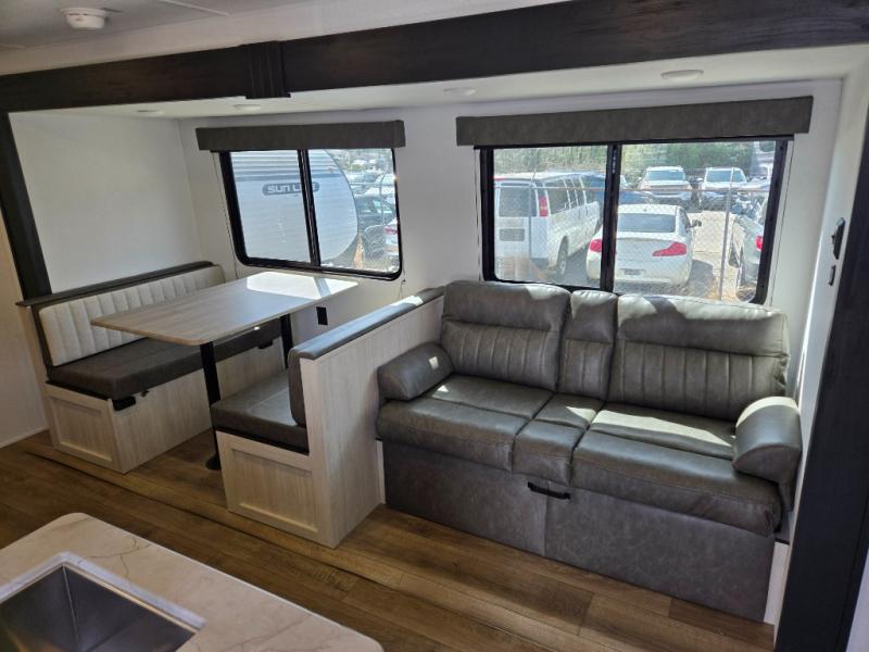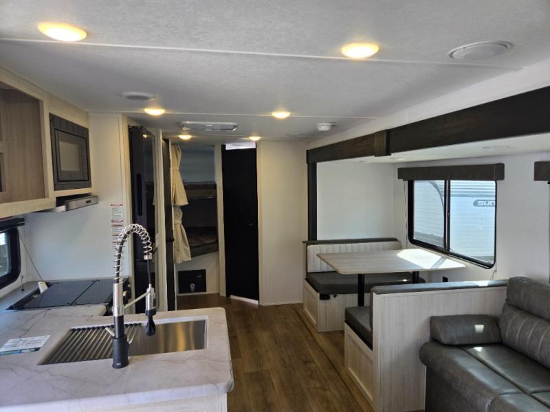If you're looking for more space, this double axle unit features a large slide so you can walk about freely. Here, you'll find the booth dinette and sofa, which sit across from the optional TV if you want to enjoy movie nights. The full kitchen includes a stainless microwave and three burner cooktop to make meals, plus a pantry and 12V refrigerator for food storage. And an optional outside kitchen with a griddle can be added if you enjoy cooking outdoors! The kids or your guests will love the double-size bunks, and the full bath right beside the bunks includes a shower a seat for added comfort.