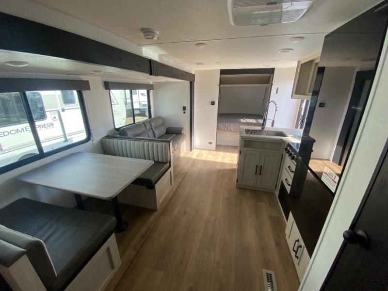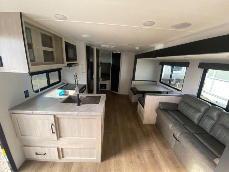 If you're looking for more space, this double axle unit features a large slide so you can walk about freely. Here, you'll find the booth dinette and sofa, which sit across from the optional TV if you want to enjoy movie nights. The full kitchen includes a stainless microwave and three burner cooktop to make meals, plus a pantry and 12V refrigerator for food storage. And an optional outside kitchen with a griddle can be added if you enjoy cooking outdoors! The kids or your guests will love the double-size bunks, and the full bath right beside the bunks includes a shower a seat for added comfort.