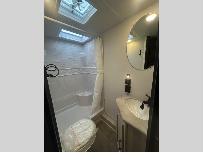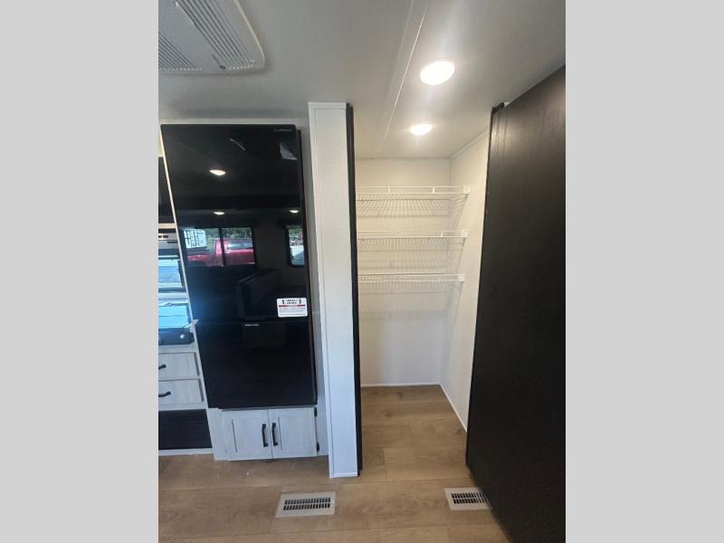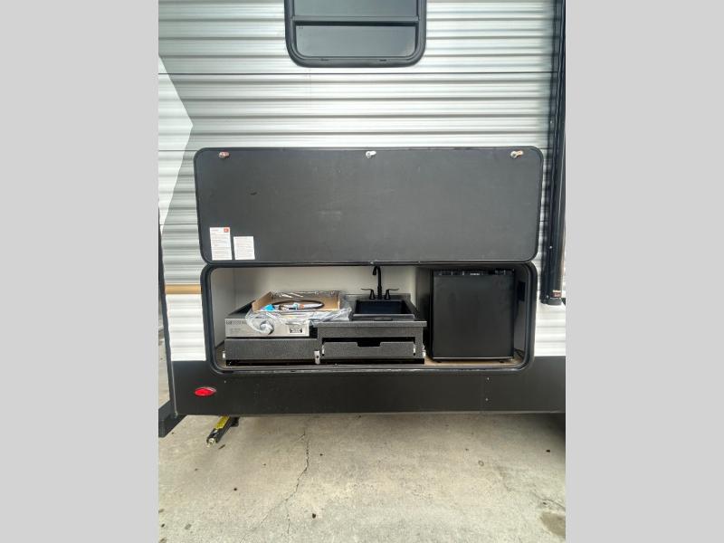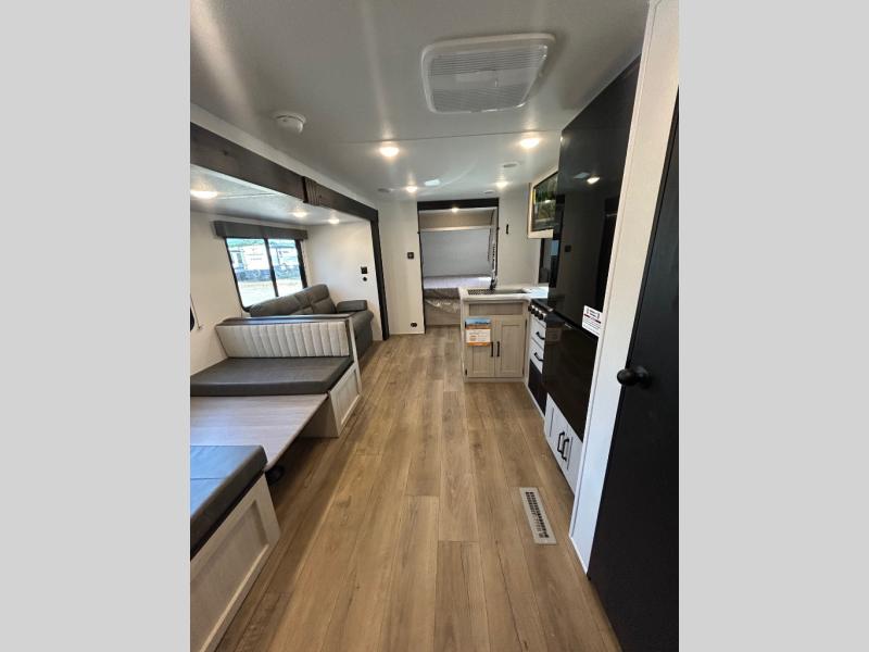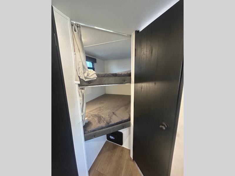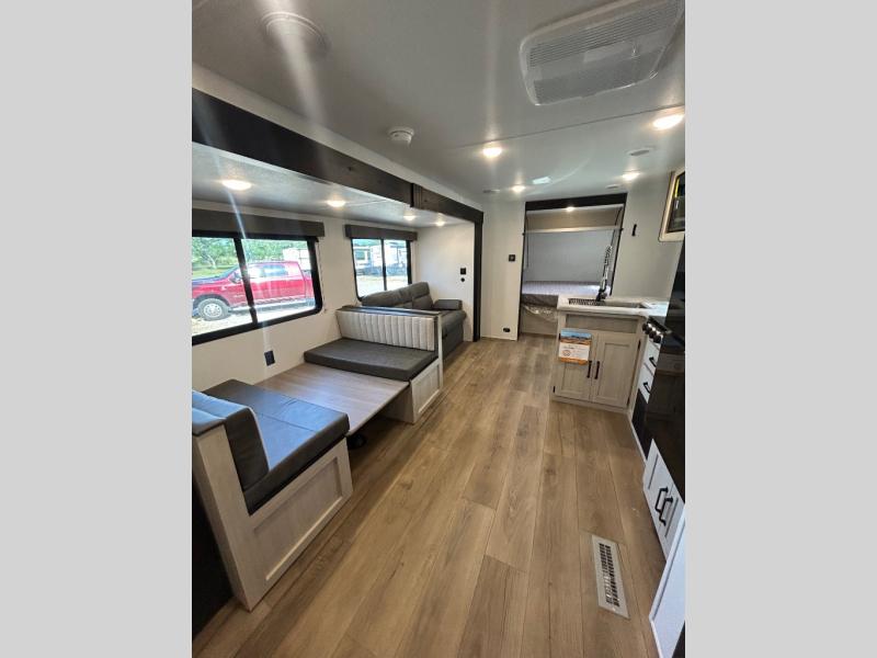If you're looking for more space, this double axle unit features a large slide so you can walk about freely. Here, you'll find the booth dinette and sofa, which sit across from the optional TV if you want to enjoy movie nights. The full kitchen includes a stainless microwave and three burner cooktop to make meals, plus a pantry and 12V refrigerator for food storage. And an optional outside kitchen with a griddle can be added if you enjoy cooking outdoors! The kids or your guests will love the double-size bunks, and the full bath right beside the bunks includes a shower a seat for added comfort.