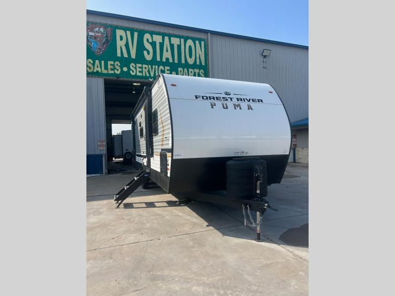 The Puma Camping Edition by Palomino offer an affordable travel trailer for rookie campers or seasoned RVers! They are built with 5/8" tongue and groove plywood flooring and a front diamond plate for added protection. There are also exterior clamp style door latches, back up camera prep, and 20 lb. LP bottles. Head inside to find Thermofoil countertops with a smooth drop edge, bedroom USB ports and outlets, and a GE appliance and kitchen package.