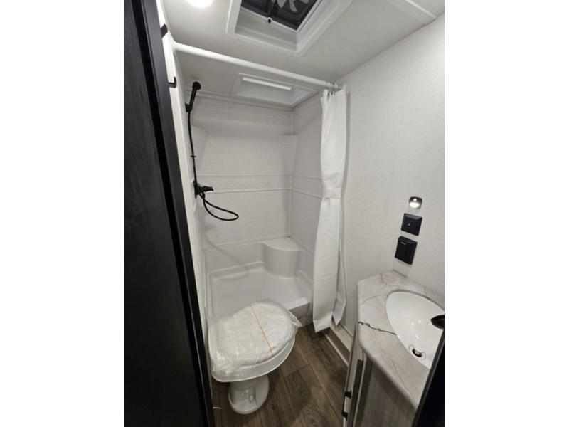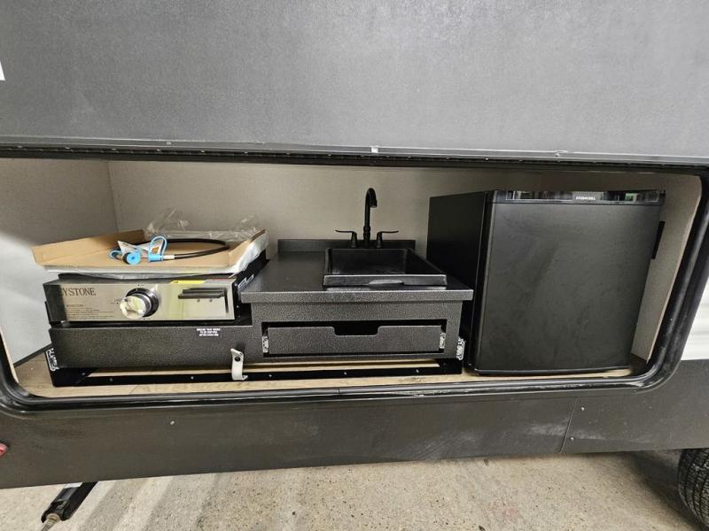 If you're looking for more space, this double axle unit features a large slide so you can walk about freely. Here, you'll find the booth dinette and sofa, which sit across from the optional TV if you want to enjoy movie nights. The full kitchen includes a stainless microwave and three burner cooktop to make meals, plus a pantry and 12V refrigerator for food storage. And an optional outside kitchen with a griddle can be added if you enjoy cooking outdoors! The kids or your guests will love the double-size bunks, and the full bath right beside the bunks includes a shower a seat for added comfort.