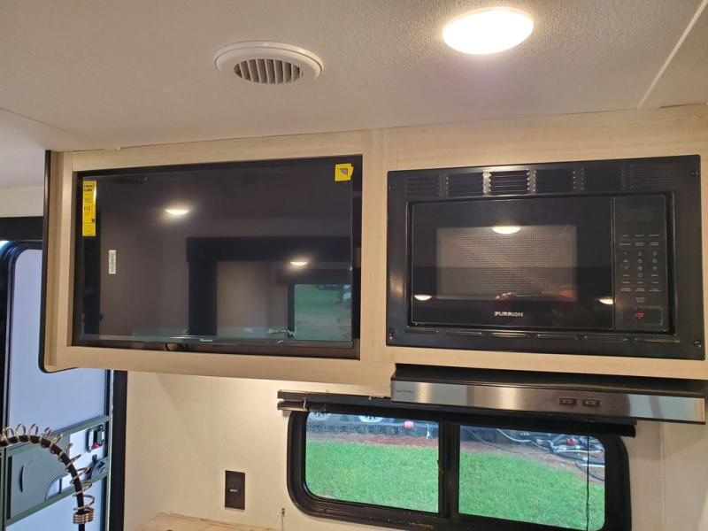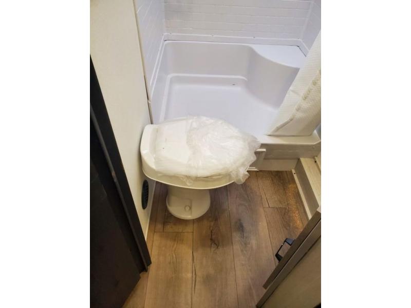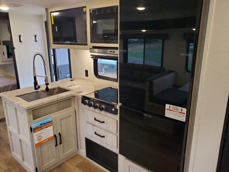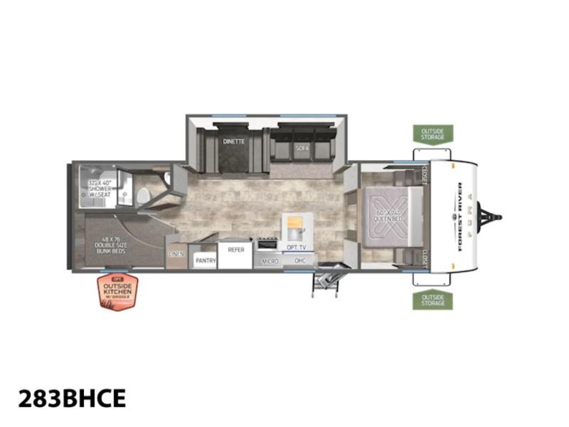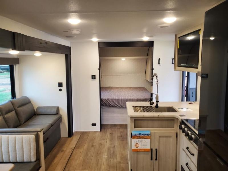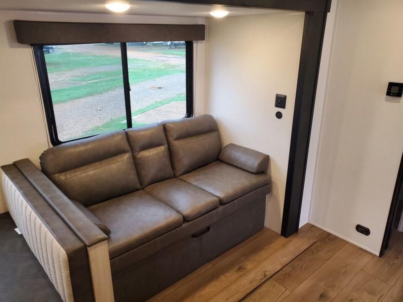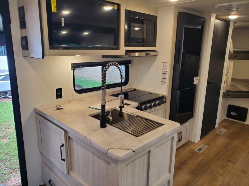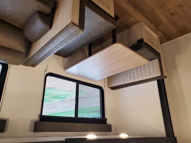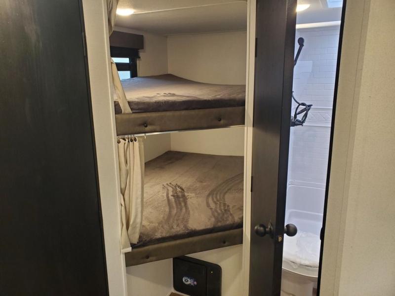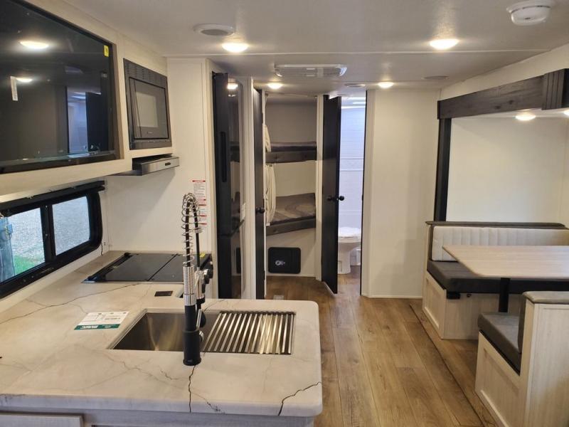 If you're looking for more space, this double axle unit features a large slide so you can walk about freely. Here, you'll find the booth dinette and sofa, which sit across from the optional TV if you want to enjoy movie nights. The full kitchen includes a stainless microwave and three burner cooktop to make meals, plus a pantry and 12V refrigerator for food storage. And an optional outside kitchen with a griddle can be added if you enjoy cooking outdoors! The kids or your guests will love the double-size bunks, and the full bath right beside the bunks includes a shower a seat for added comfort.