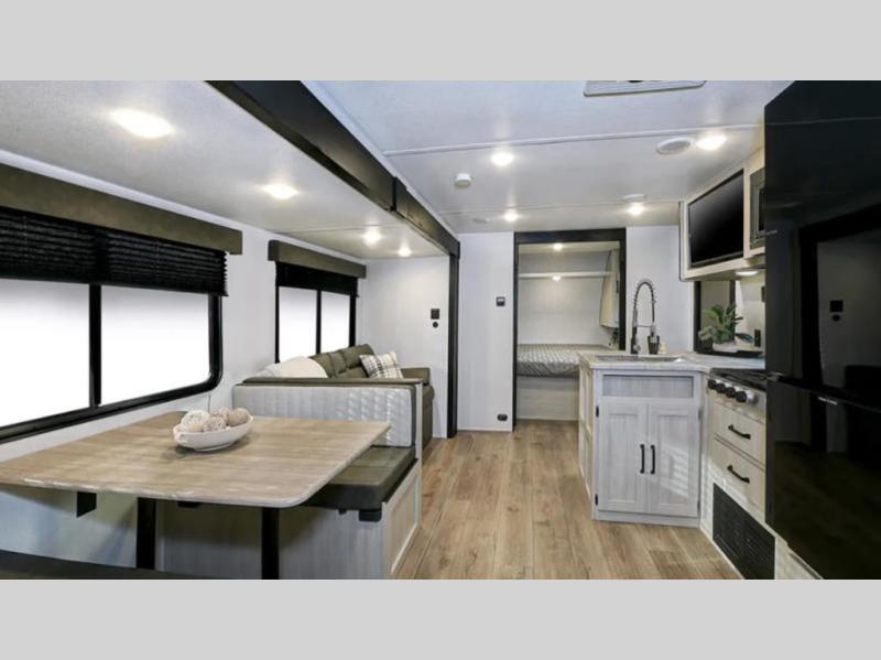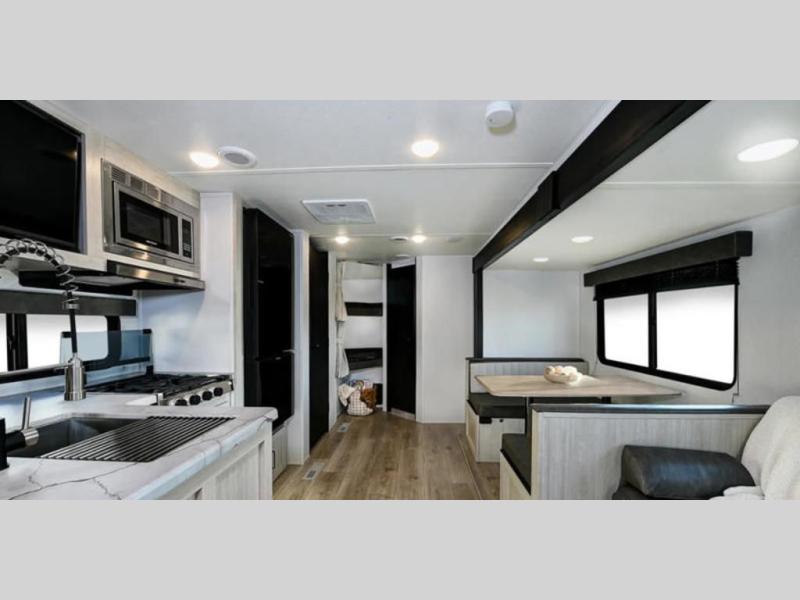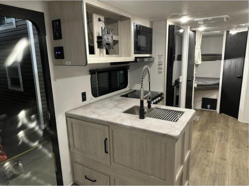 If you're looking for more space, this double axle unit features a large slide so you can walk about freely. Here, you'll find the booth dinette and sofa, which sit across from the optional TV if you want to enjoy movie nights. The full kitchen includes a stainless microwave and three burner cooktop to make meals, plus a pantry and 12V refrigerator for food storage. And an optional outside kitchen with a griddle can be added if you enjoy cooking outdoors! The kids or your guests will love the double-size bunks, and the full bath right beside the bunks includes a shower a seat for added comfort.